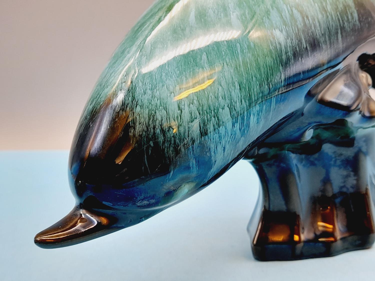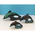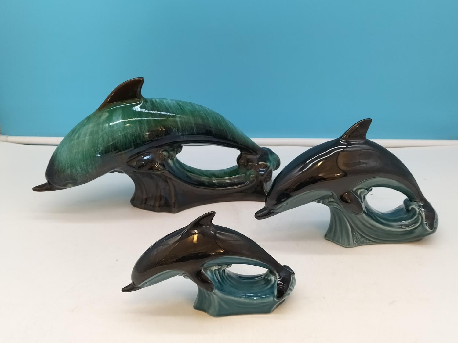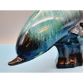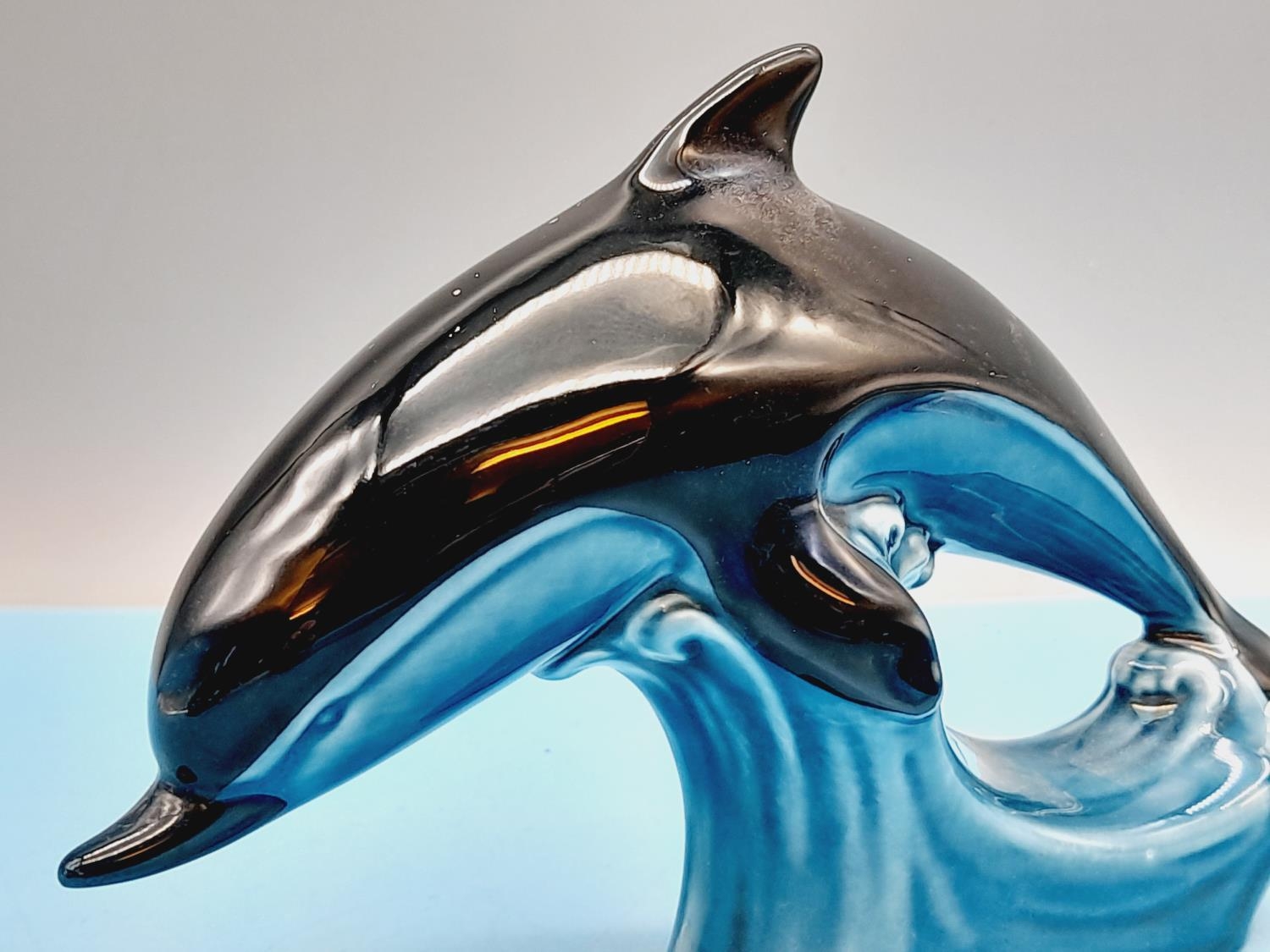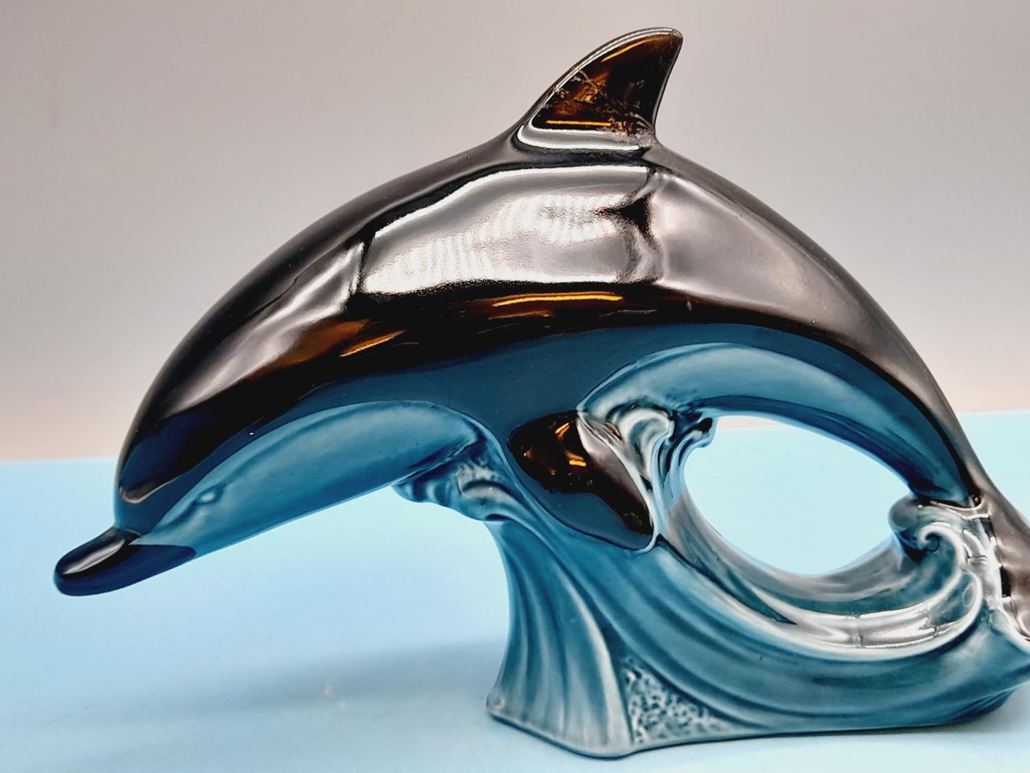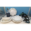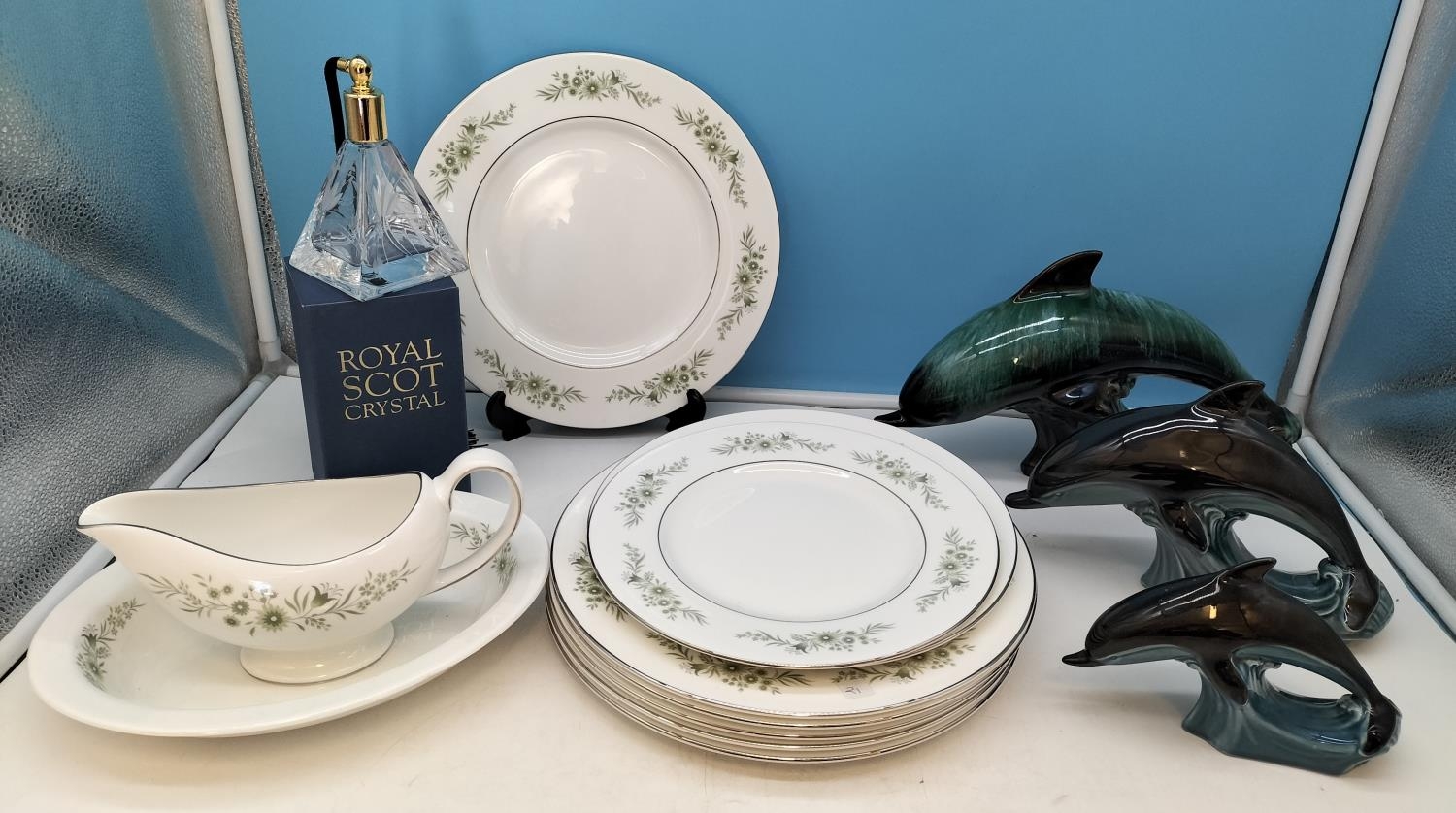 Boxed Royal Scot Perfume Atomiser, Wedgwood 'Westbury' Pattern 27cm Dinner Plates (6), Serving Dish, etc plus Poole Pottery Dolphin Figures (2) 1 A/F to Fin and a Blue Mountain Dolphin Figure. Largest 18cm High x 32cm.
