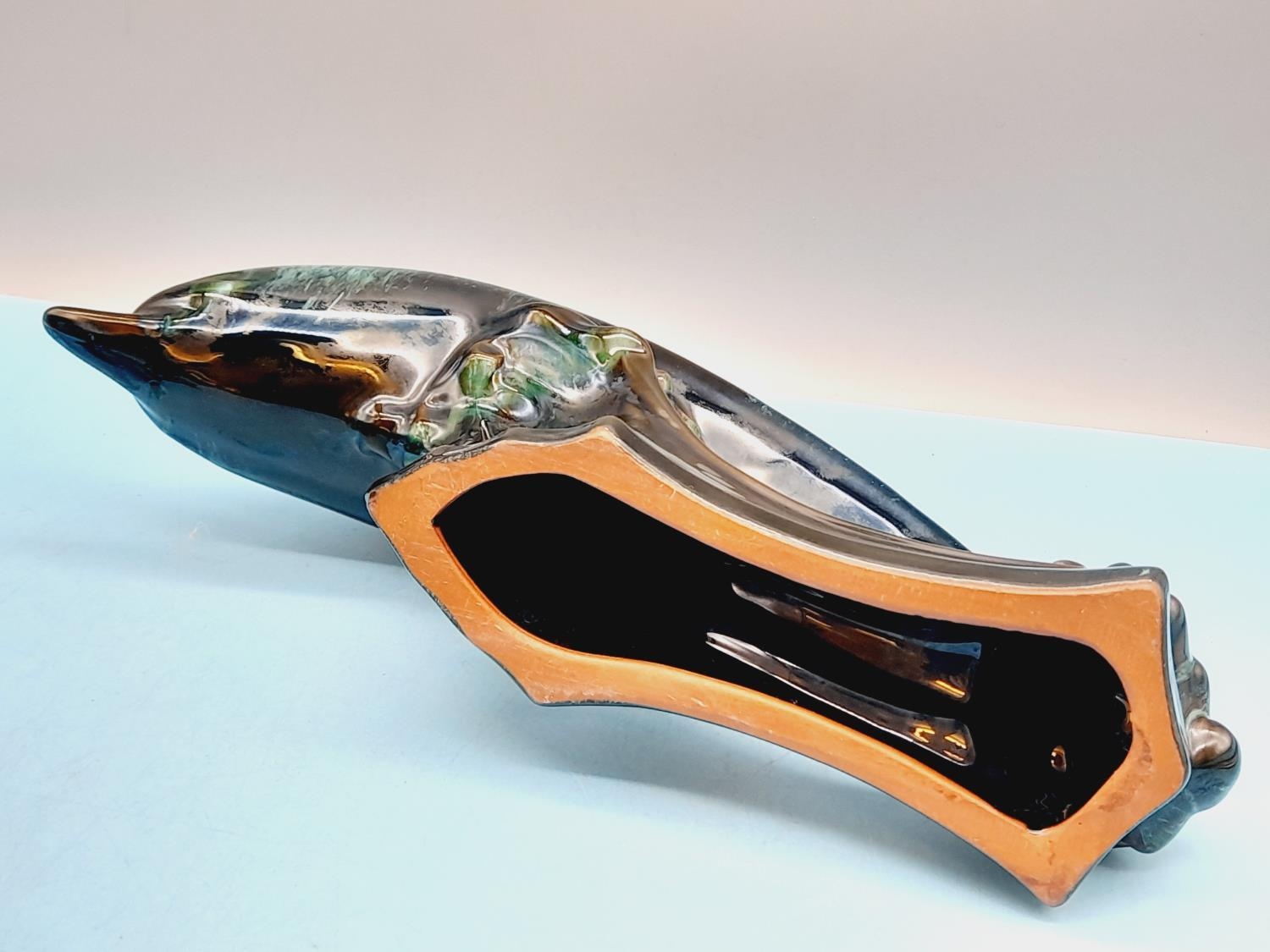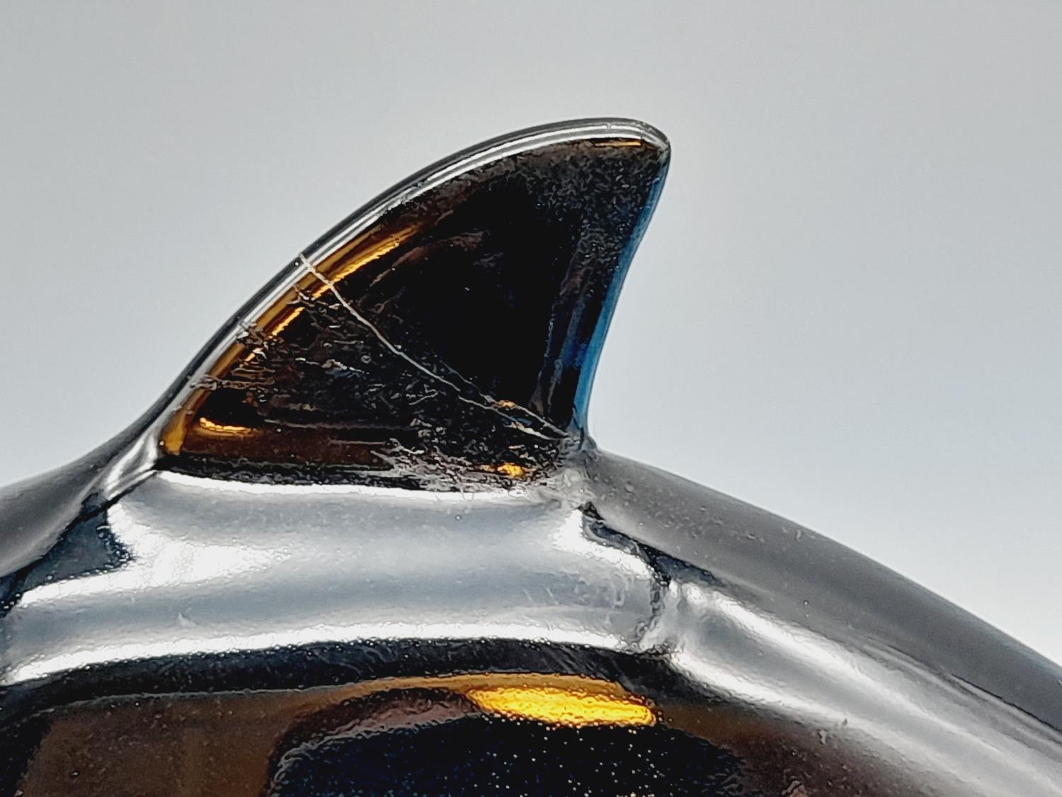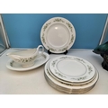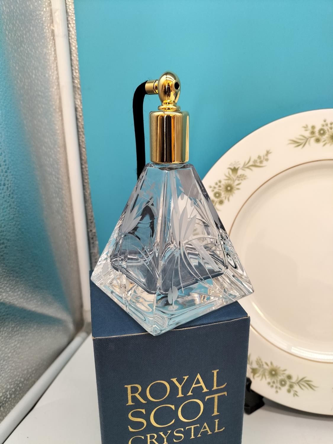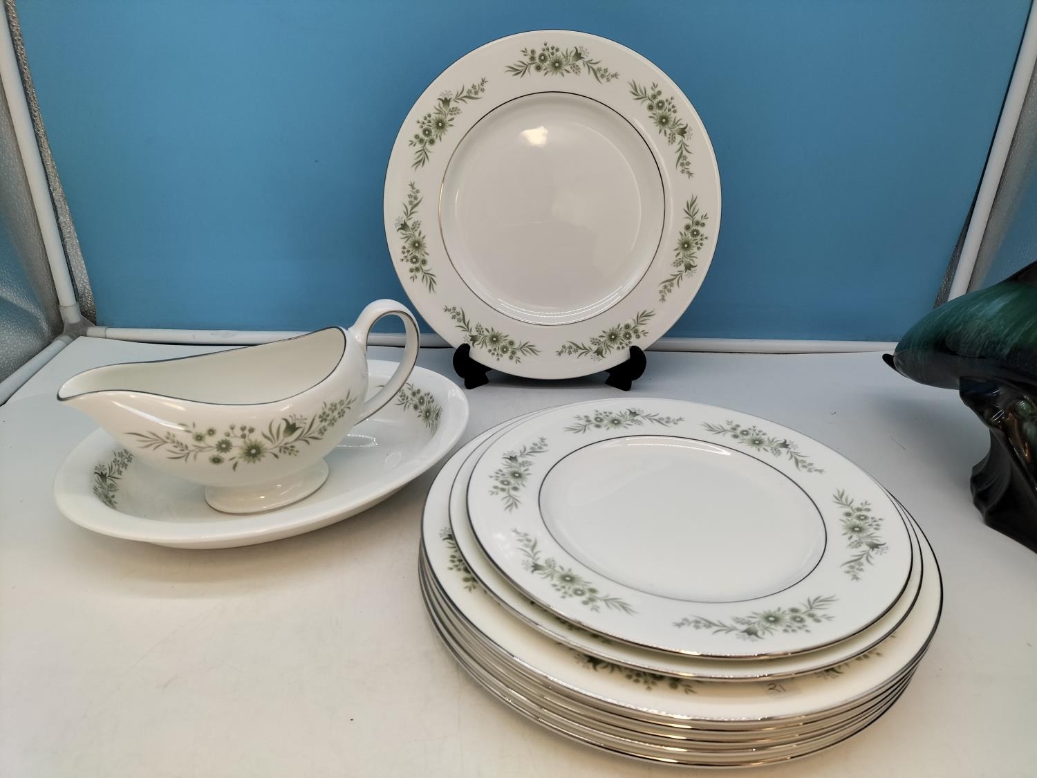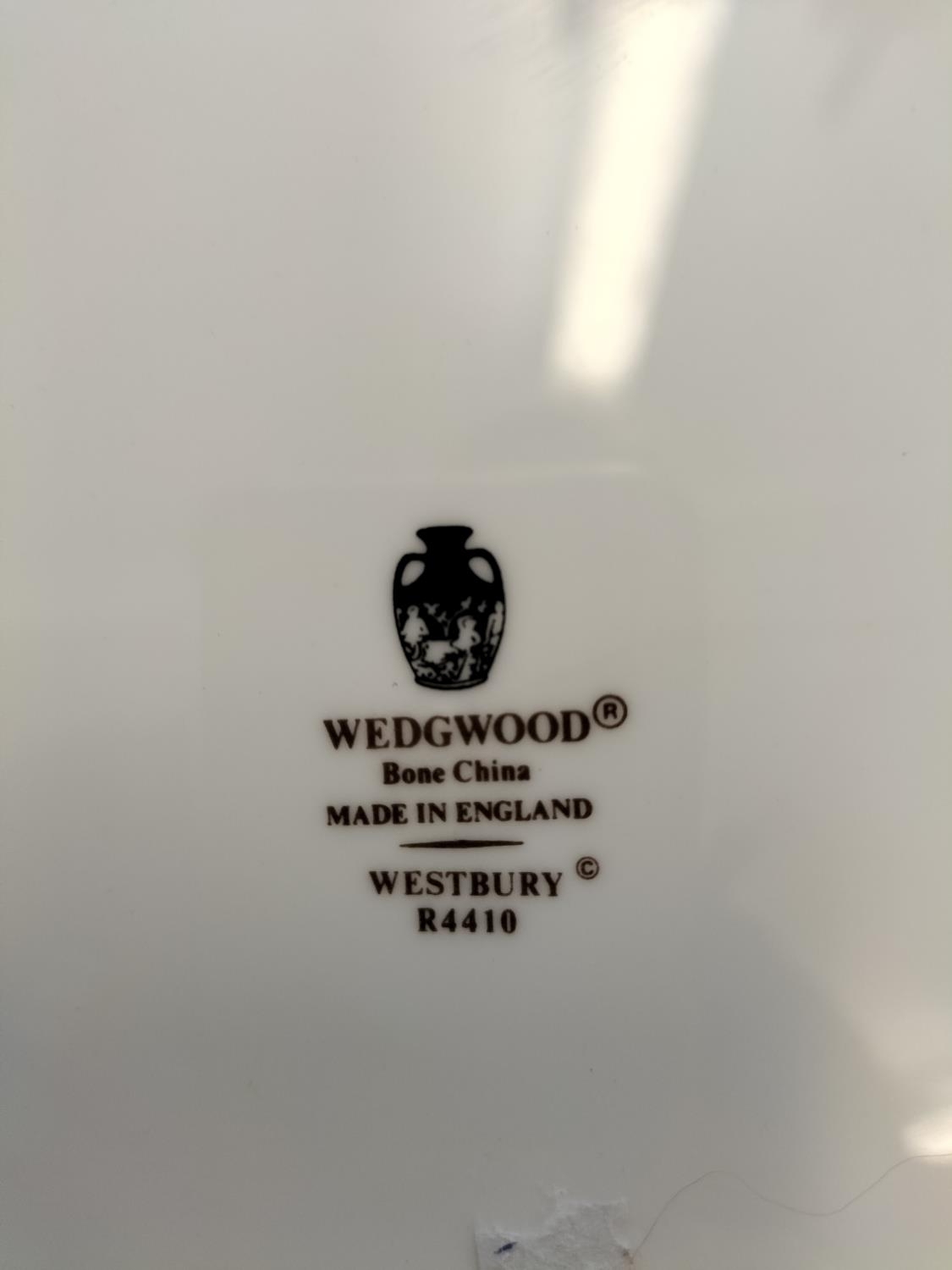 Boxed Royal Scot Perfume Atomiser, Wedgwood 'Westbury' Pattern 27cm Dinner Plates (6), Serving Dish, etc plus Poole Pottery Dolphin Figures (2) 1 A/F to Fin and a Blue Mountain Dolphin Figure. Largest 18cm High x 32cm.