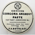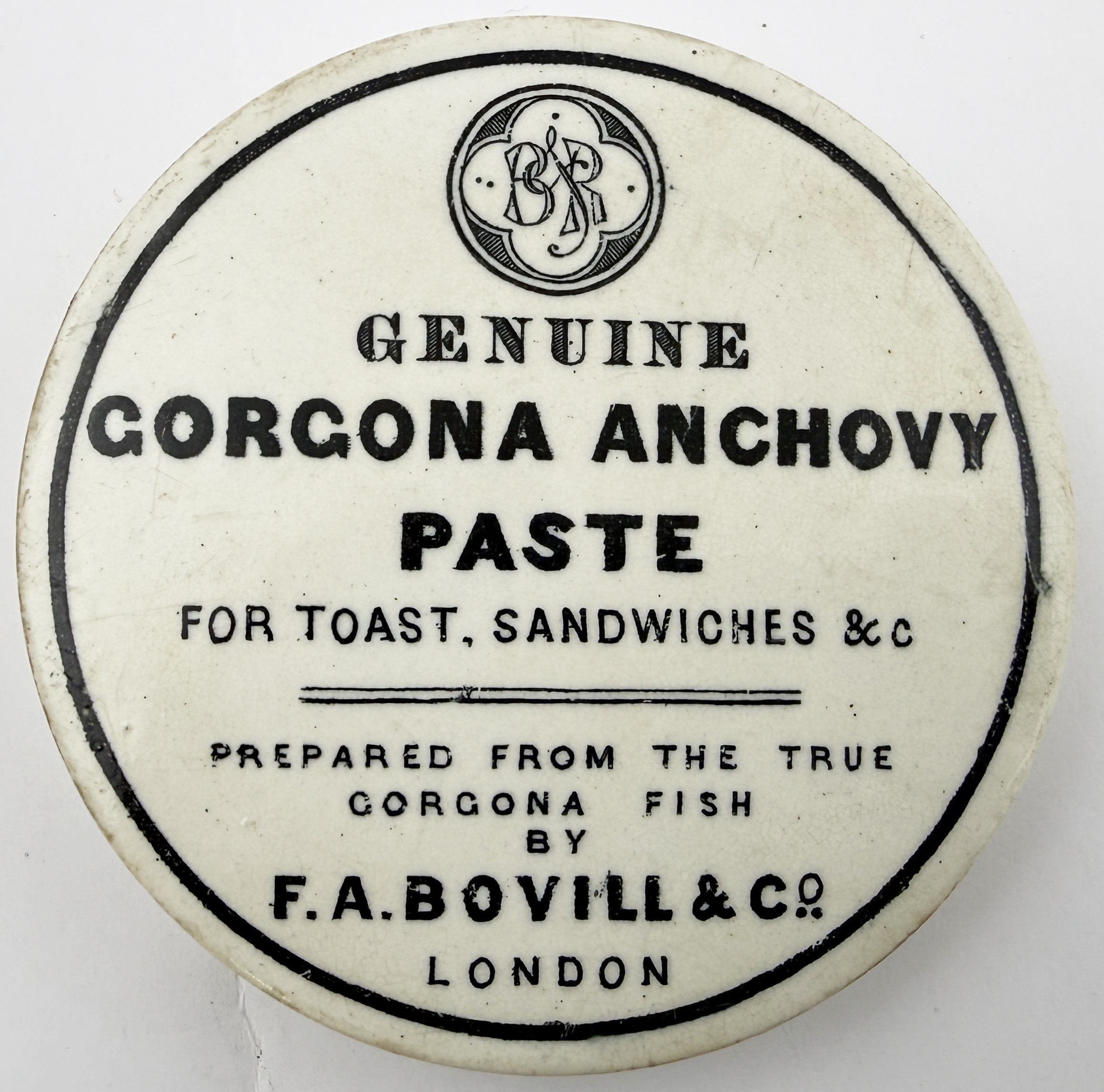 LONDON ANCHOVY PASTE POT LID. 3.5ins. Rare lid for Gorgona Anchovy Paste from F A Bovill & Co. of London. Monogram t.m. above text. Single line border. Flakes to flange foot, otherwise good.