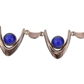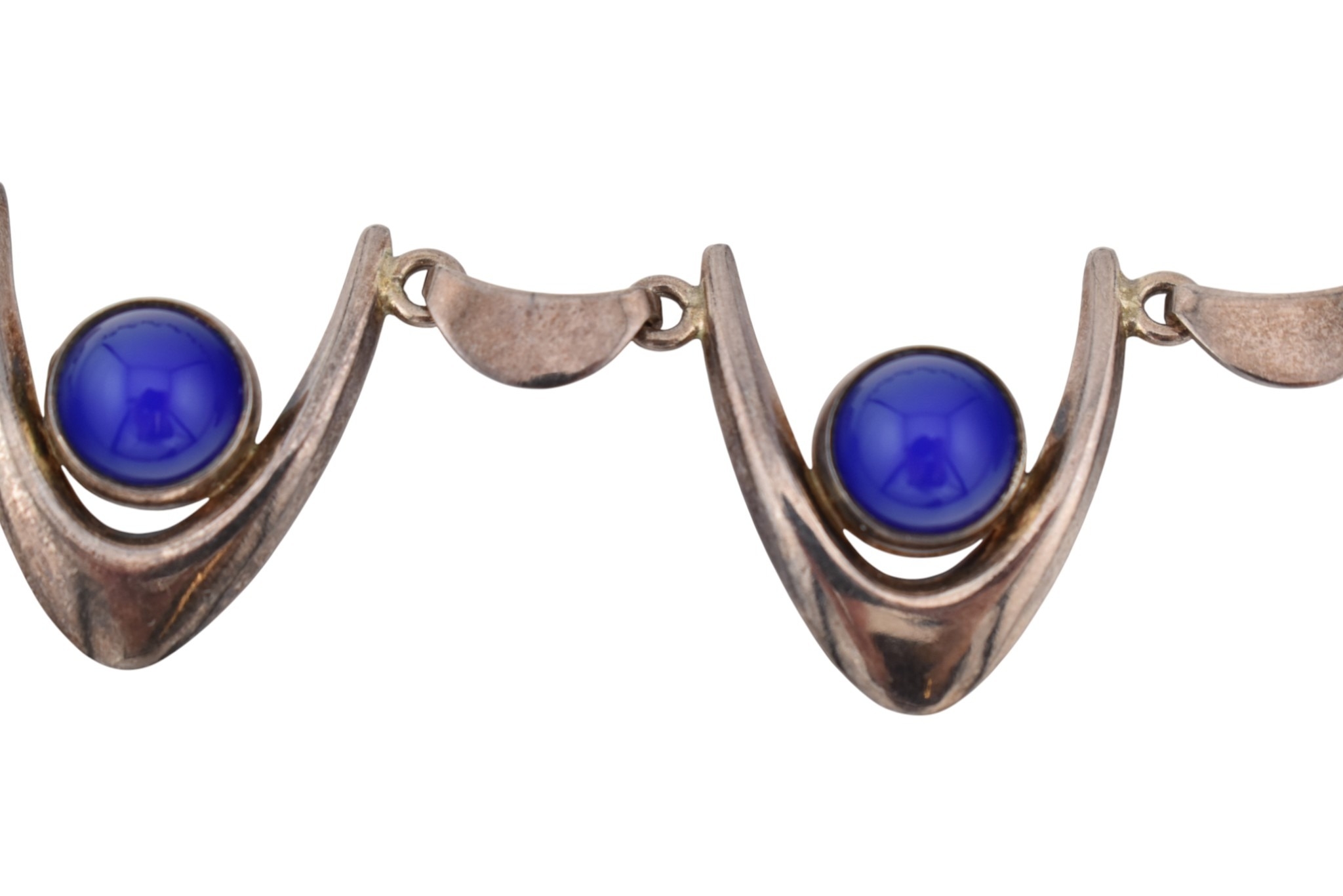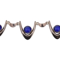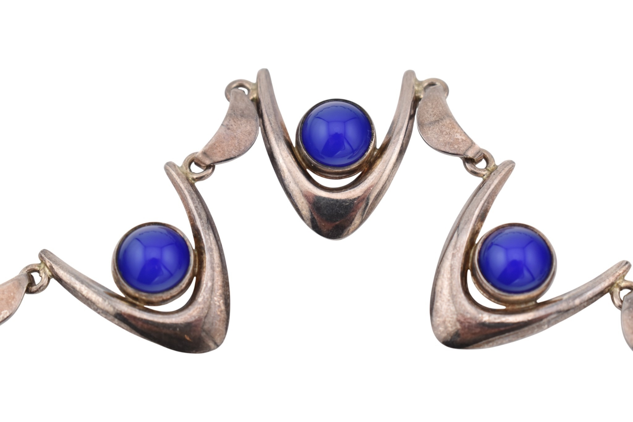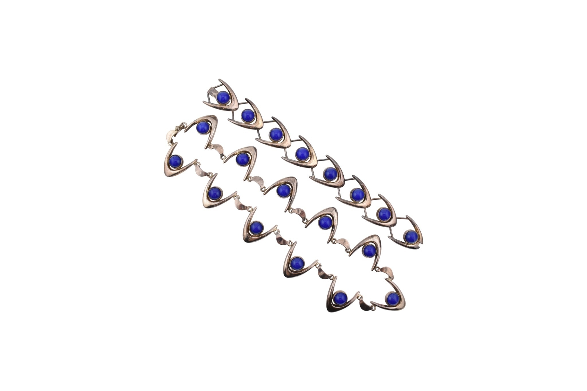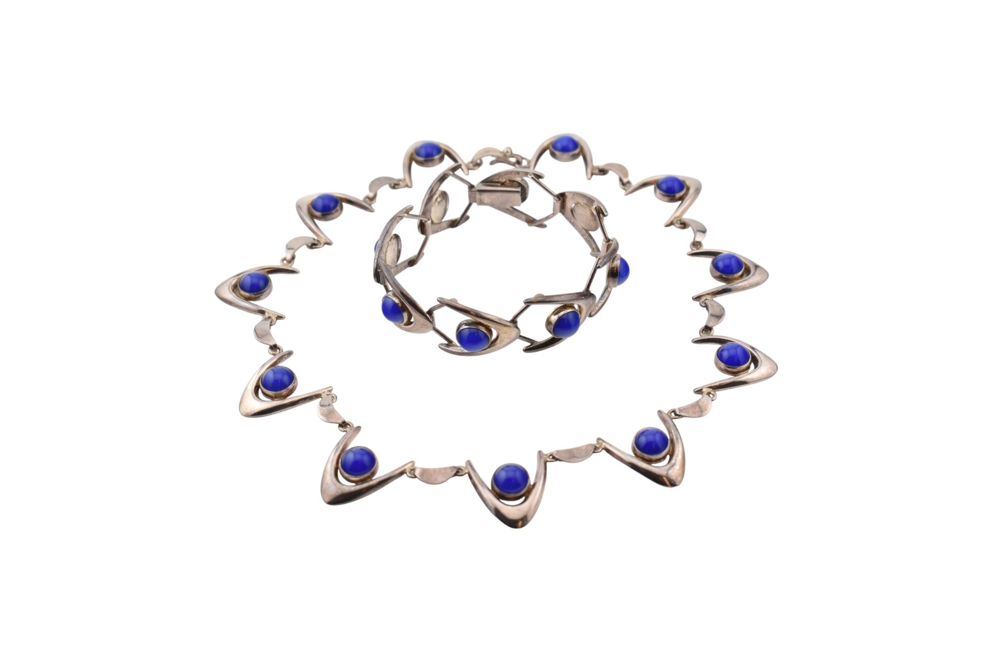 Arne Johansen - A 1970s Danish modernist 925 sterling silver necklace and bracelet set. The necklace and bracelet in a wishbone design set with blue cabochons, likely agate. Both signed AJ Denmark 925s together with import hallmarks for London 1975. Total weight 93g. Measures 38cm, bracelet 18.5cm