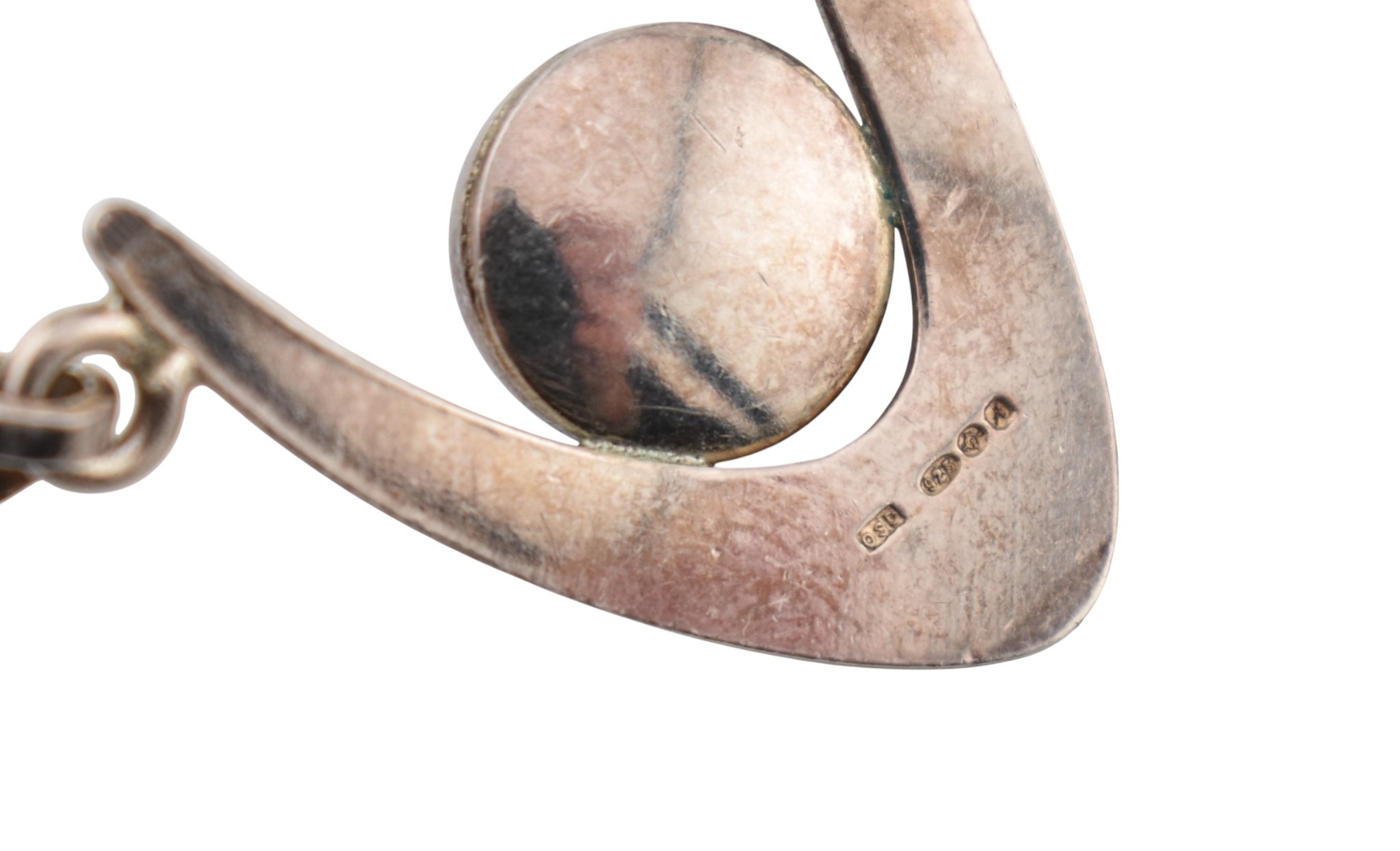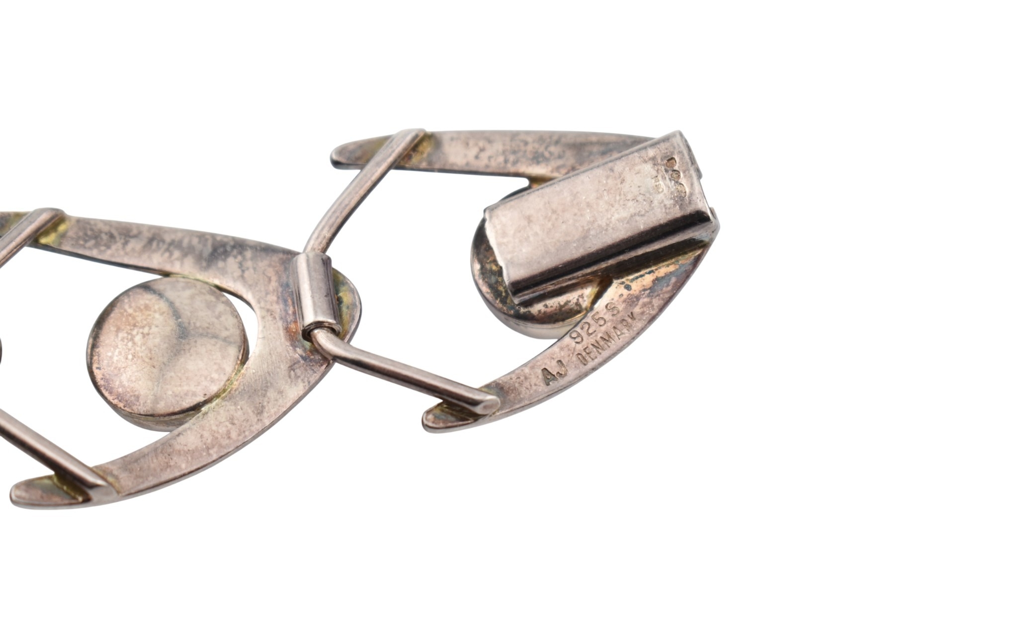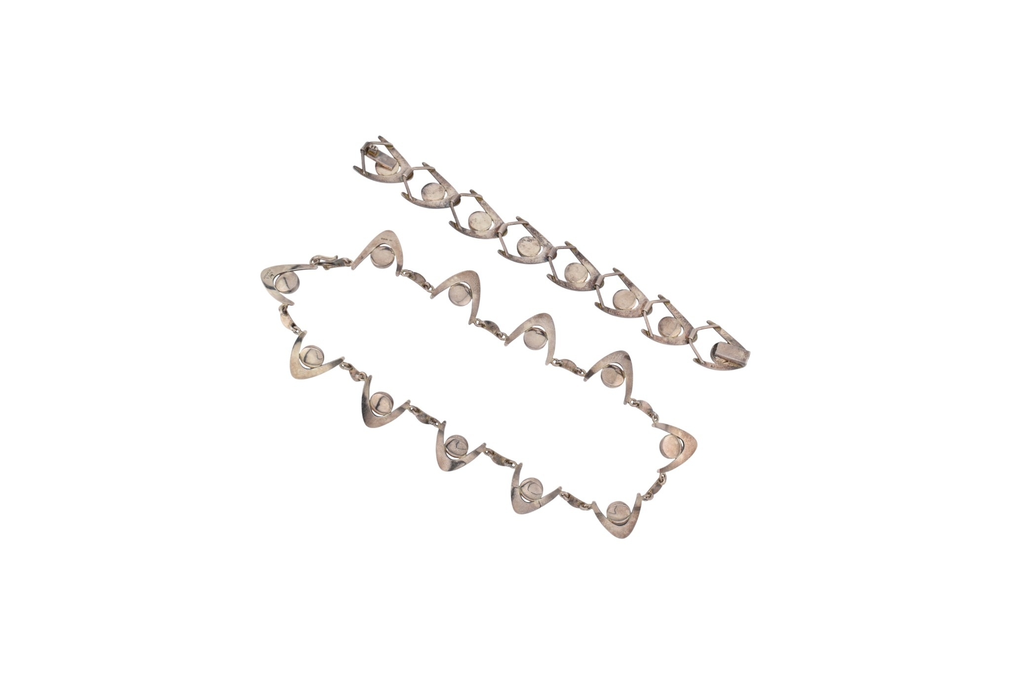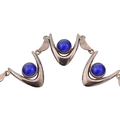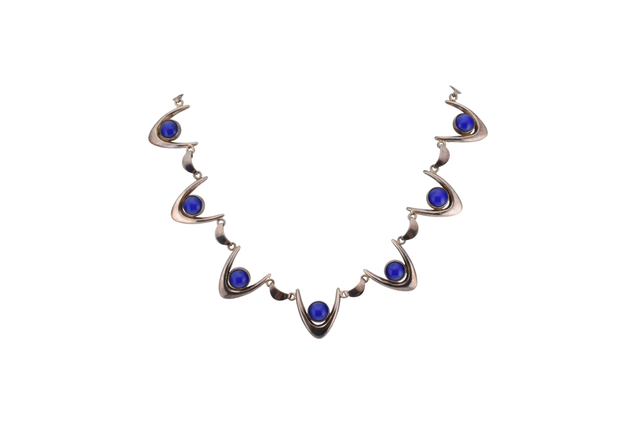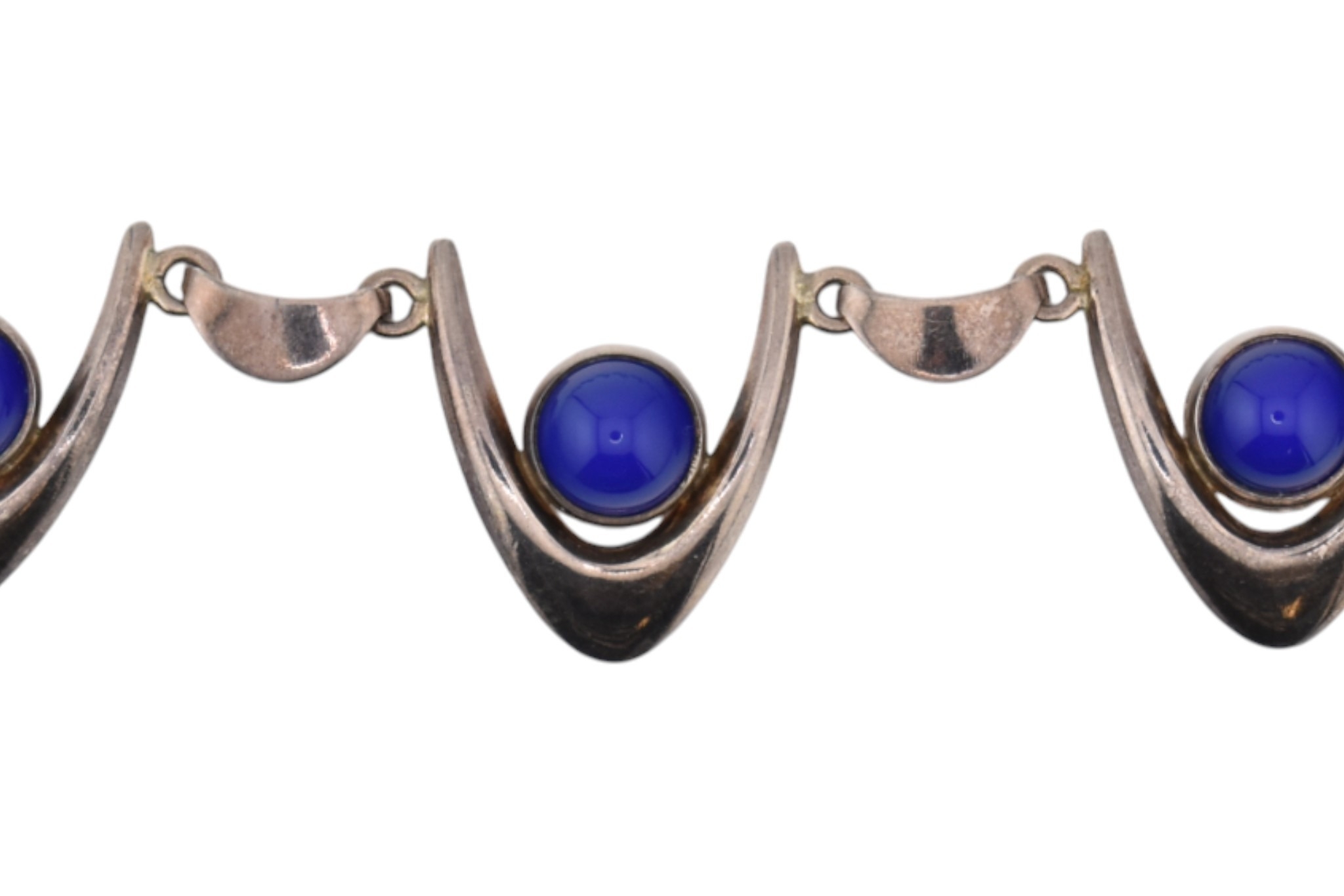 Arne Johansen - A 1970s Danish modernist 925 sterling silver necklace and bracelet set. The necklace and bracelet in a wishbone design set with blue cabochons, likely agate. Both signed AJ Denmark 925s together with import hallmarks for London 1975. Total weight 93g. Measures 38cm, bracelet 18.5cm
