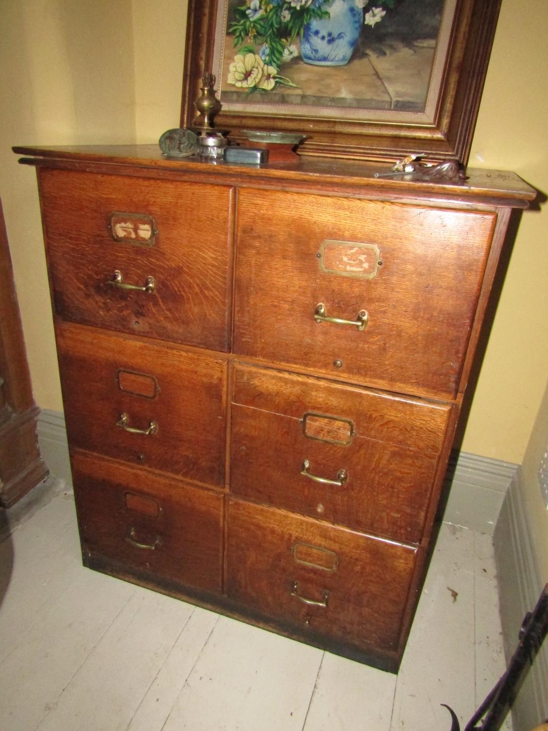 Edwardian Six Drawer Filing Cabinet with Cast Brass Mounted Handles Approximately 34 Inches Wide x 39 Inches High