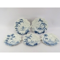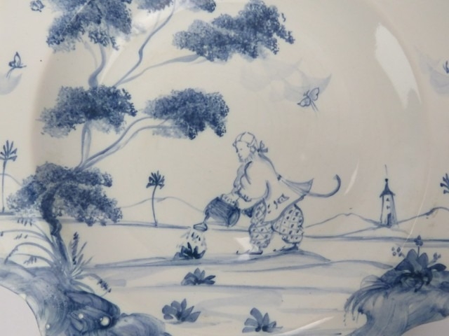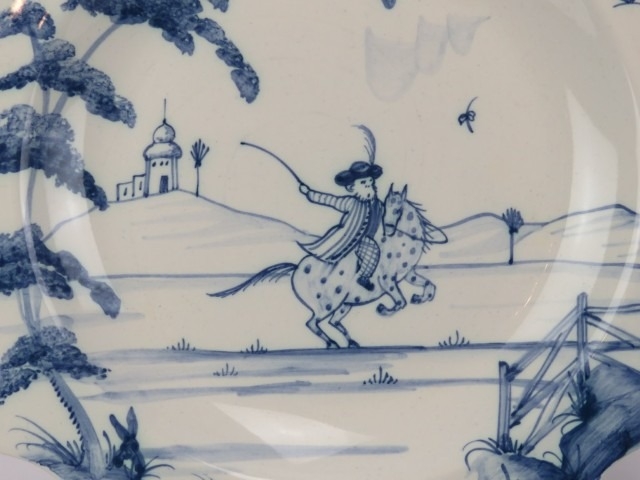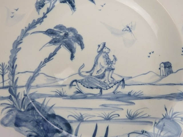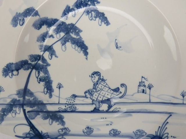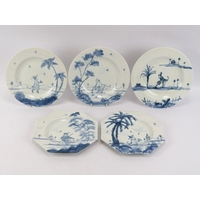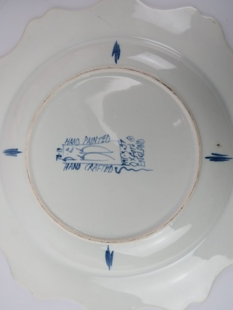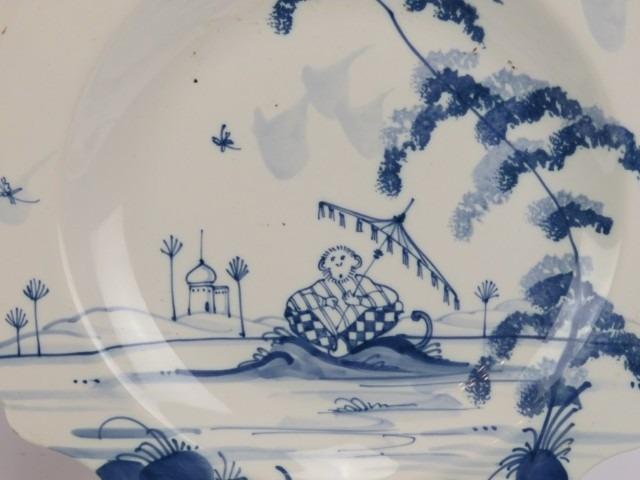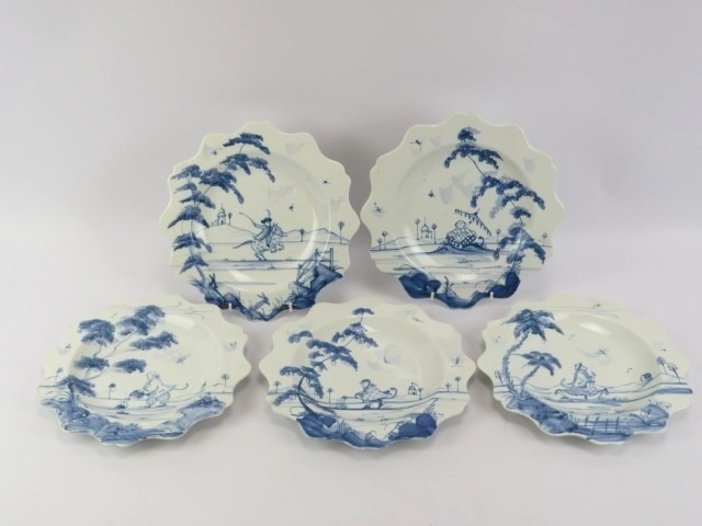 Five Isis Pottery of Oxford blue and white Delft style decorated plates depicting monkeys inspired by 18th century singeries, designed by Deborah Sears, circa 1990’s. With scalloped borders. (5 items) 25.5 cm diameter.