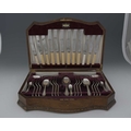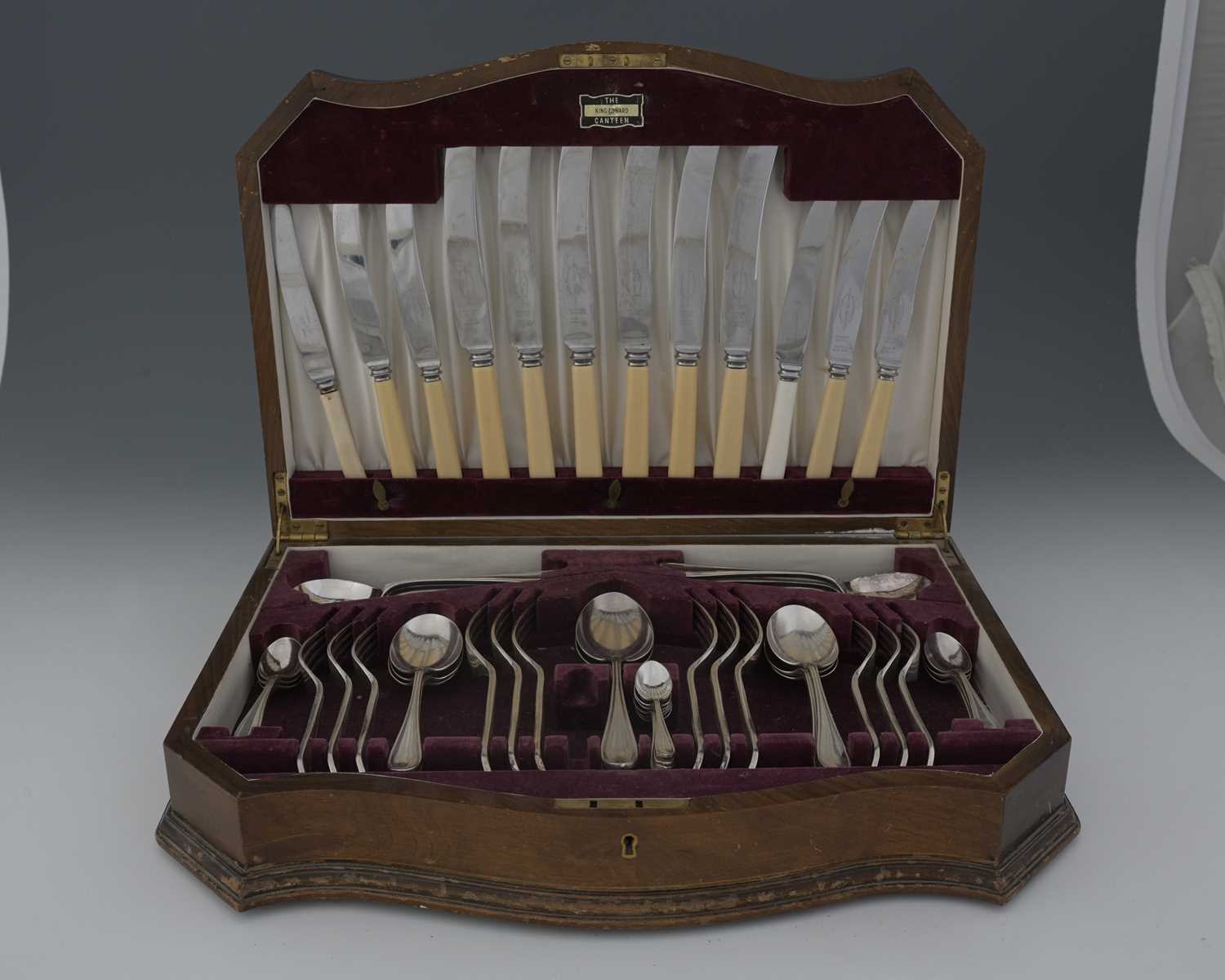 A canteen of plated cutlery, 'The King Edward Canteen', twentieth century, six-person setting, marked 'EPNS', and 'Made in Sheffield', comprising tablespoons, soup spoons, main course and entree knives with composite handles, with some missing pieces, width of canteen 45.5cm approx