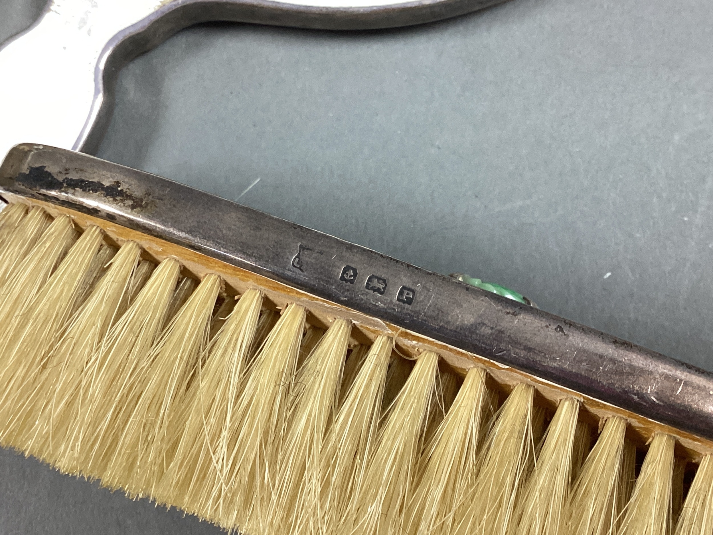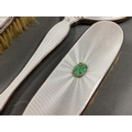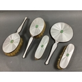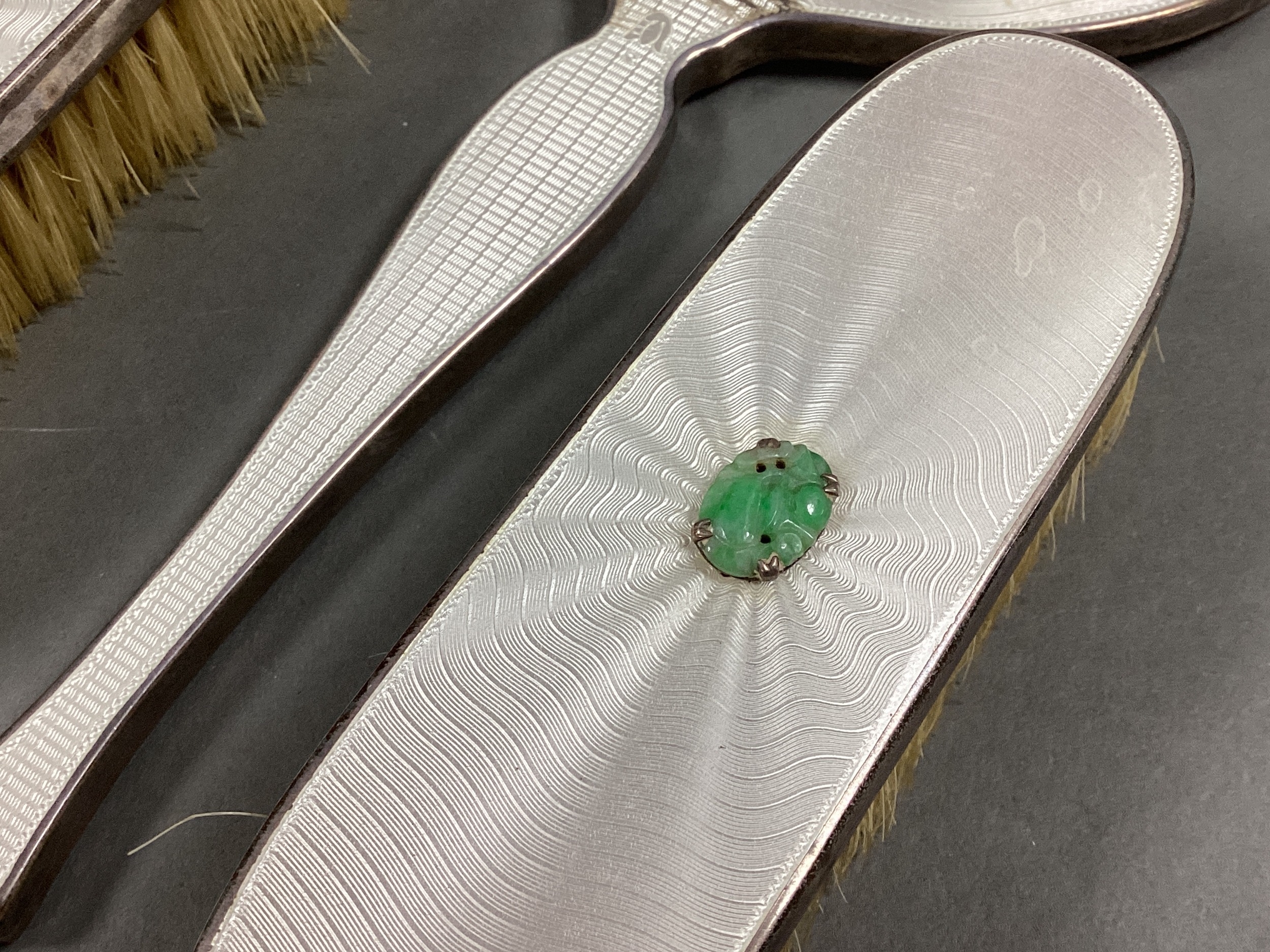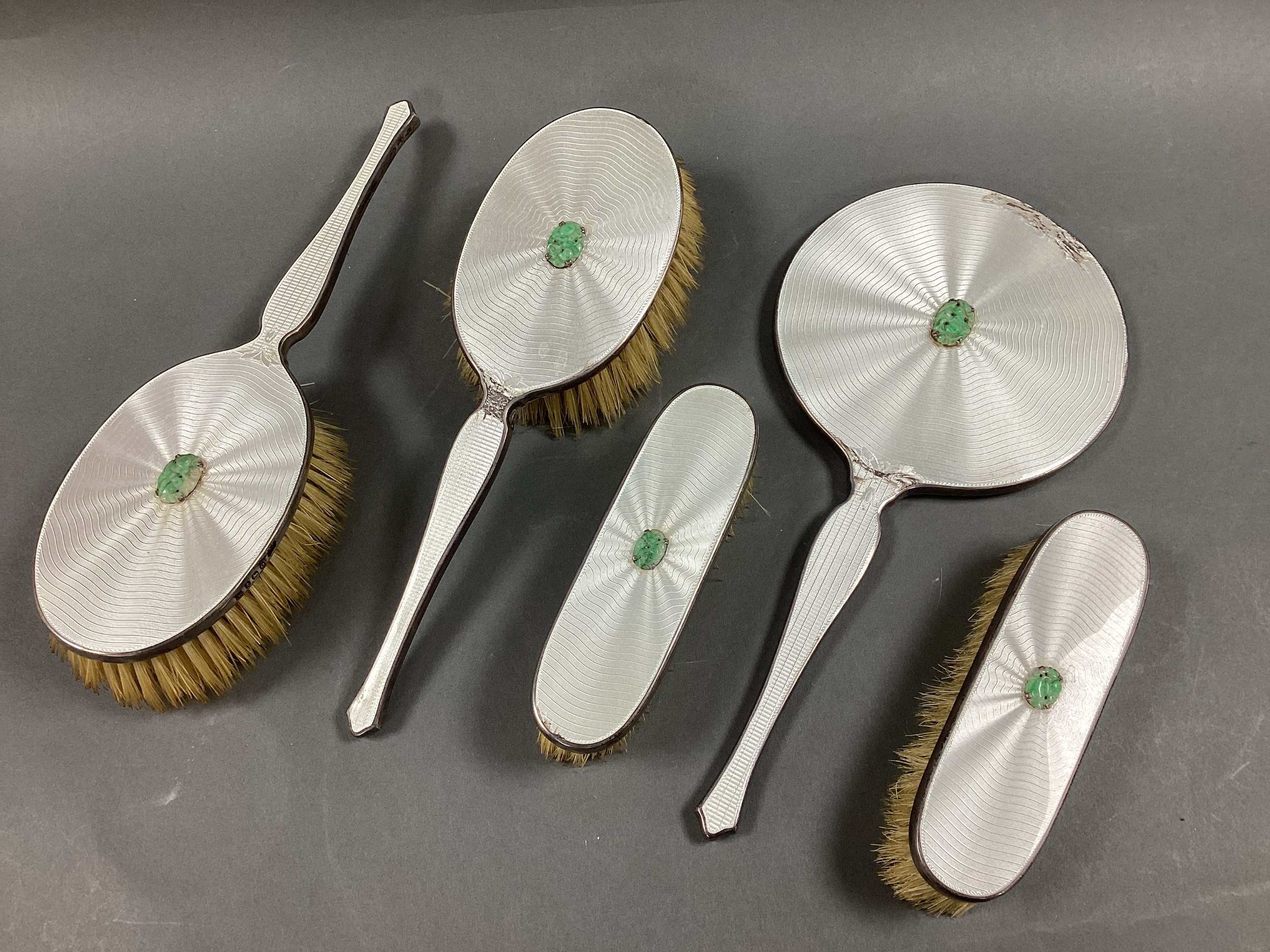 A Matched Hallmarked Silver and Enamel Five Piece Dressing Table Set, Birmingham 1938, 1939, each with claw set jade detail, on white enamel (enamel damage / loss). (5)