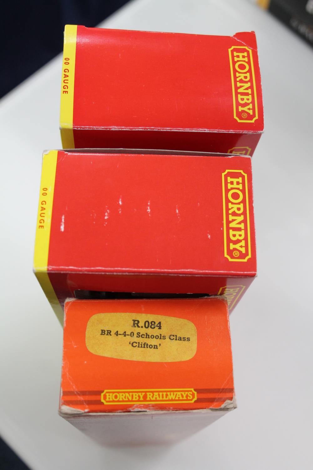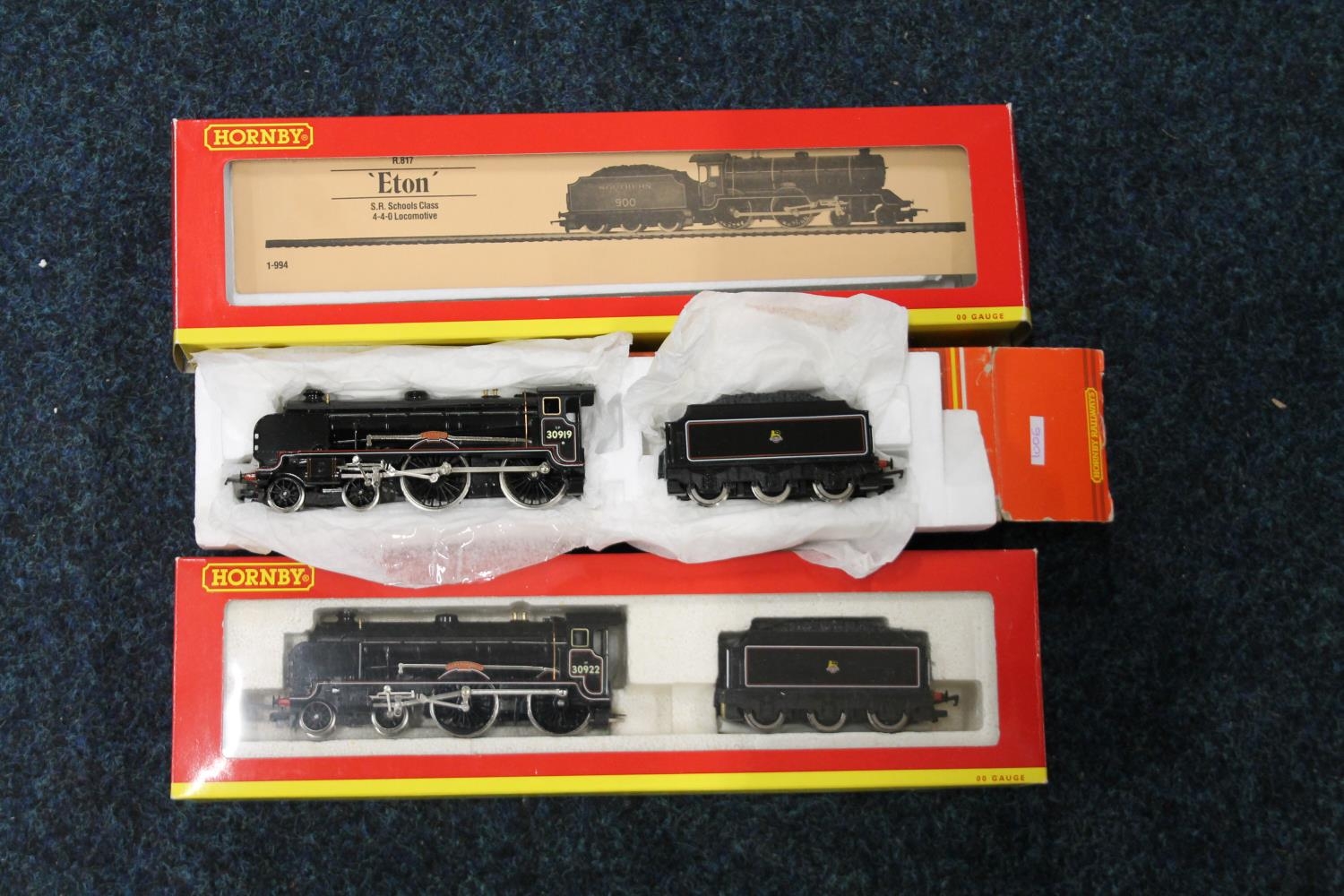 Hornby OO gauge model railways locomotives to include 4-4-0 Marlborough tender locomotive 30922 BR black, 4-4-0 Eton tender locomotive 900 Southern green and R084 4-4-0 Schools Class Clifton (renamed Harrow) tender locomotive 30919 BR black, each with a box. (3)