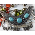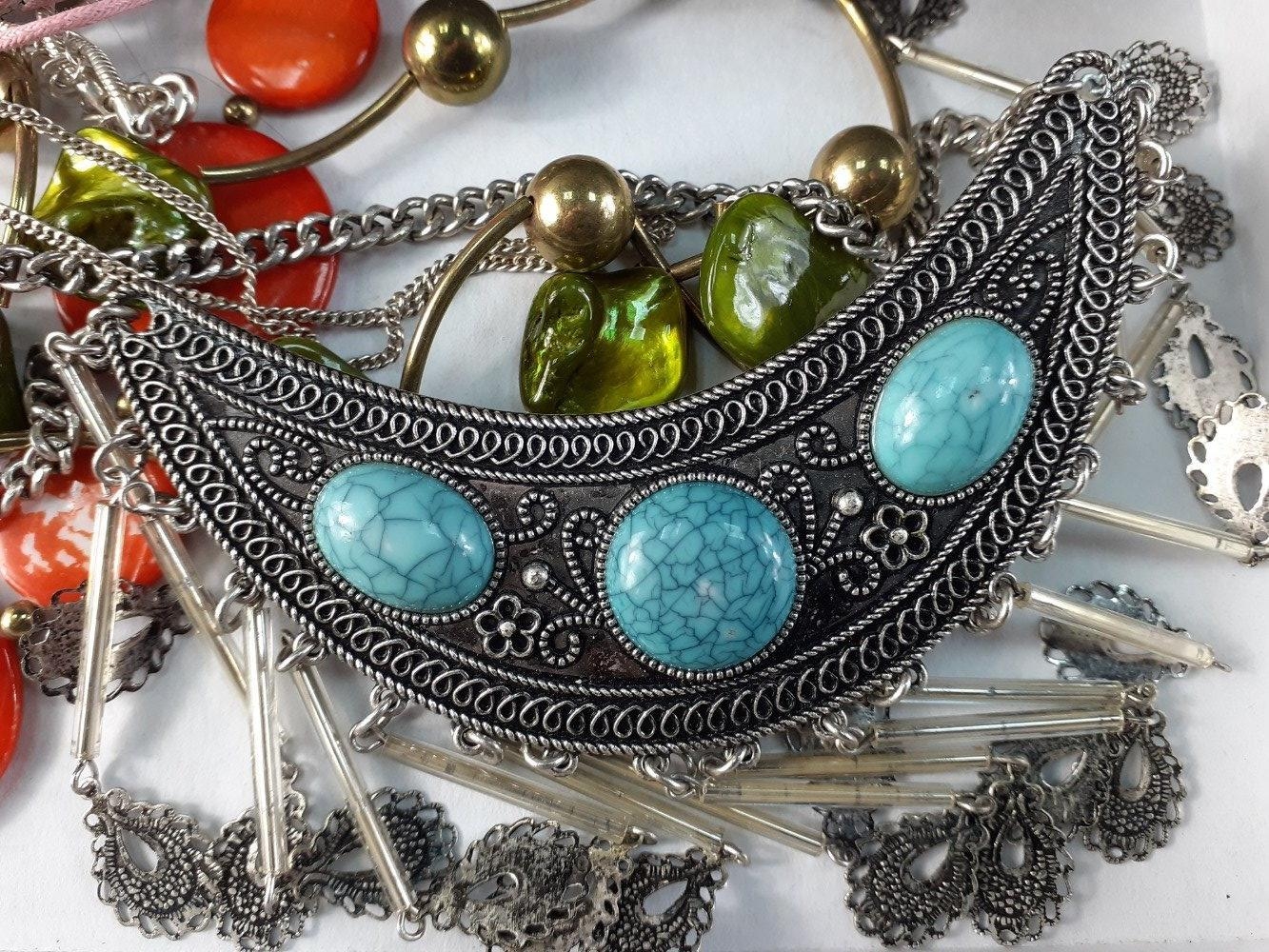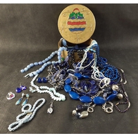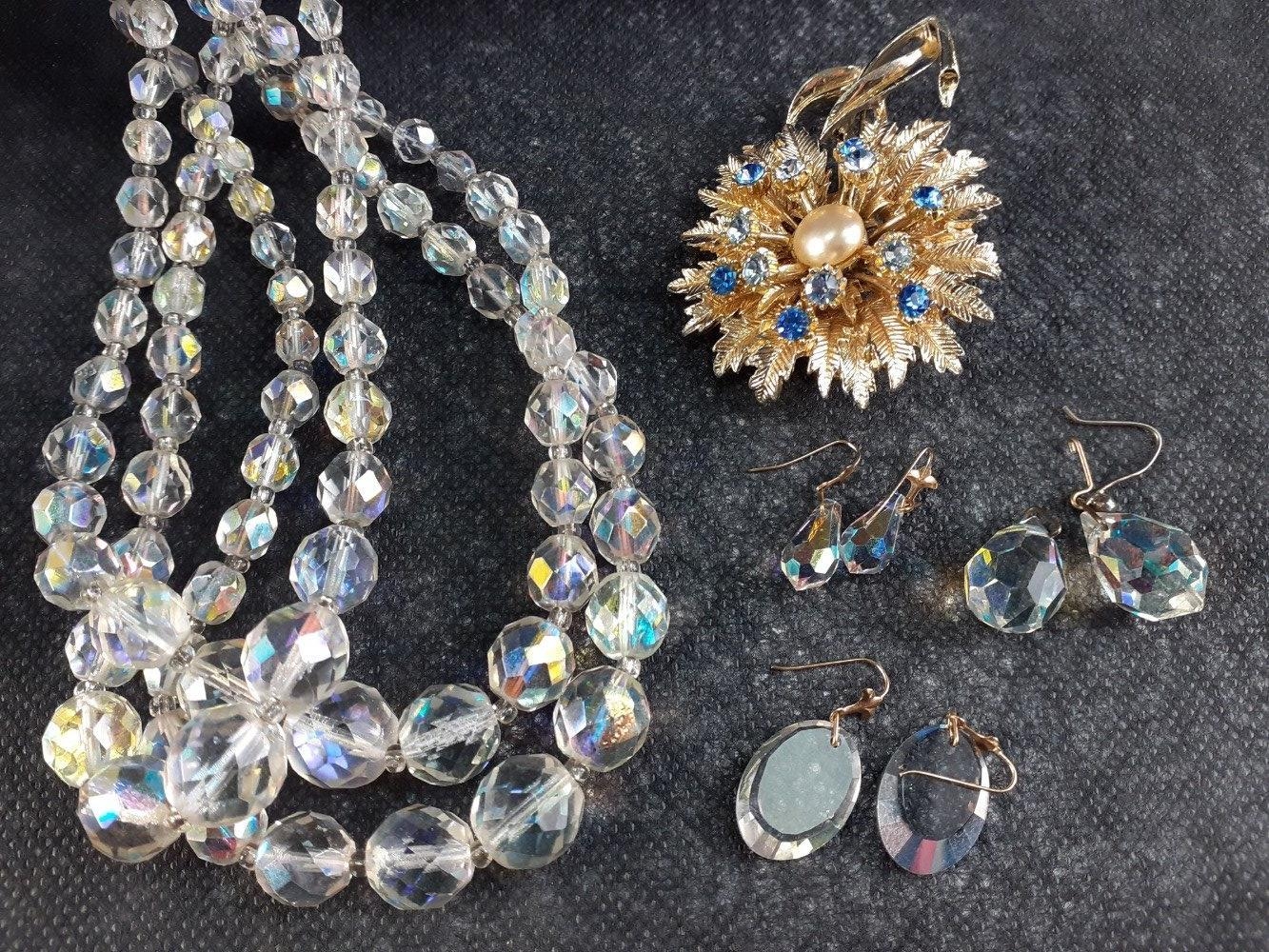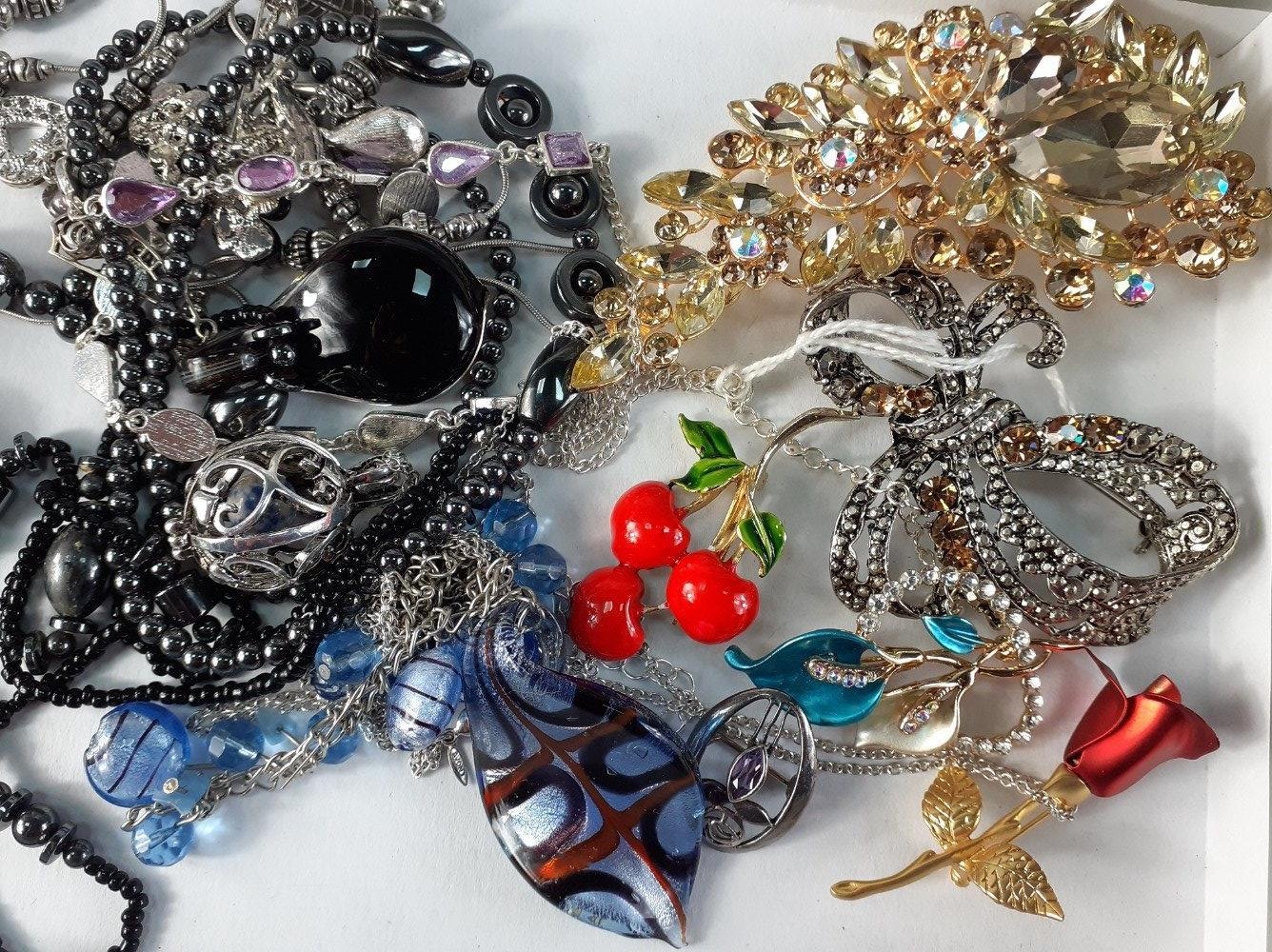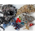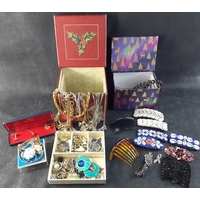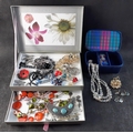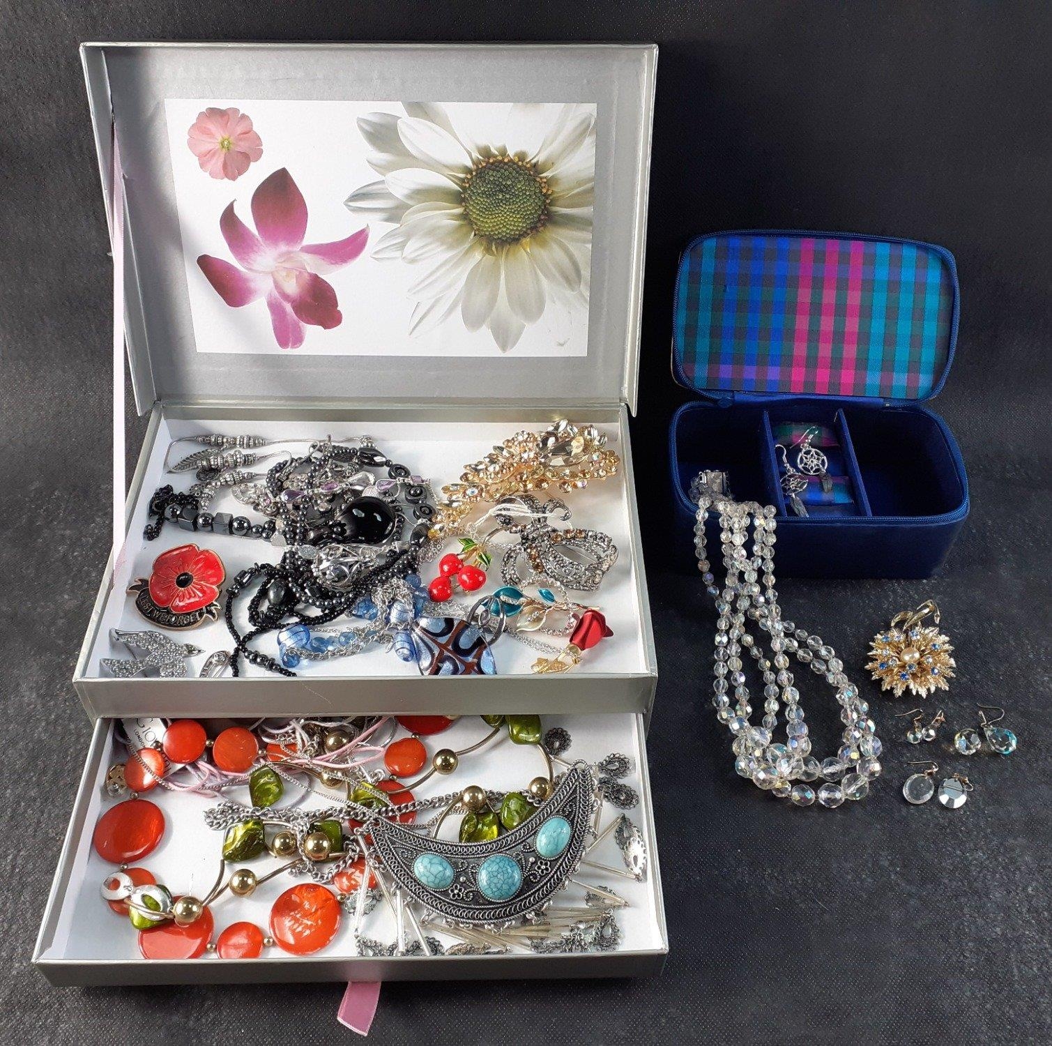 A costume jewellery lot to include a small fabric covered travelling jewellery box 16x9x6cm complete with contents of bedazzling brooches etc