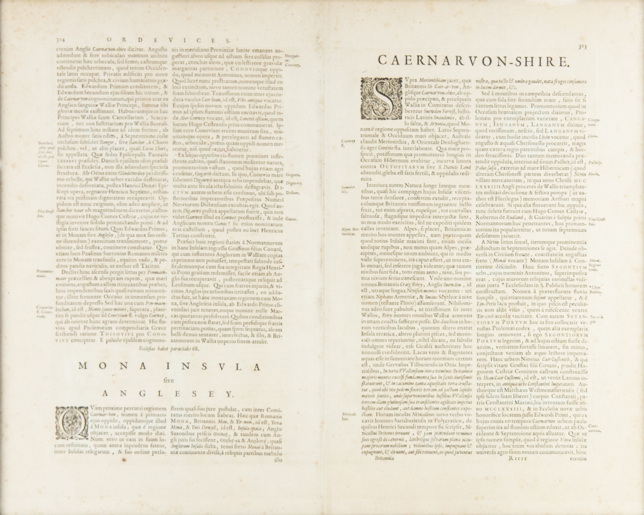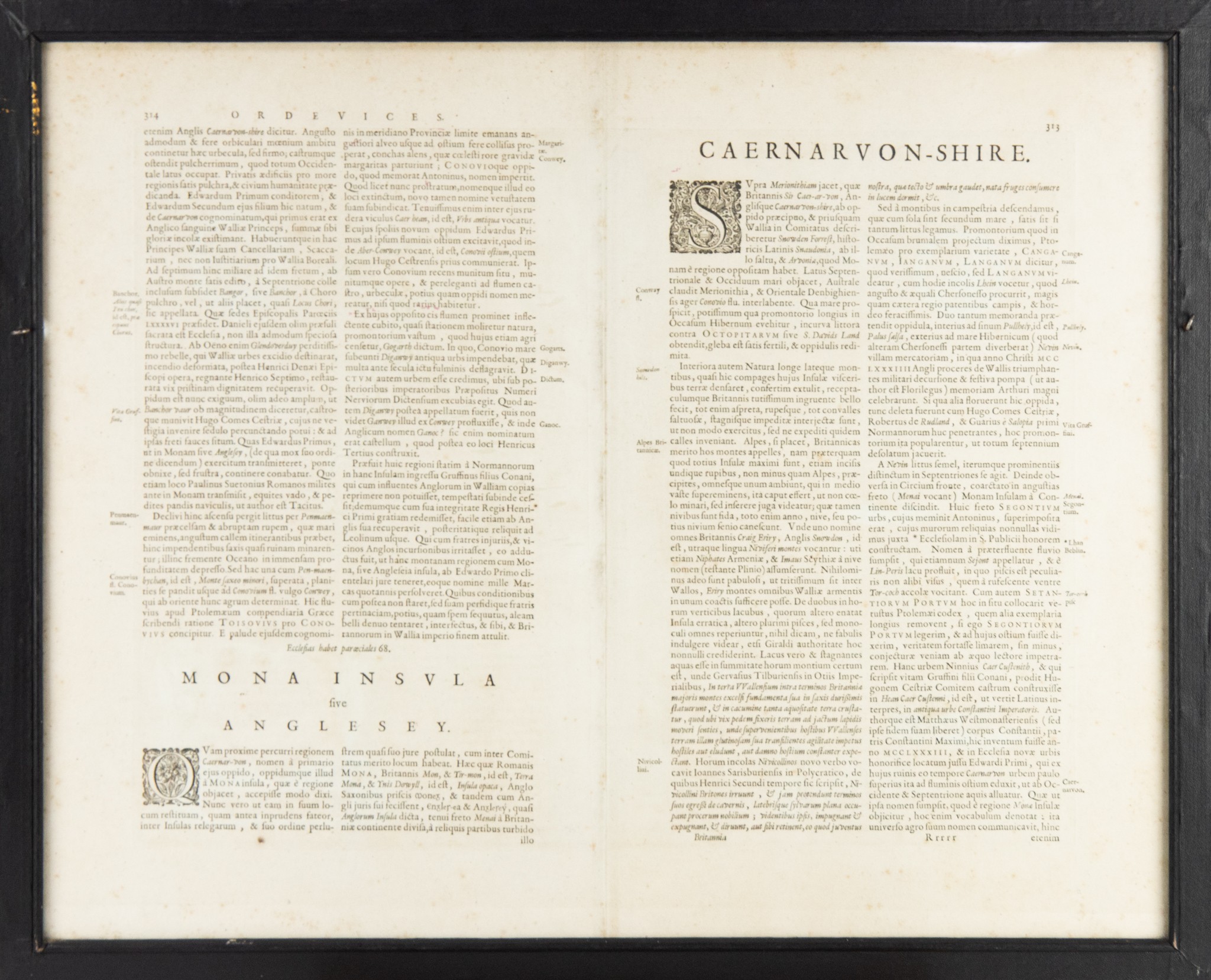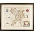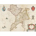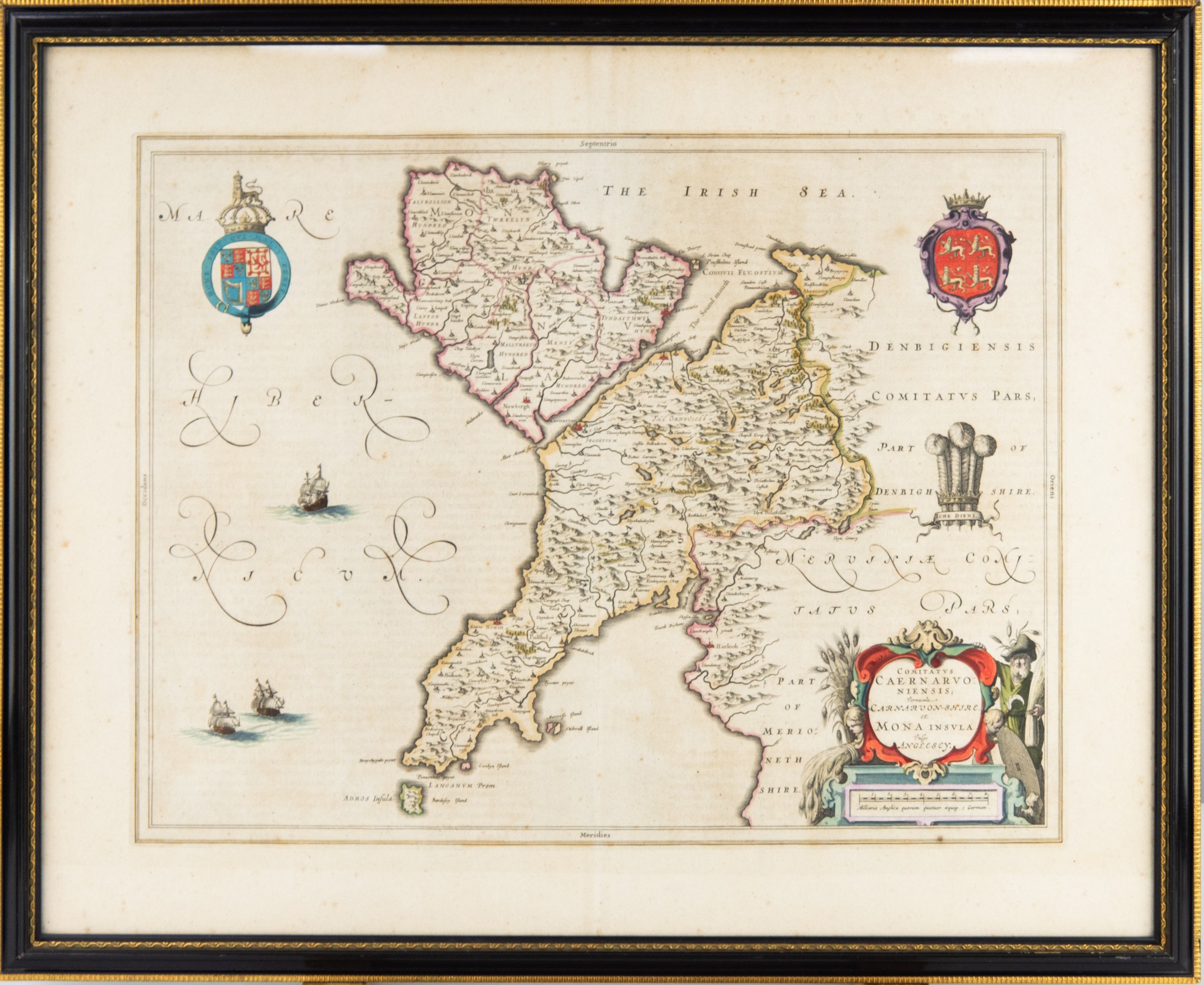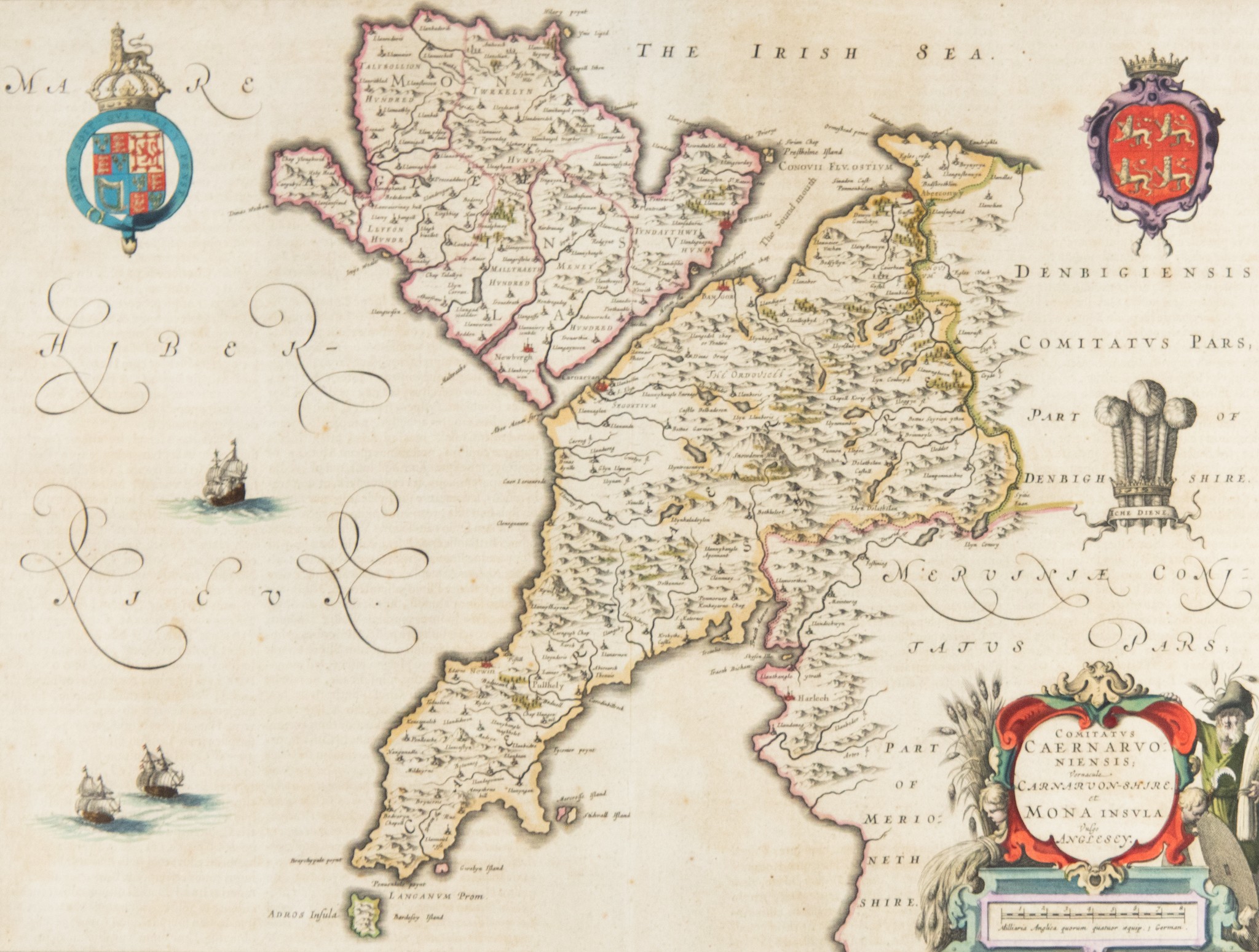 WILLIAM JANSZOON BLAEU (1571-1638) or SUCCESSORS COPPER-PLATE ENGRAVED HAND COLOURED MAP of CARNOVONSHIRE and ANGLESEY with LATIN TEXT verso 15" x 19 ½" (38cm x 49.5cm) border-line