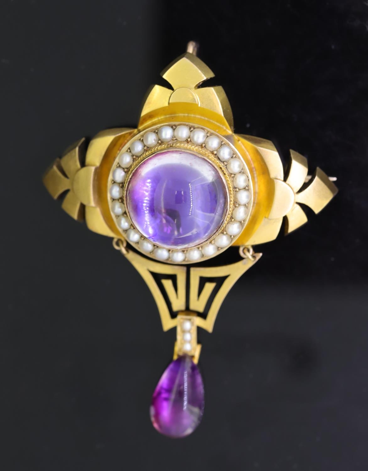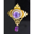 ANTIQUE VICTORIAN PEARL AND AMETHYST DROP BROOCH, set with a central amethyst surrounded by a row of pearls. With openwork drop suspending an amethyst. With locket back. W. 5 cm. L. 7 cm. With box.