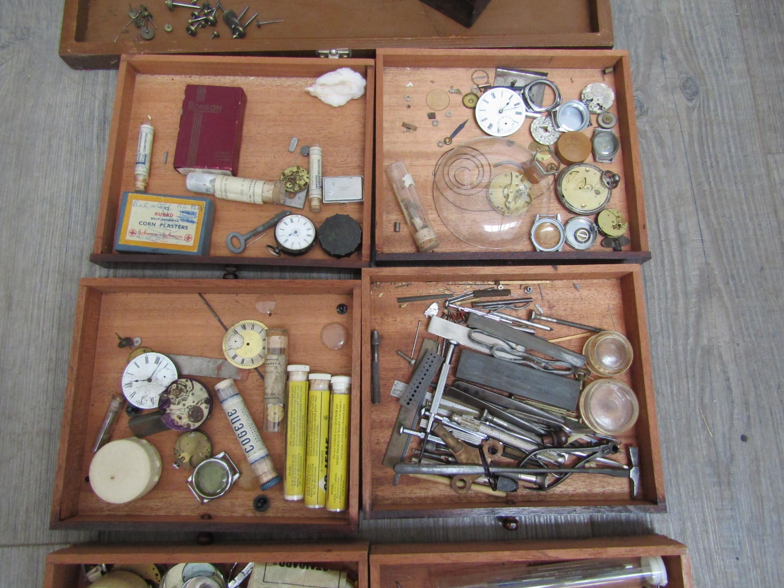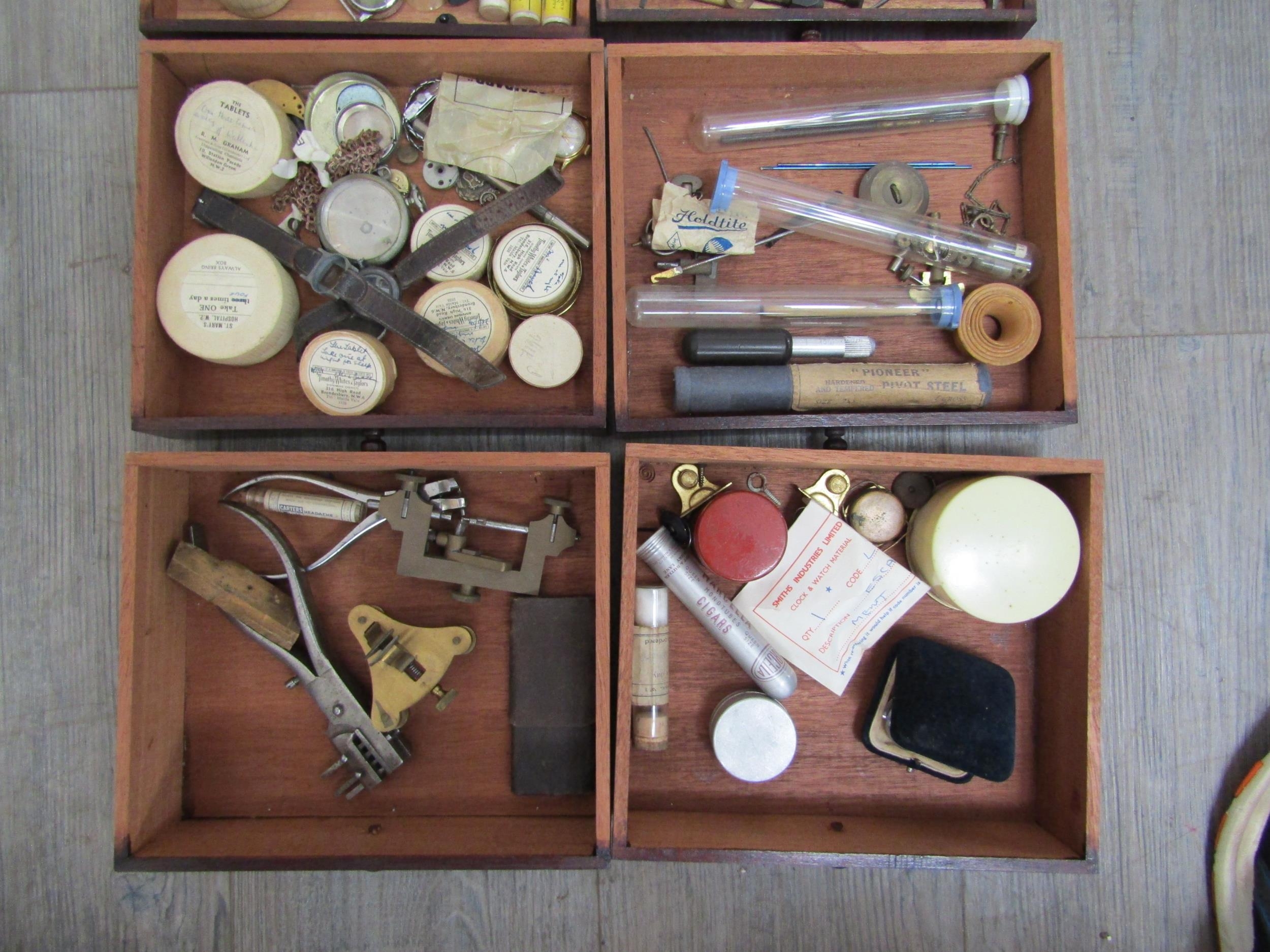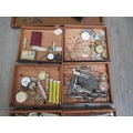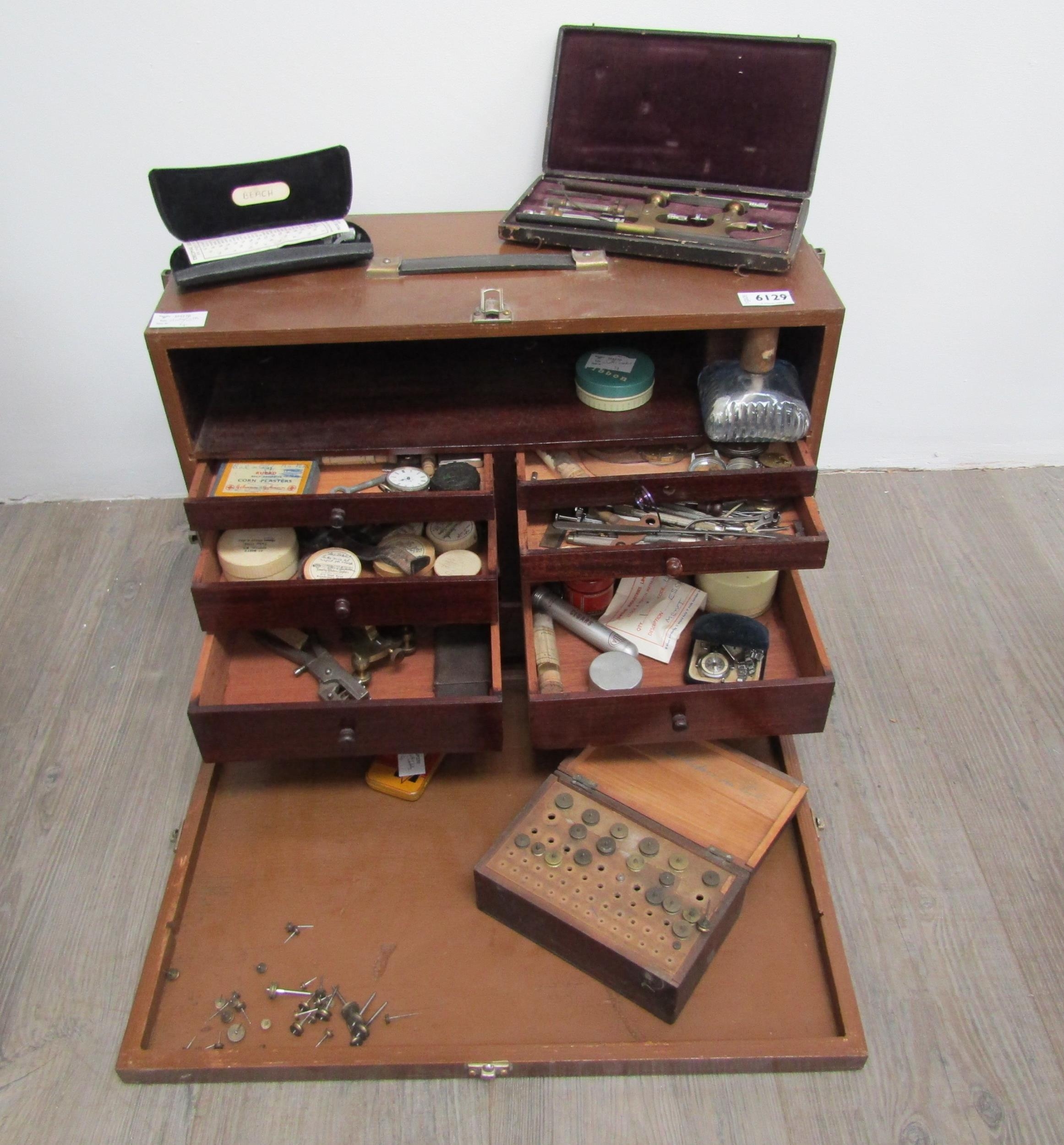 A watch repairers travelling cabinet with horological tools and parts