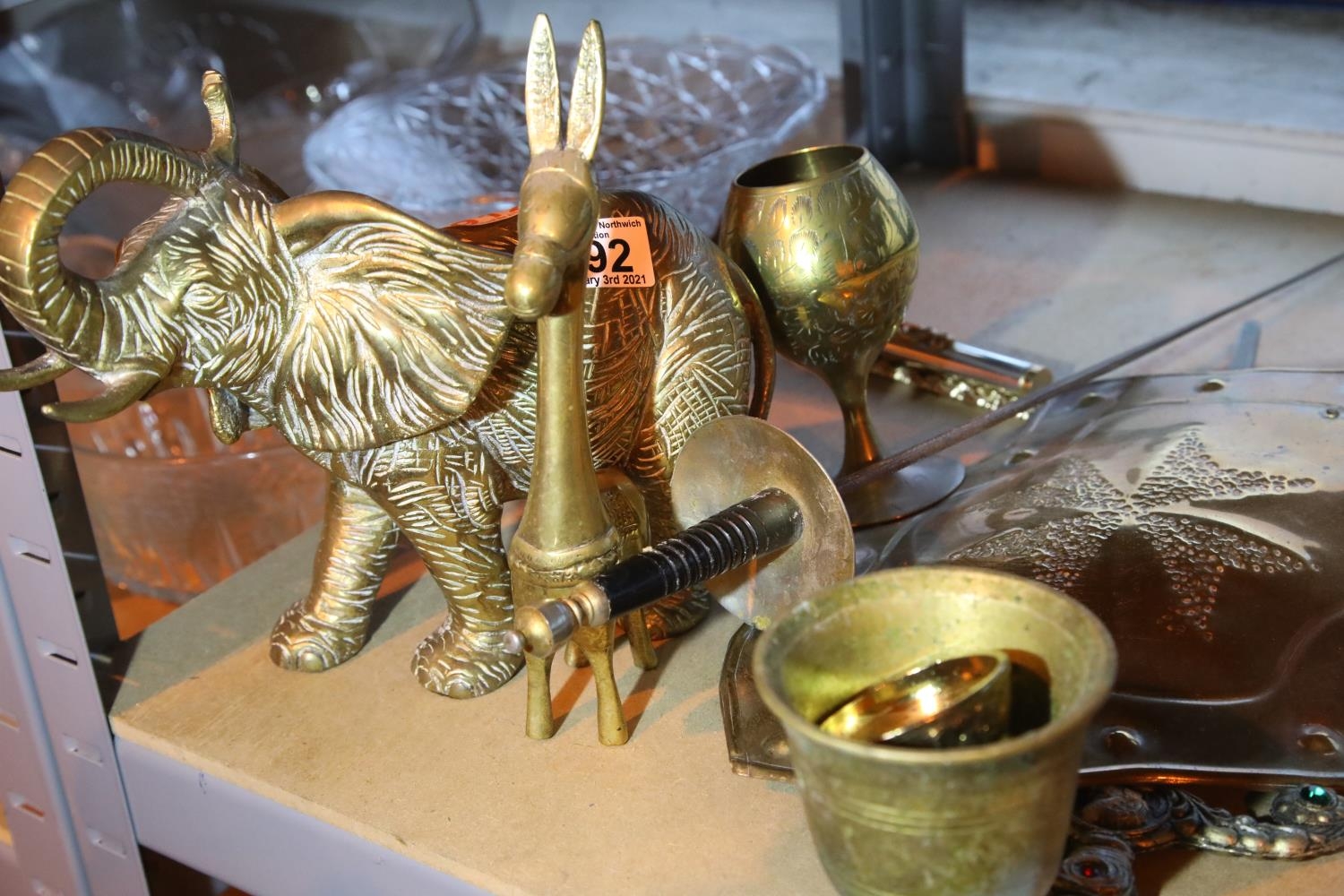 Large brass African elephant figurine and other brassware. Not available for in-house P&P, contact Paul O'Hea at Mailboxes on 01925 659133