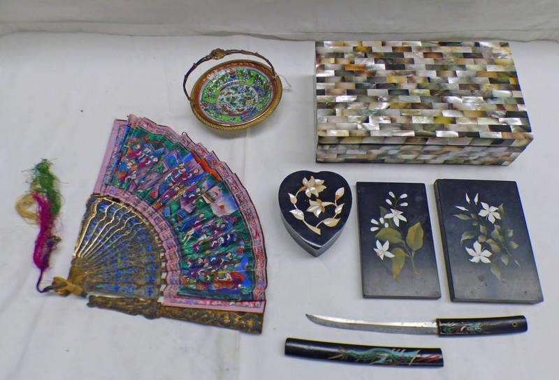 MOTHER OF PEARL LIDDED BOX, 3 INLAID HARDSTONE PIECES, ORIENTAL FAN, ORIENTAL DAGGER ETC