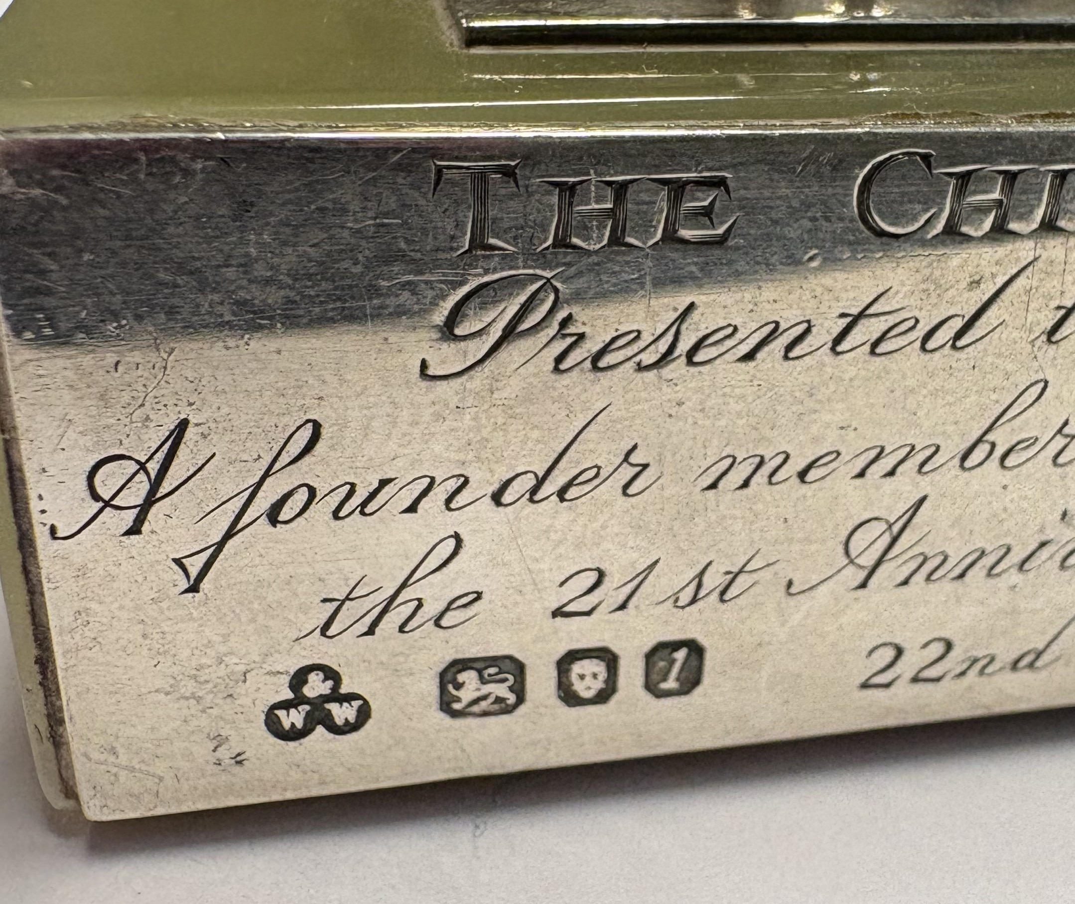 A silver figure of a jockey on rectangular base inscribed 'The Chichester 12', presented to 'JDM Brinkman'. London 1966. By Wakely & Wheeler. Approx. 201 grams. Est. £200 - £300.