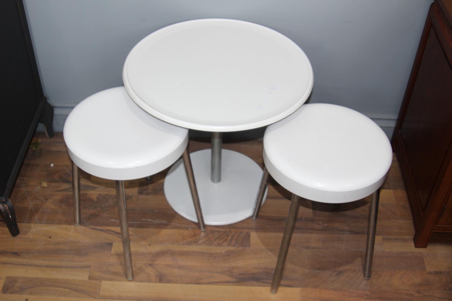 PAIR OF RETRO STOOLS AND SIDE TABLE32 X 40CM
