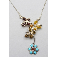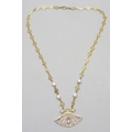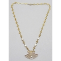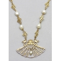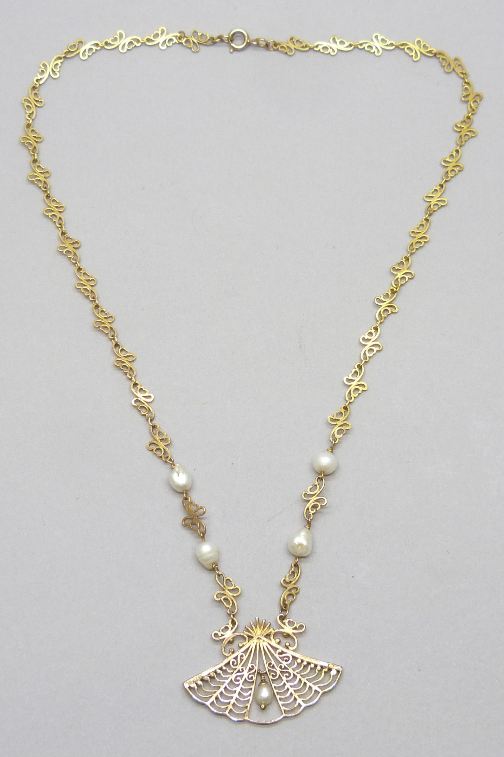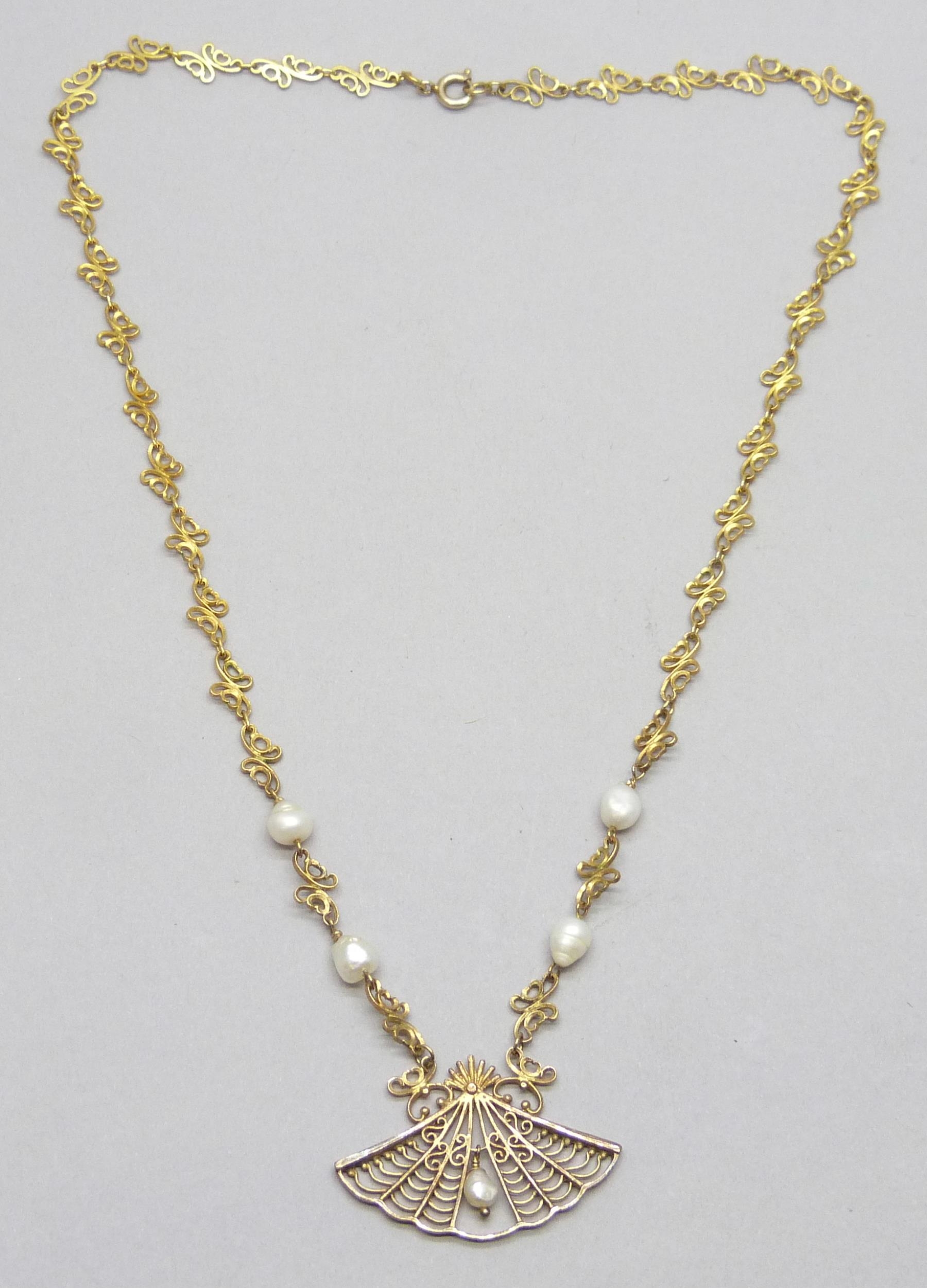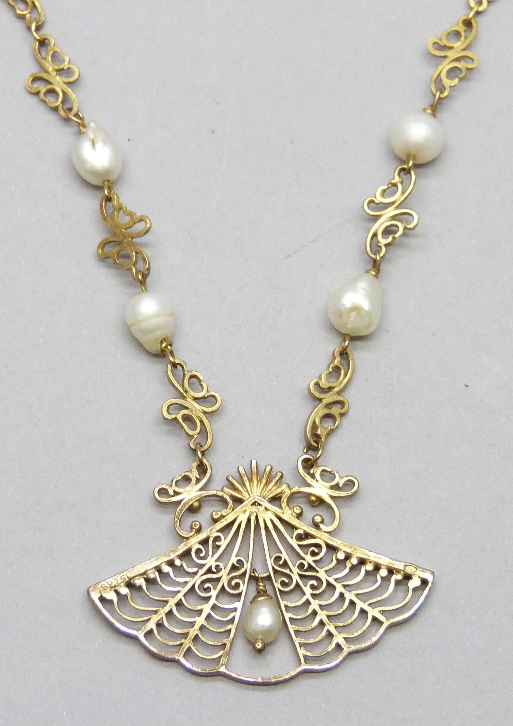 A Continental .925 silver gilt necklace with Art Deco style fan design pendant and pearls, with import marks, 45cm