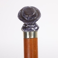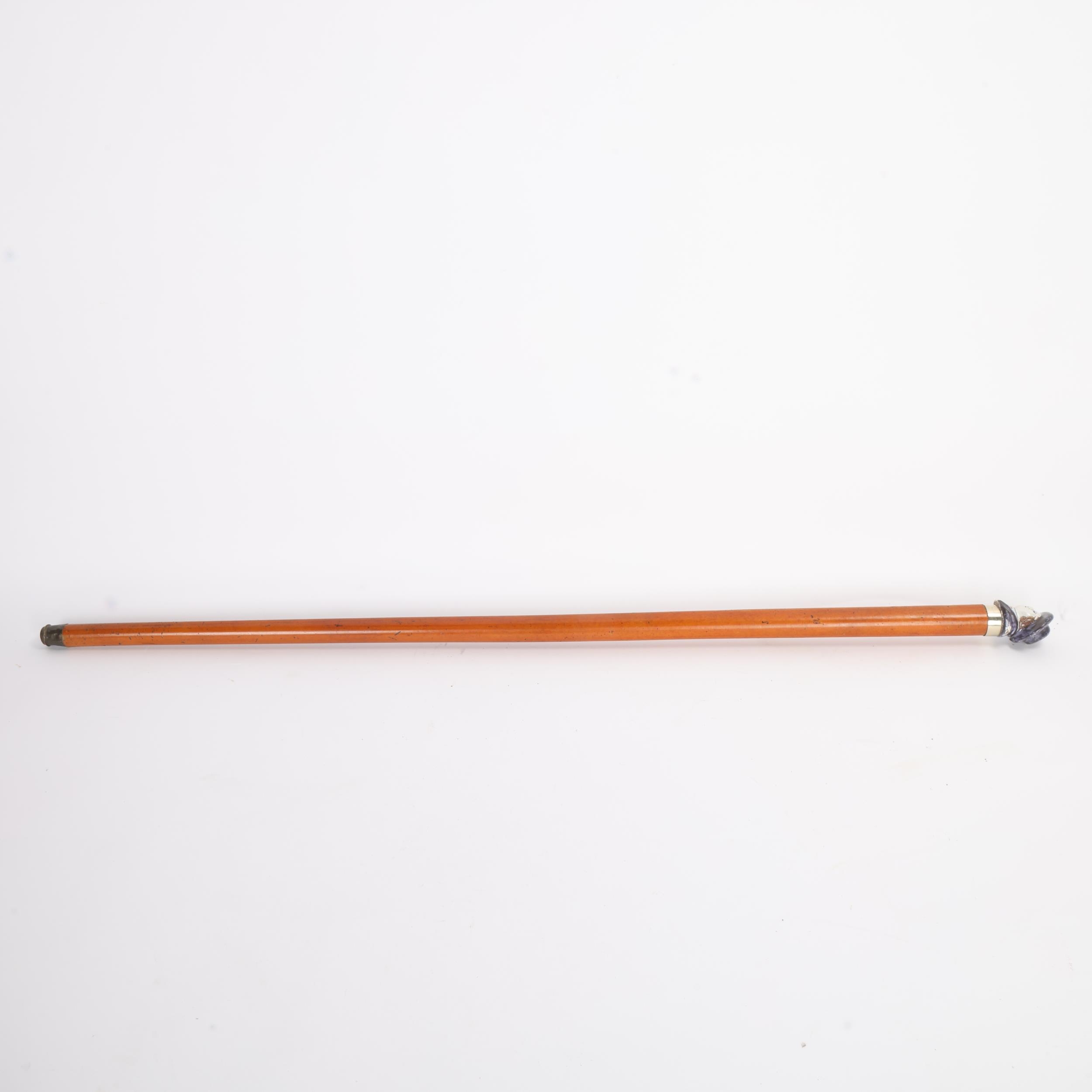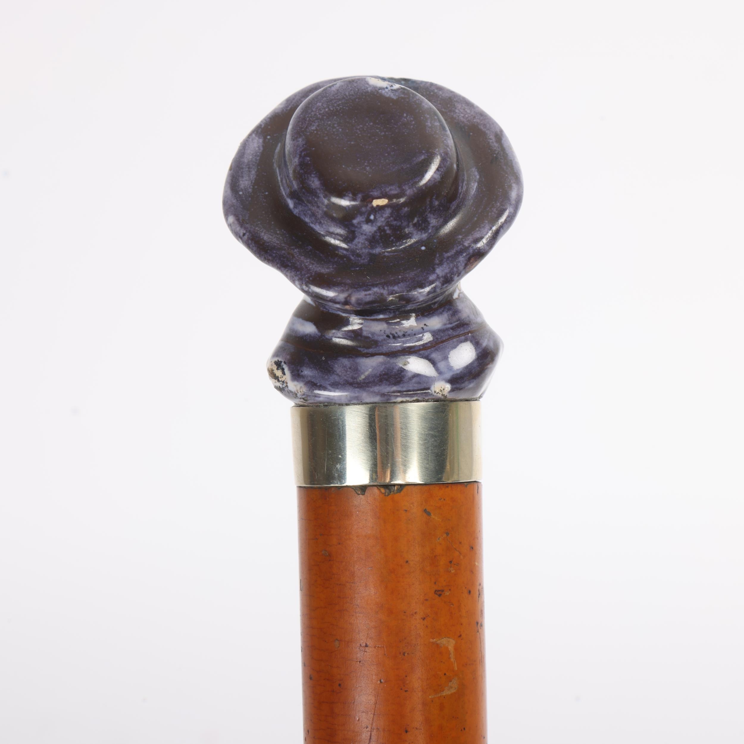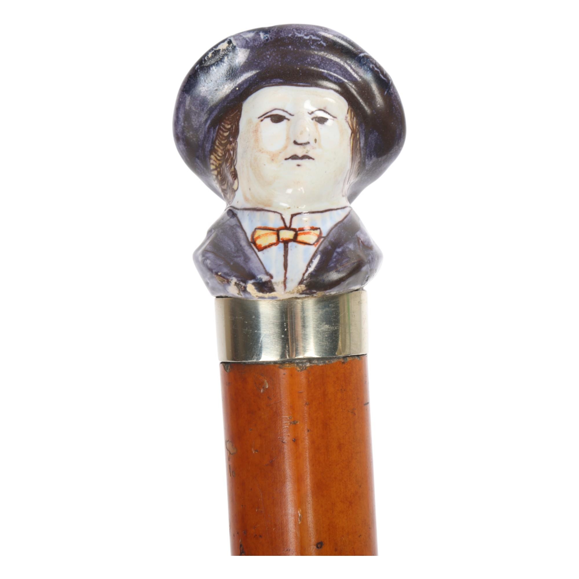 A rare 19th Century pottery-handled cane with ceramic handle cast and painted as a man with hat and bowtie, white metal collar, Malacca shaft, shaped metal ferrule, English circa 1860s, 89.5cm