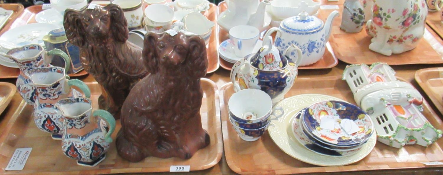 Two trays of assorted pottery and ceramics to include: bronzed effect Staffordshire dog and a brown Staffordshire dog, 3 Fenton Stonework's Imari Style jugs, Gaudy Welsh 'Tulip' Pattern sucrier, 3 tea cups and saucers and a tea plate, Crown Devon 'Mumbles Head and Lighthouse' plate and 2 late 19th Century Staffordshire figures of houses with fox in pursuit of a hen to the front.