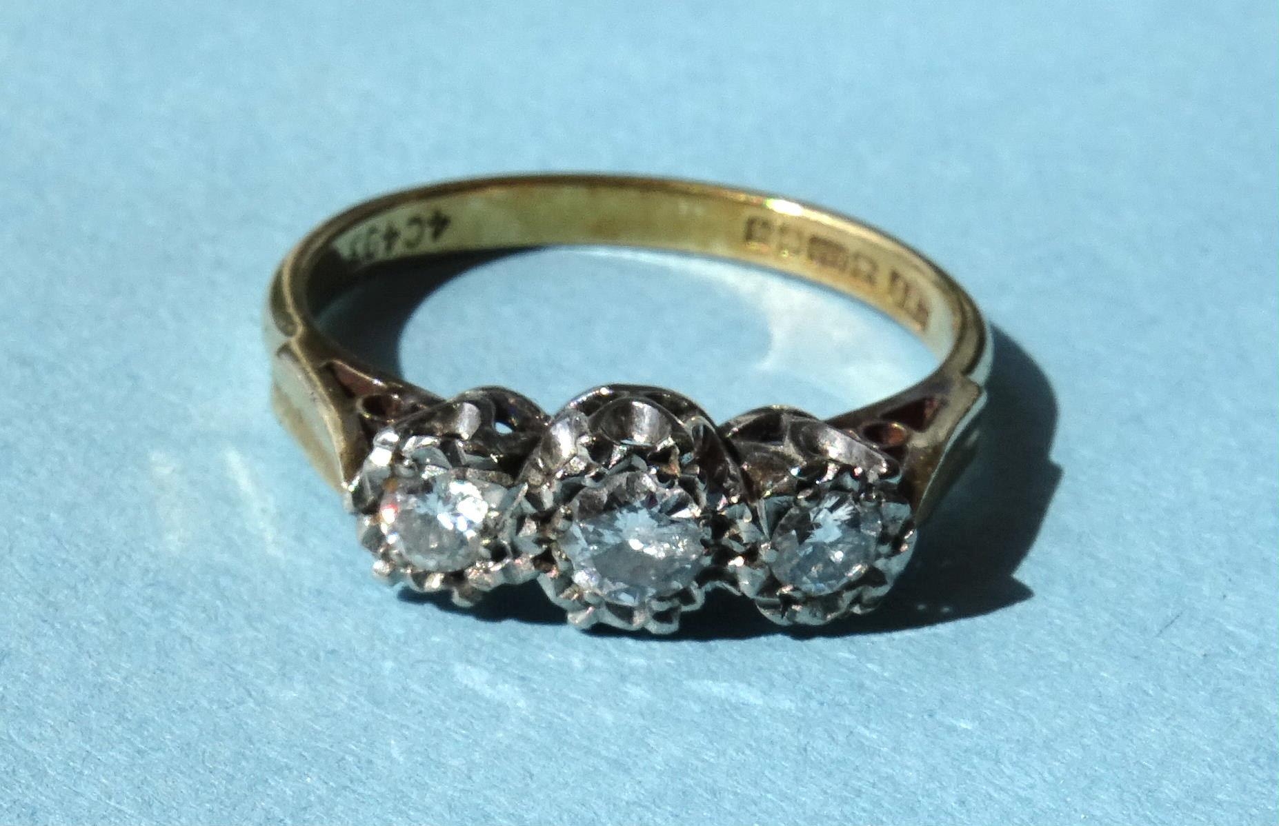 A three-stone diamond ring, the brilliant-cut diamonds illusion-set in 18ct gold mount, size N½, 2.7g.