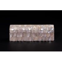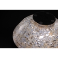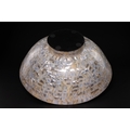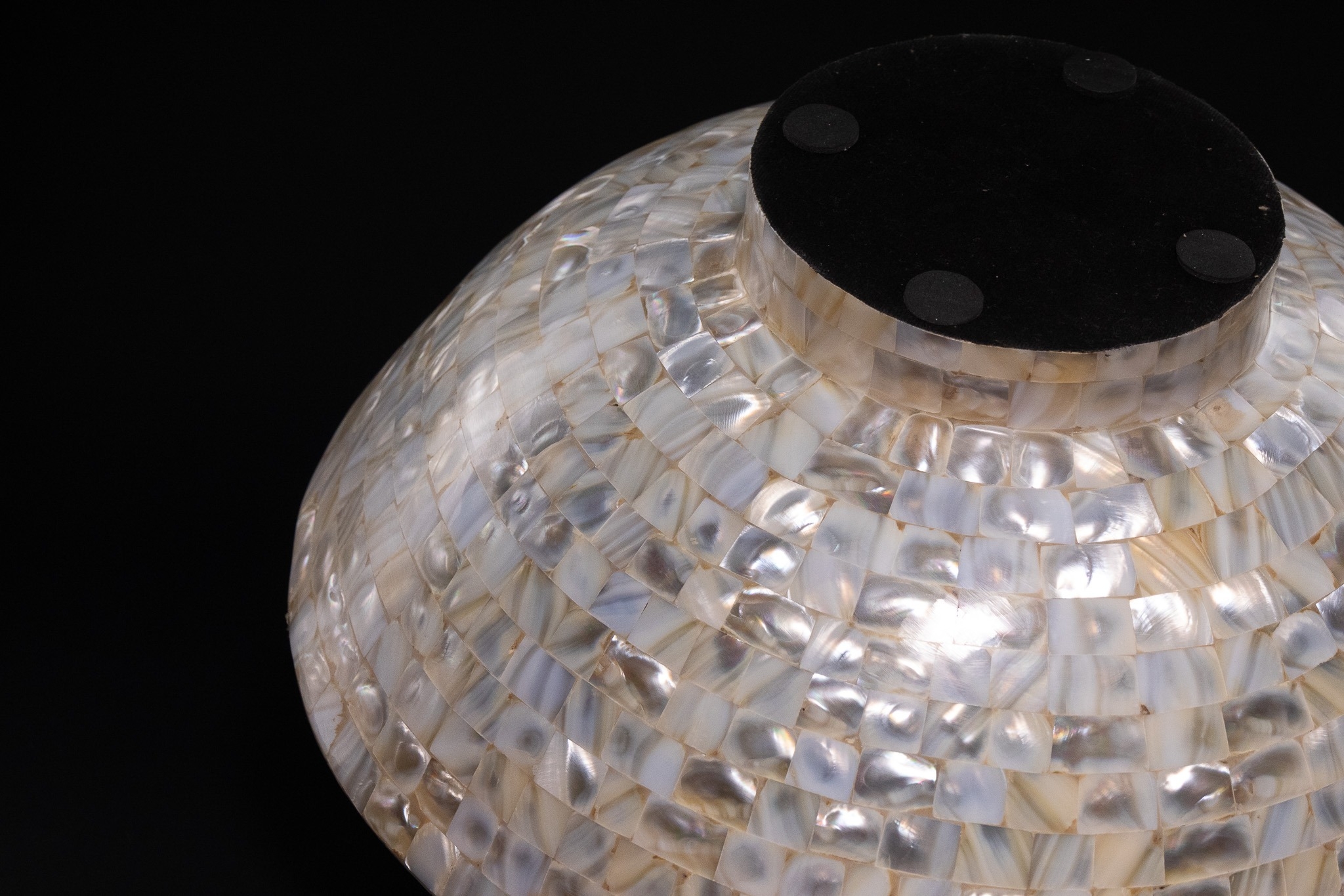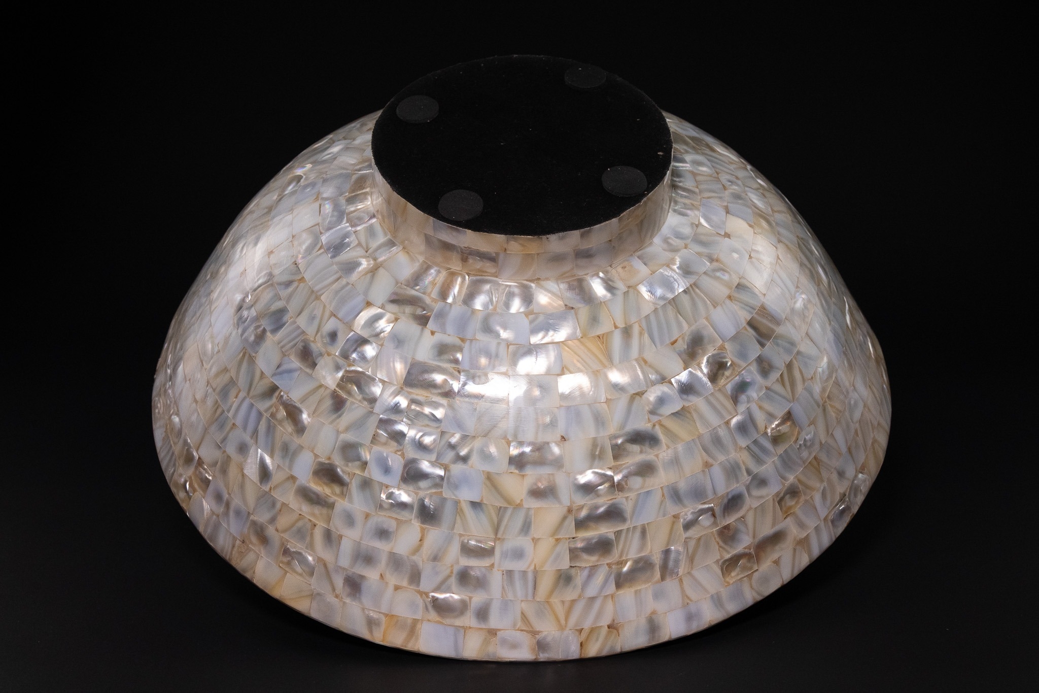 An Anglo-Indian footed bowl of circular form, featuring a mosaic exterior and interior composed of iridescent mother-of-pearl tiles. The nacre elements are cut into small rectangular and square sections and applied in concentric and horizontal bands to a central substrate, exhibiting a natural colour palette of white, cream, and pale grey with a characteristic lustre. The vessel rests upon a short, integrated circular foot, the base of which is lined with black felt and equipped with four protective pads.