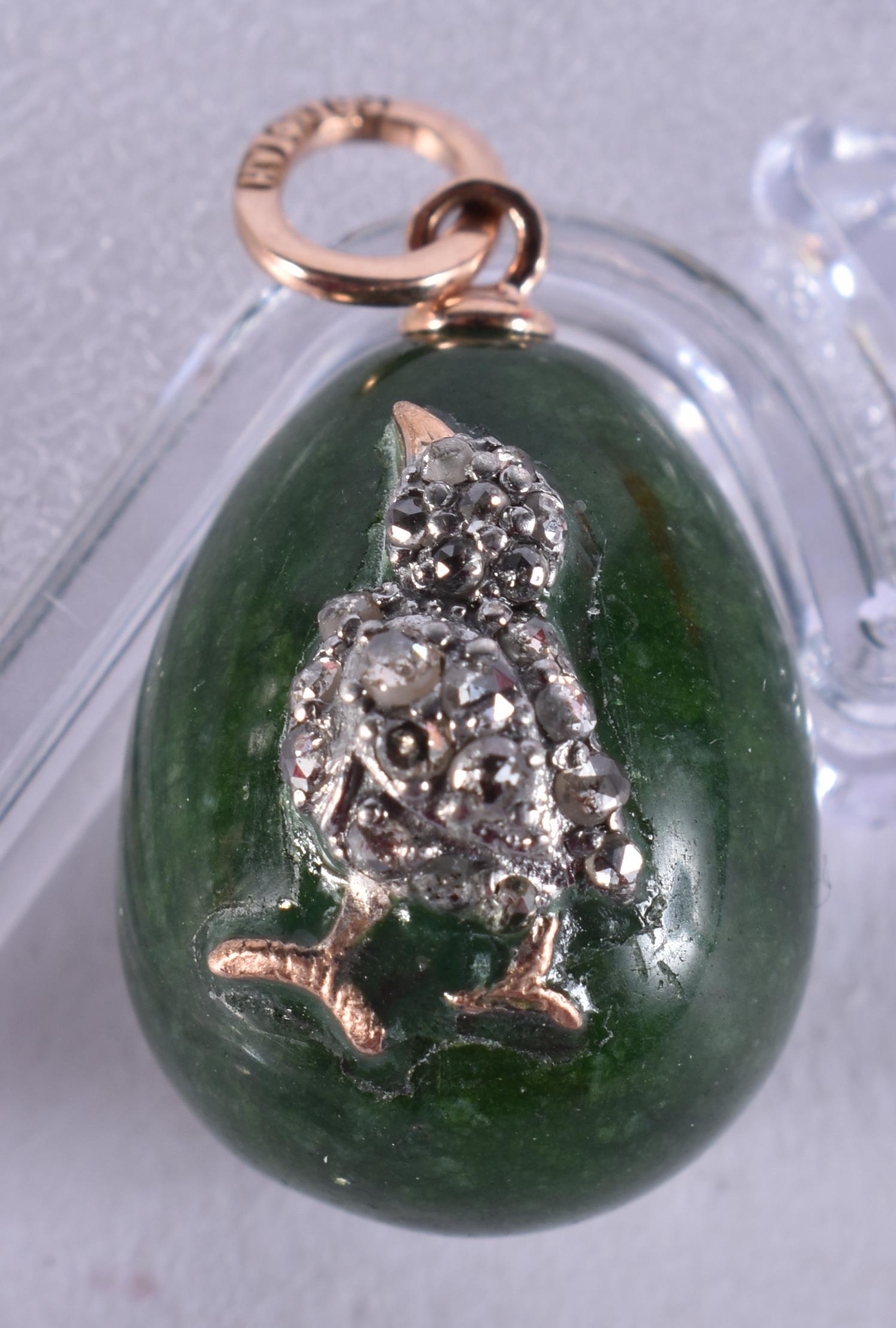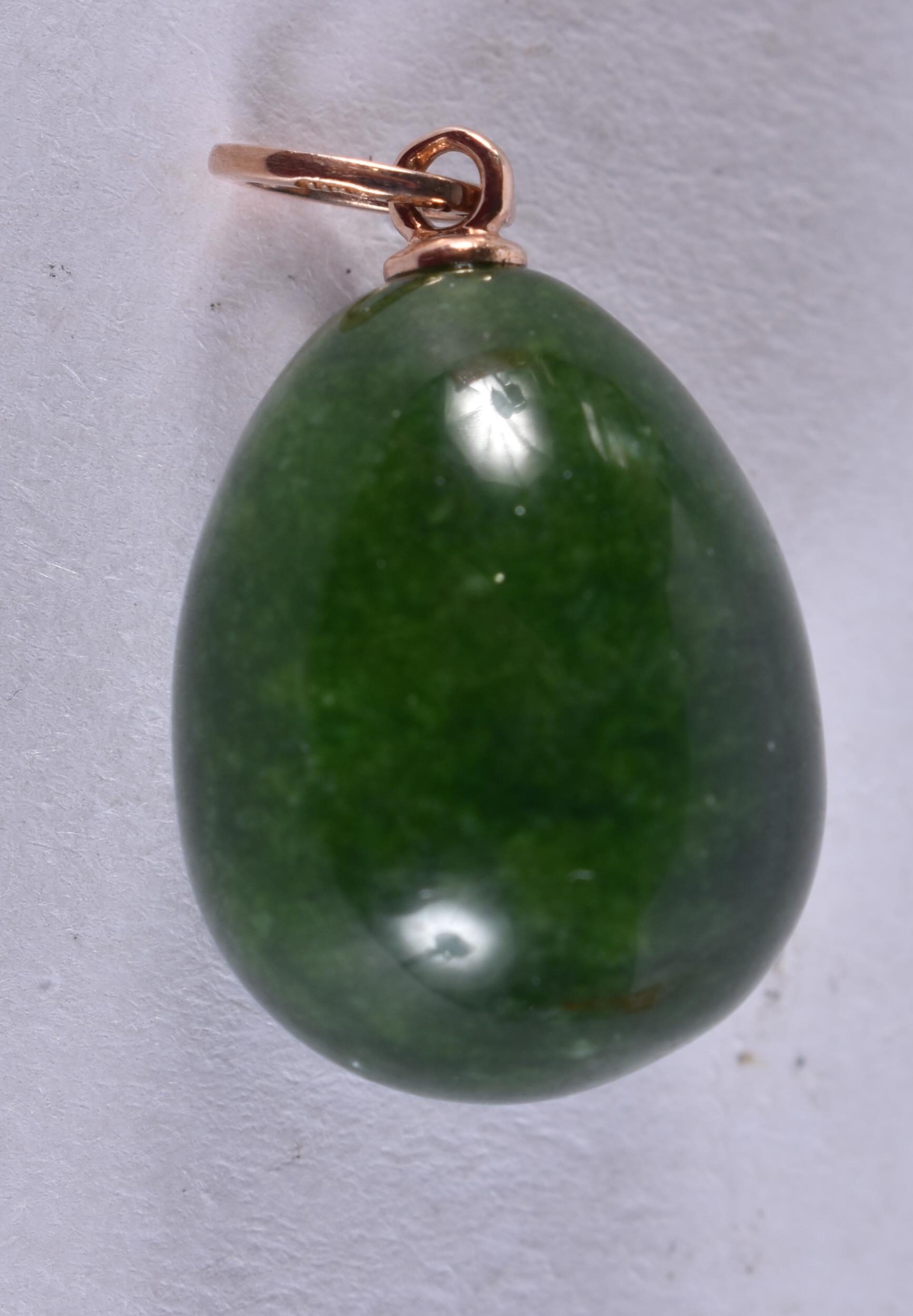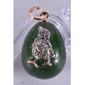 A Continental 14 Carat Gold Mounted Jade Egg Pendant with Diamond Chip Decoration. Stamped 56, 2.6cm x 1.7cm, weight 7.3g