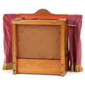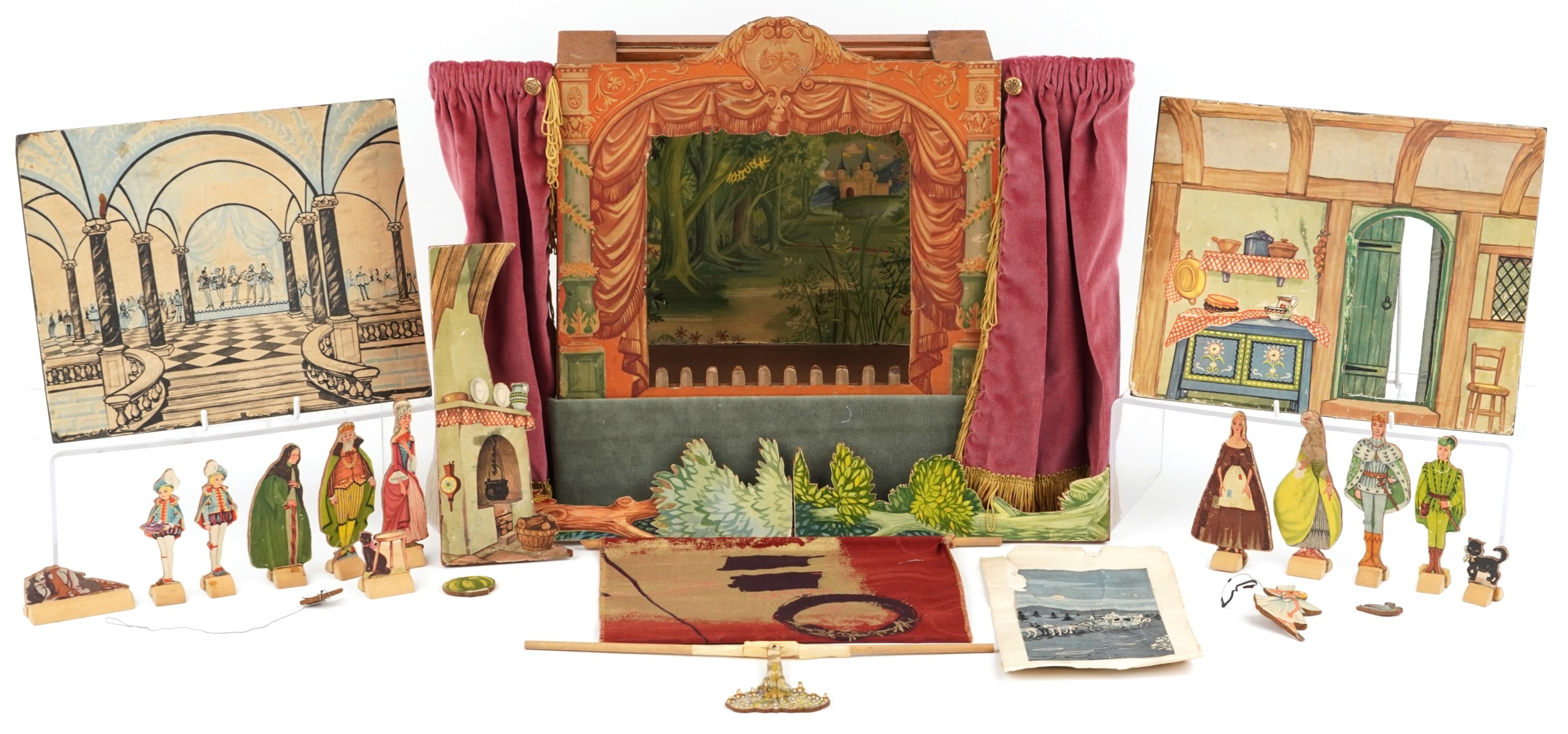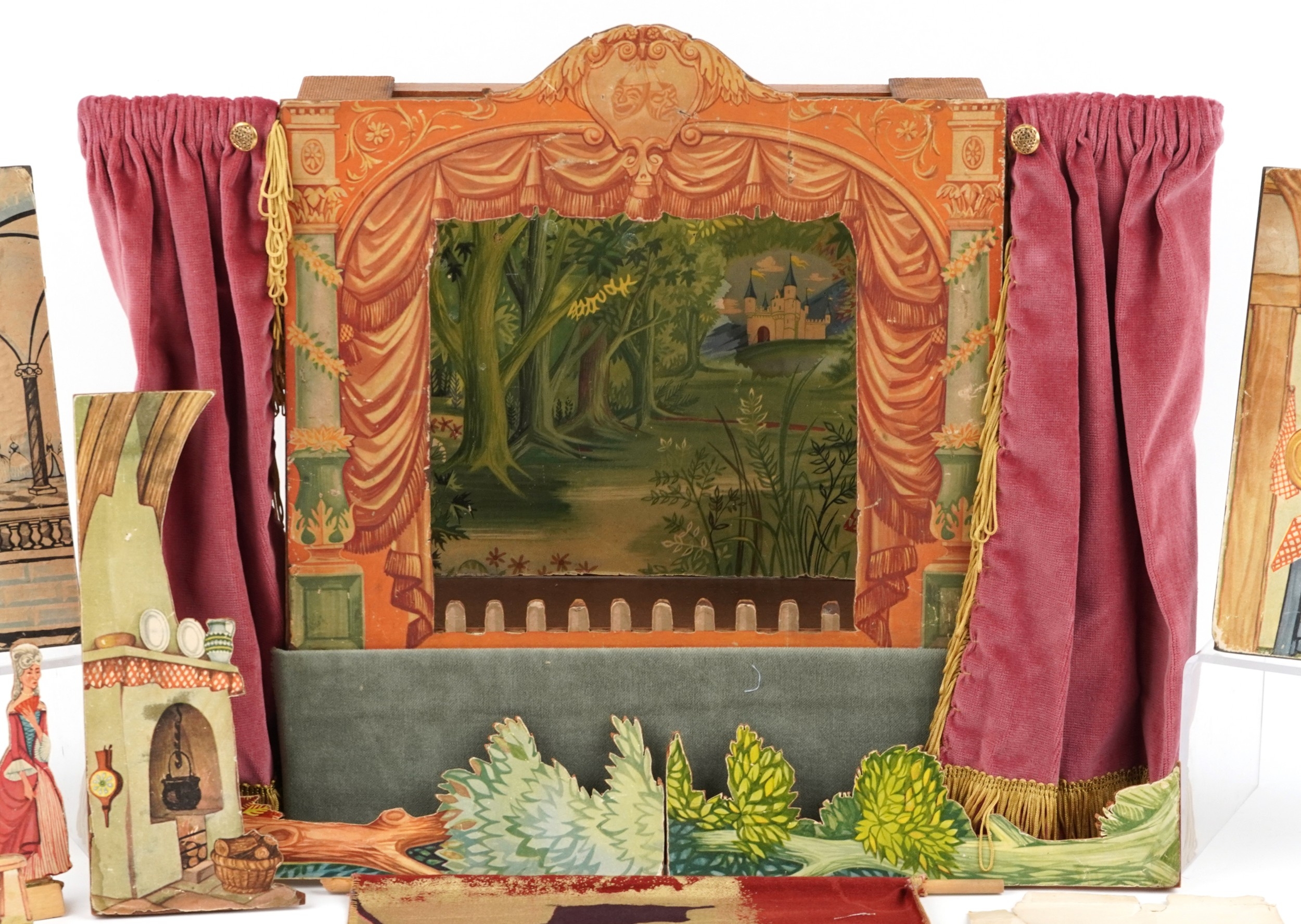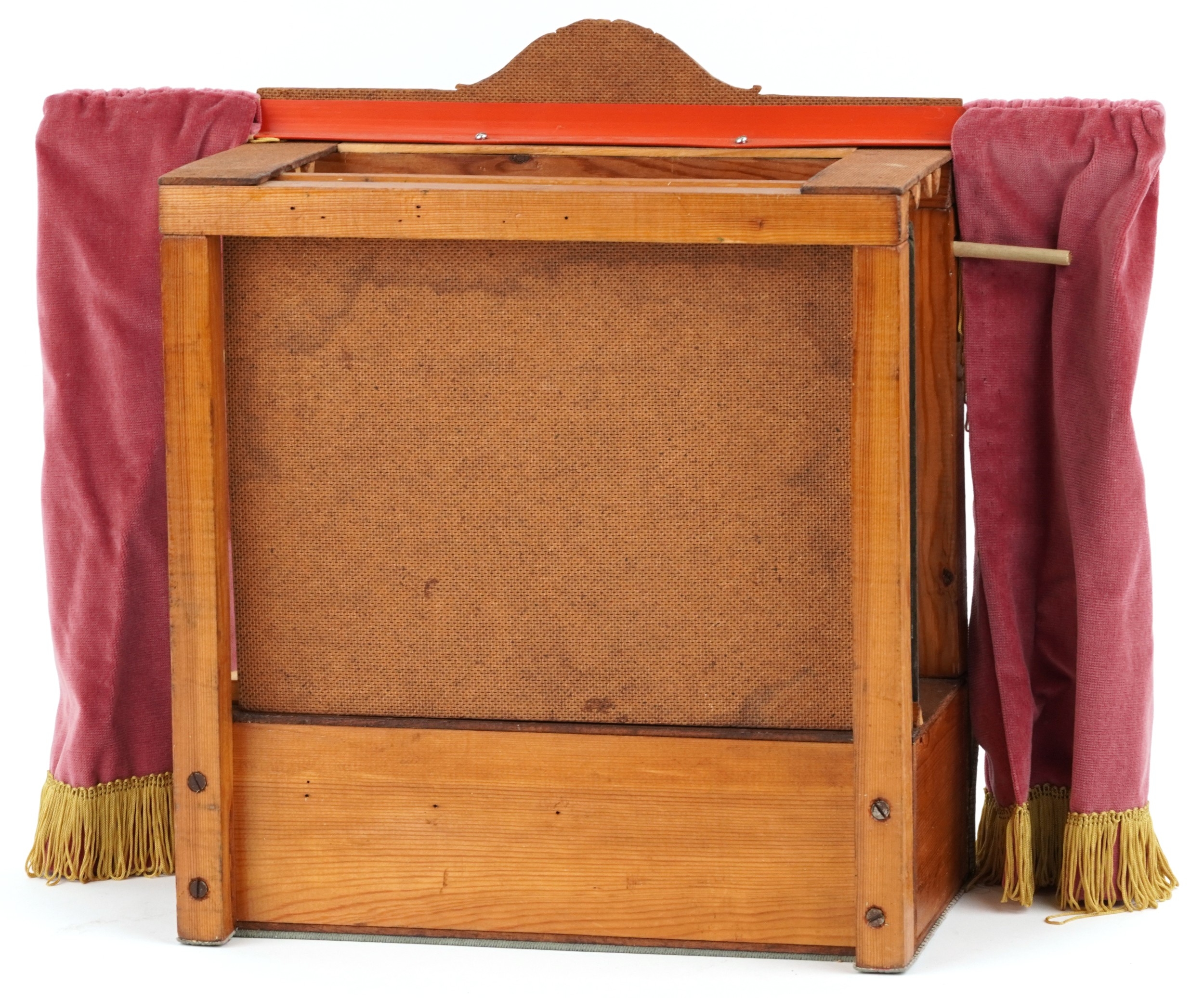 A Benjamin Pollock's Toy Theatre and puppets, with figures and props fitted with velour curtains, 40cm H x 52cm W x 18cm D.
