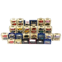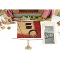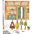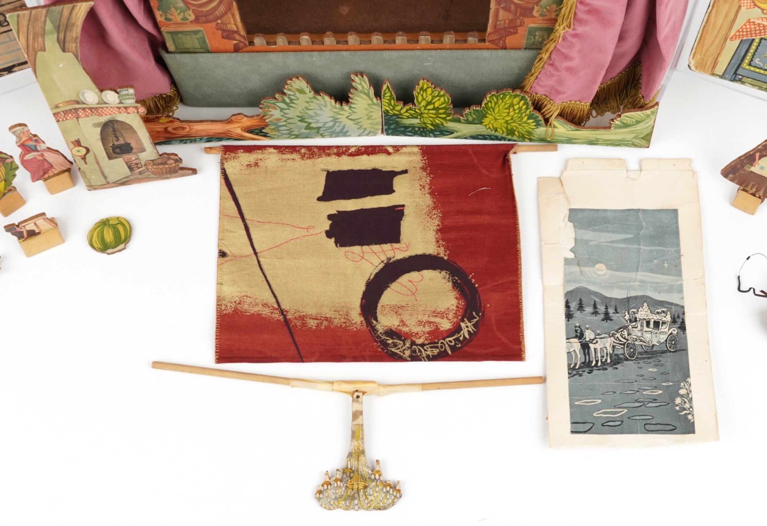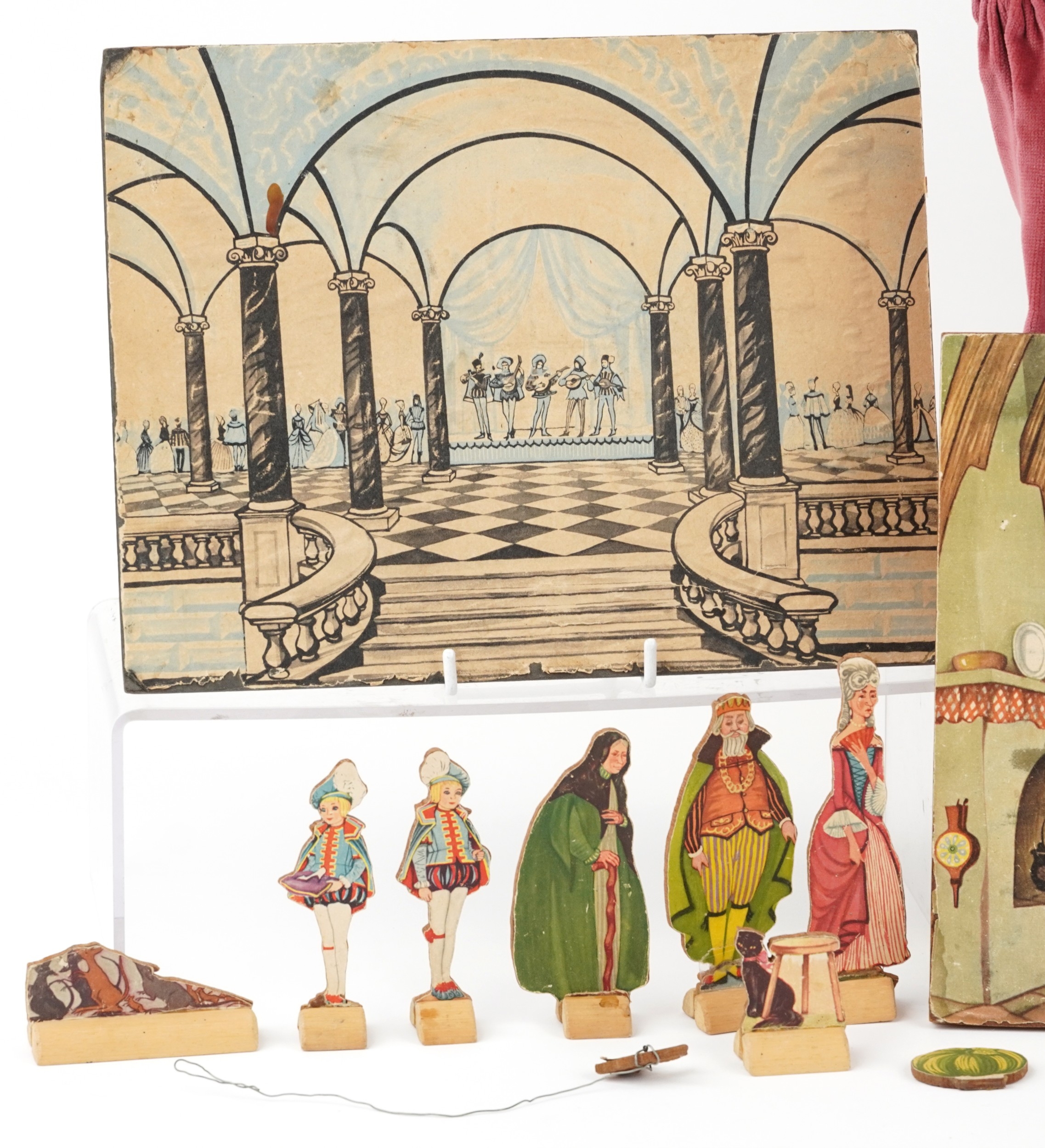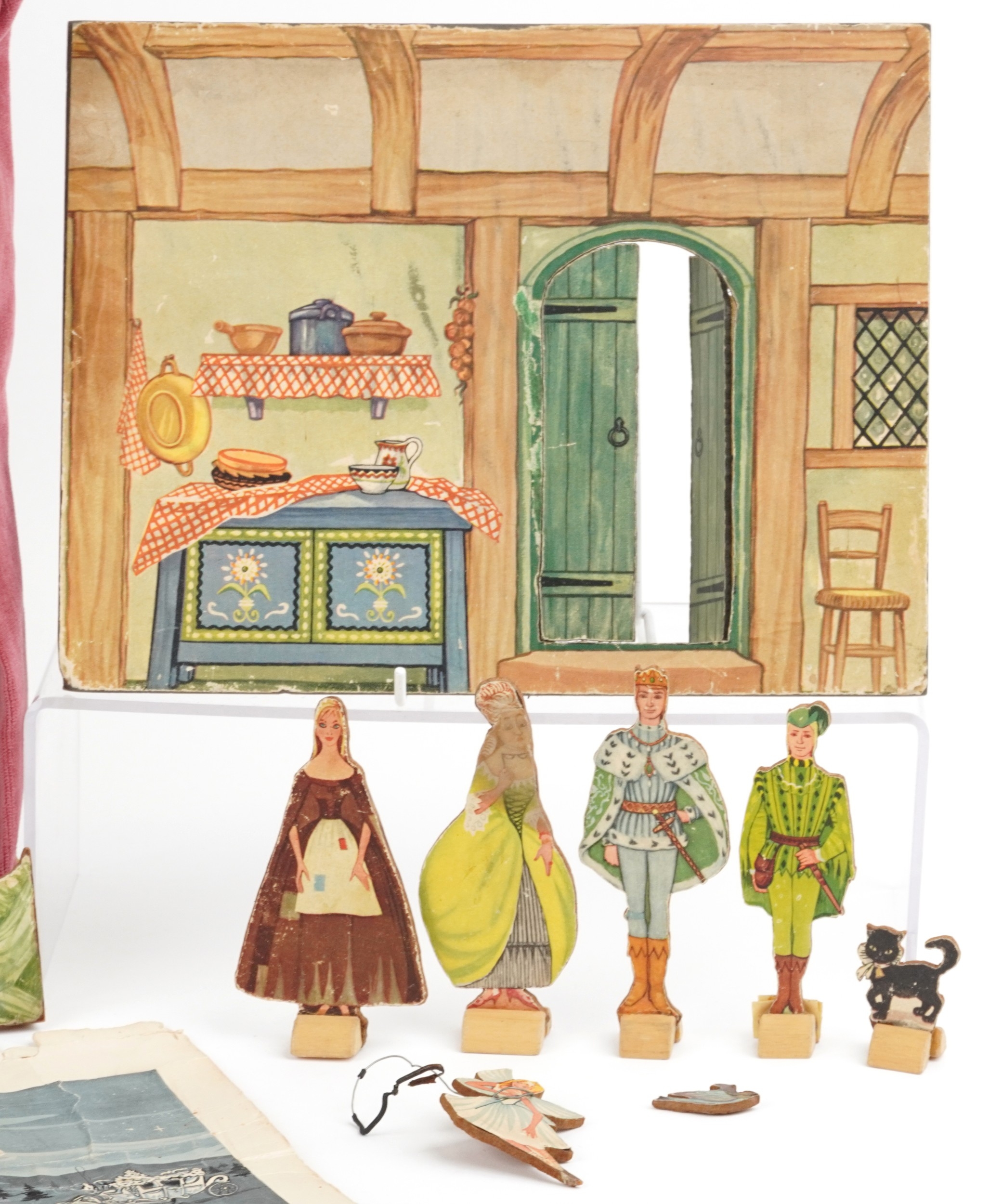 A Benjamin Pollock's Toy Theatre and puppets, with figures and props fitted with velour curtains, 40cm H x 52cm W x 18cm D.