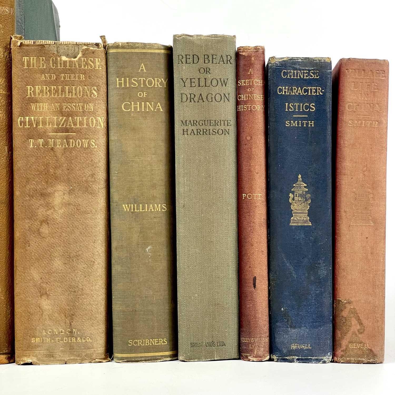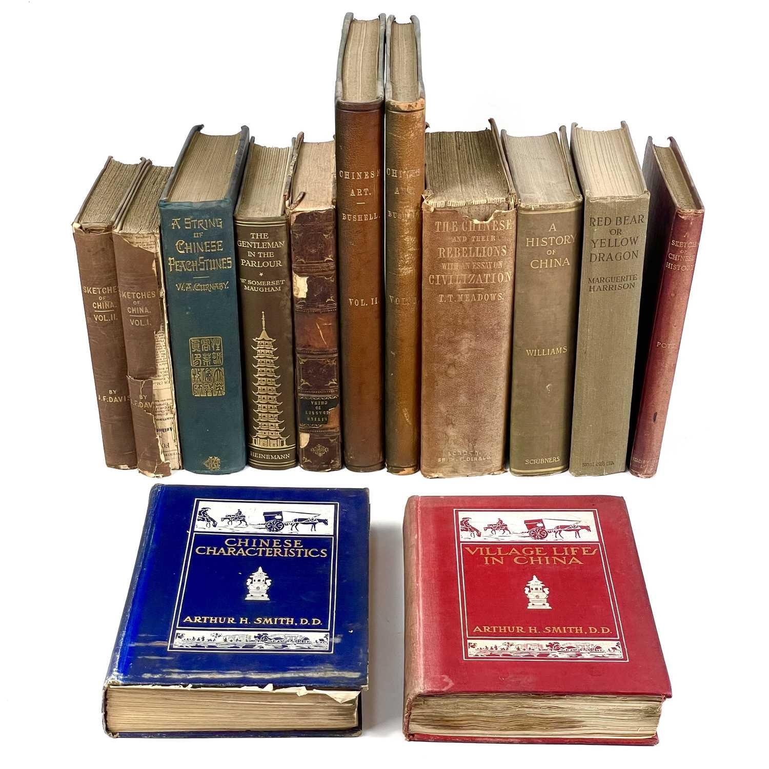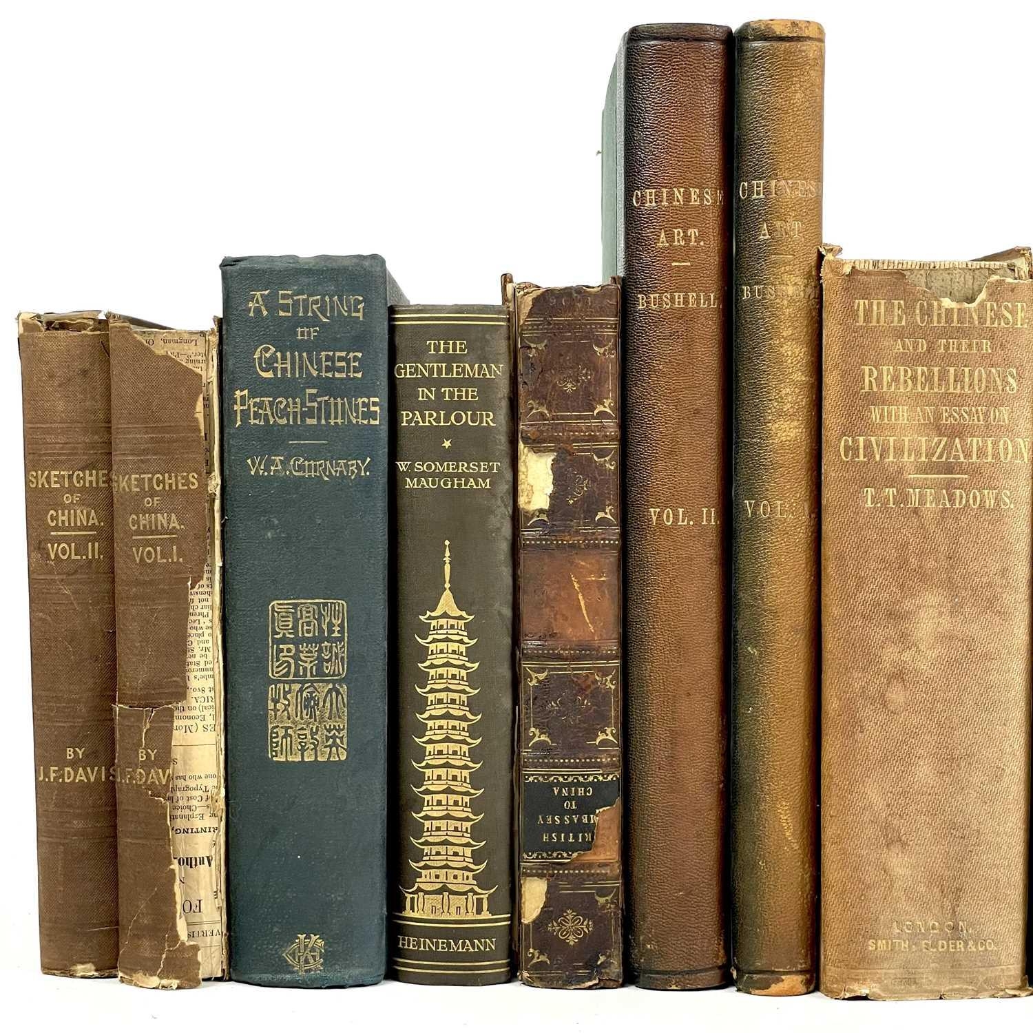 Thirteen works on the culture and history of China. STEPHEN W. BUSHELL. 'Chinese Art,' two volumes, large paper edition, 104 illustrations, printed for His Majesty's Stationary Office by Wyman and Sons, London, 1905; AENEAS ANDERSON. 'A Narrative of the British Embassy to China, in the year 1792, 1793, and 1794...,' third edition, debound front board, clean and tight textblock, J. Debrett, London, 1796; JOHN FRANCIS DAVIS. 'Sketches of China; Partly During an Island Journey of Four Months, Netween Peking, Nanking, and Canton; With Notices and Observations Relative to the Present War,' two volumes, Vol I lacks front board with loose spine cloth panel, clean and tight textblocks, Charles Knight & Co, London, 1841; THOMAS TAYLOR MEADOWS. 'The Chinese and Their Rebellions,' original cloth, loss to top spine panel, fold out map frontis, Smith, Elder & Co, London, 1856; F. L. HAWKS. 'A Sketch of Chinese History,' original cloth, Kelly and Walsh, Shanghai, 1903; W. SOMERSET MAUGHAM. 'the Gentleman in the Parlour,' new impression, staining to original cloth, some spotting, William Heinemann, London, 1930; With five other works. (13)