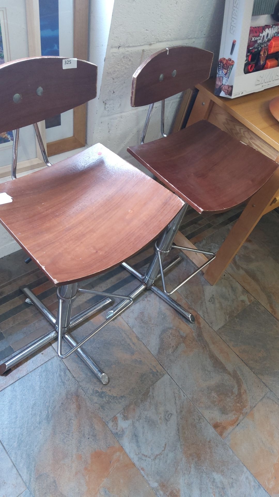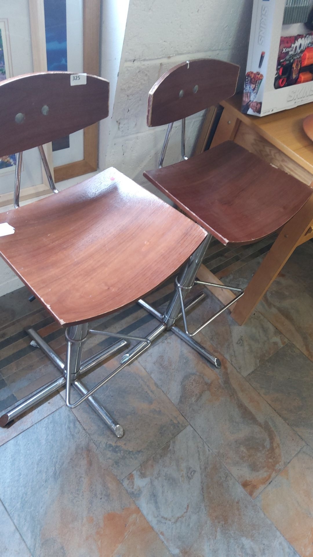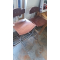 Pair of mid-century modern stools with wooden seats and metal frames.