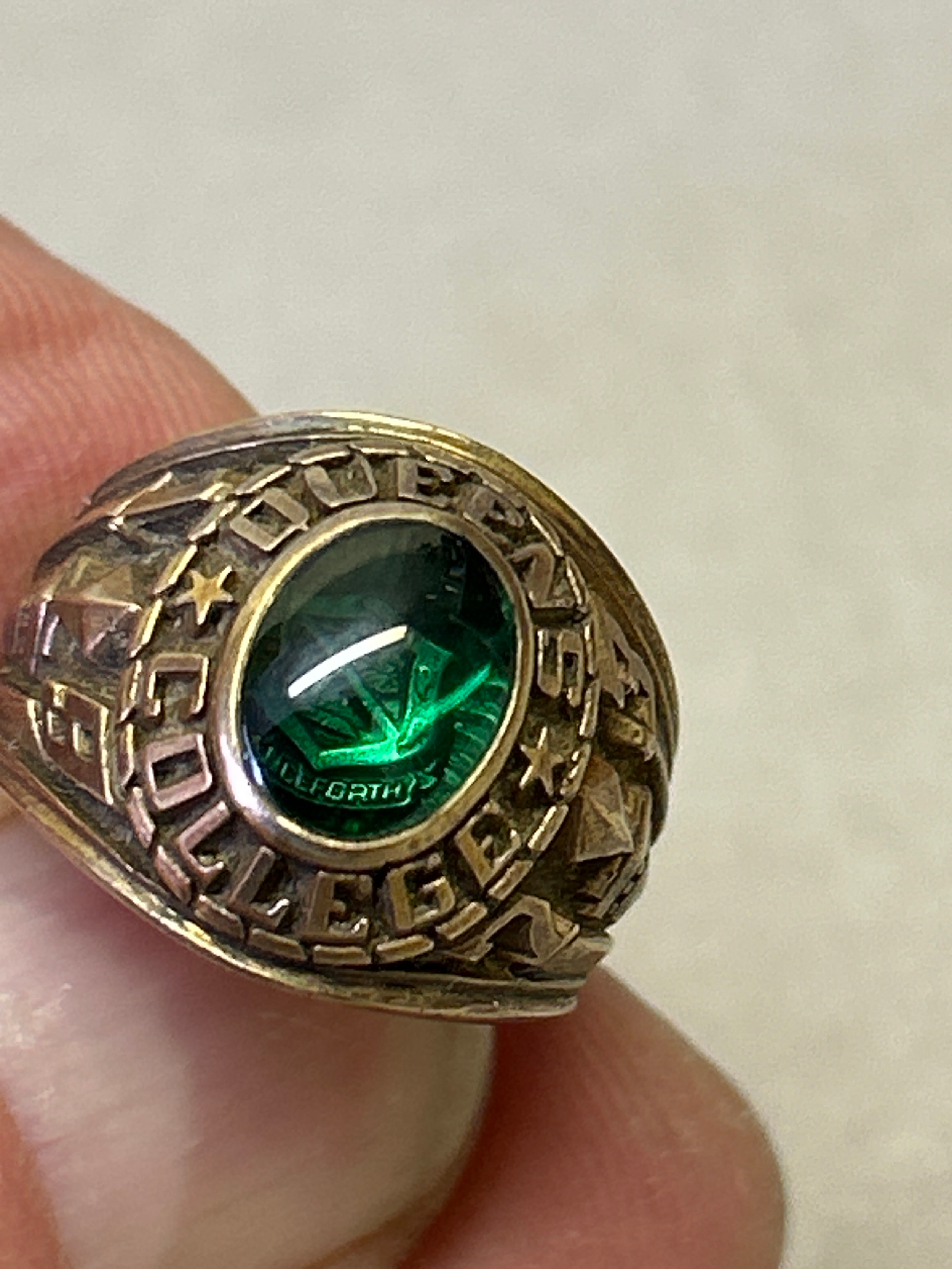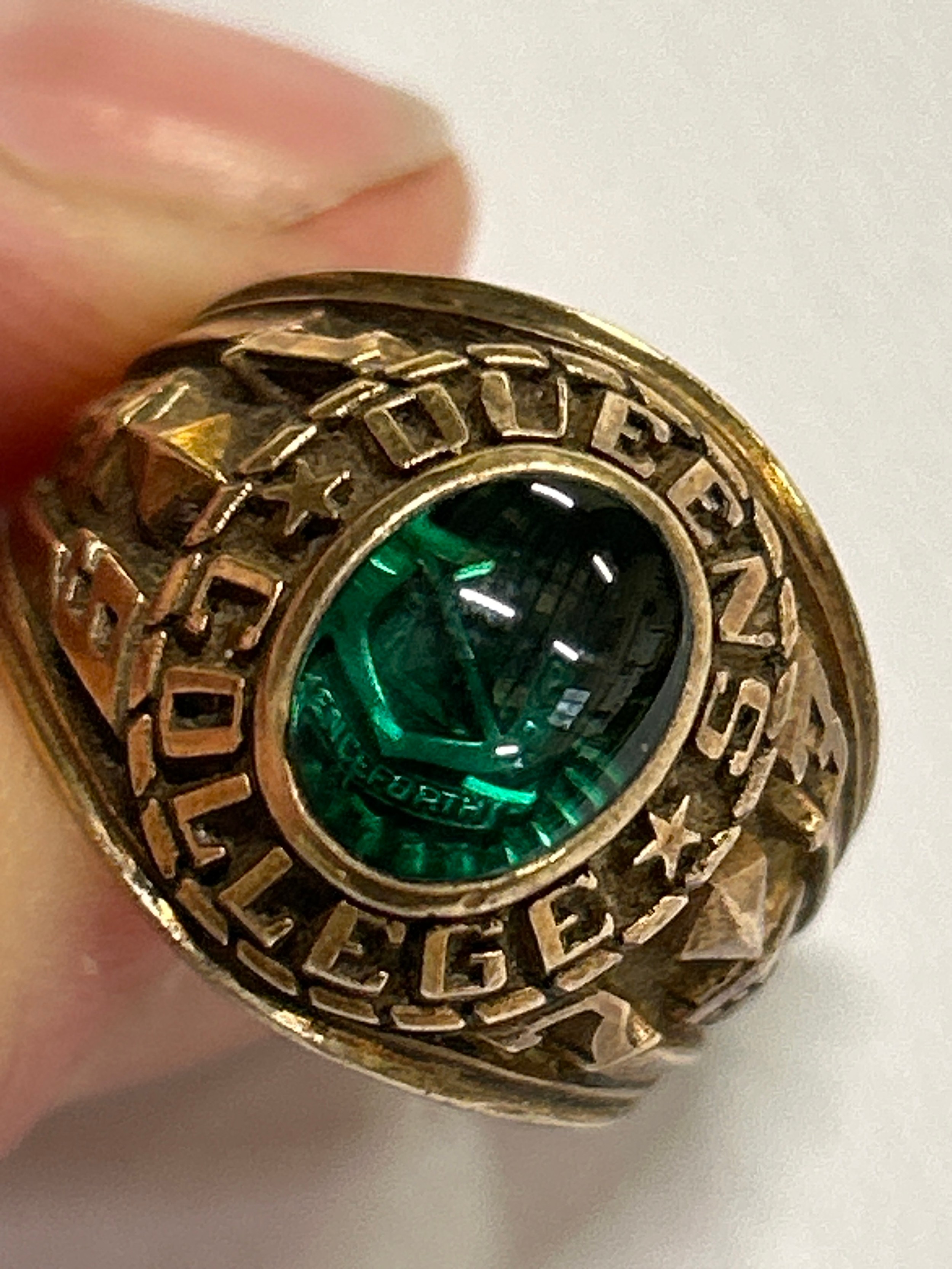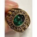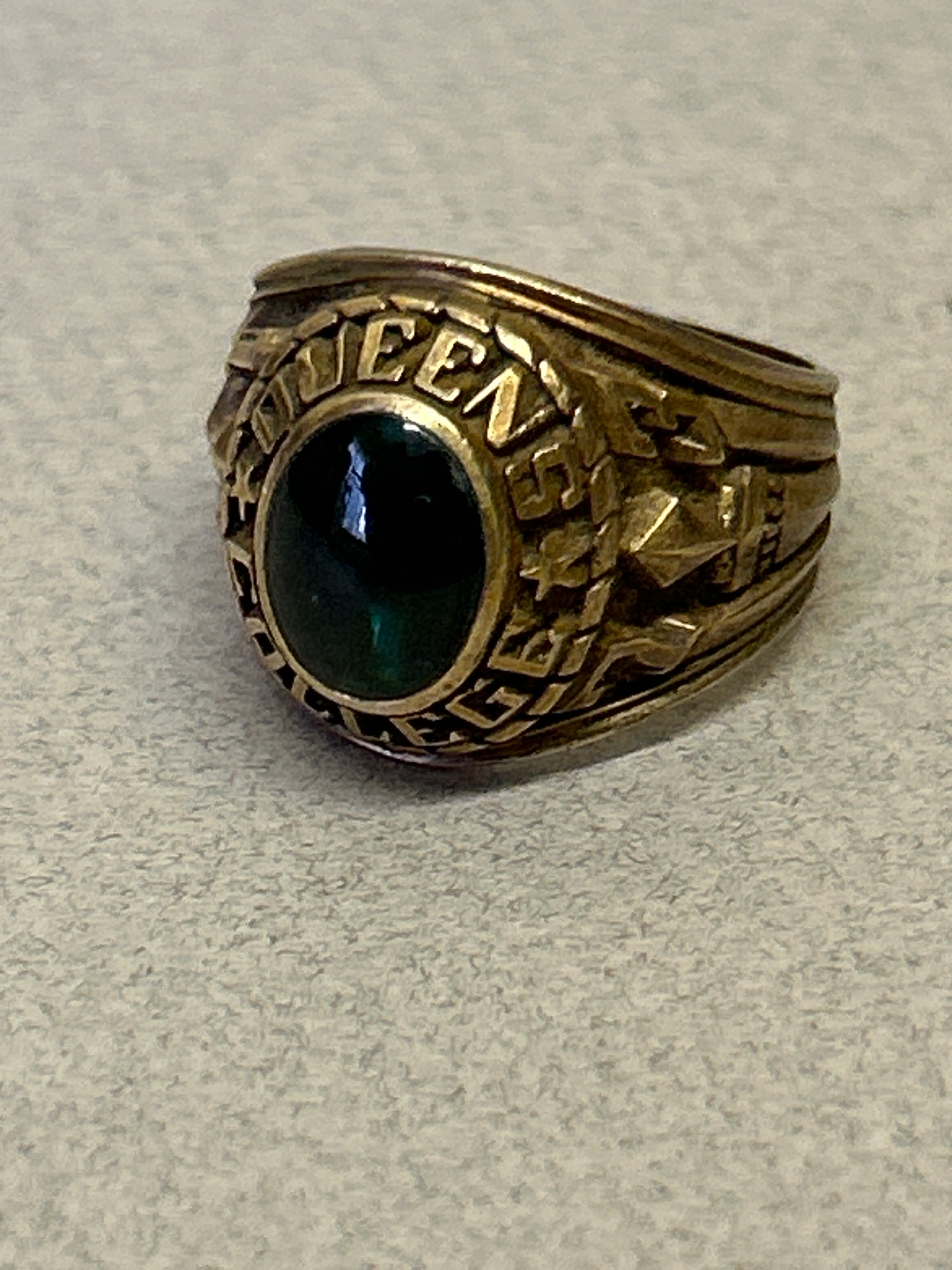 A rare American “Balfour” ring, in 10K gold with green cabochon crystal and crest for Queens College Bahamas (A private Methodist school founded in 1870). Dated 1923 to the shoulder. , with engraved students initials inside “JAM”. Size M, 9.7 grams