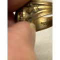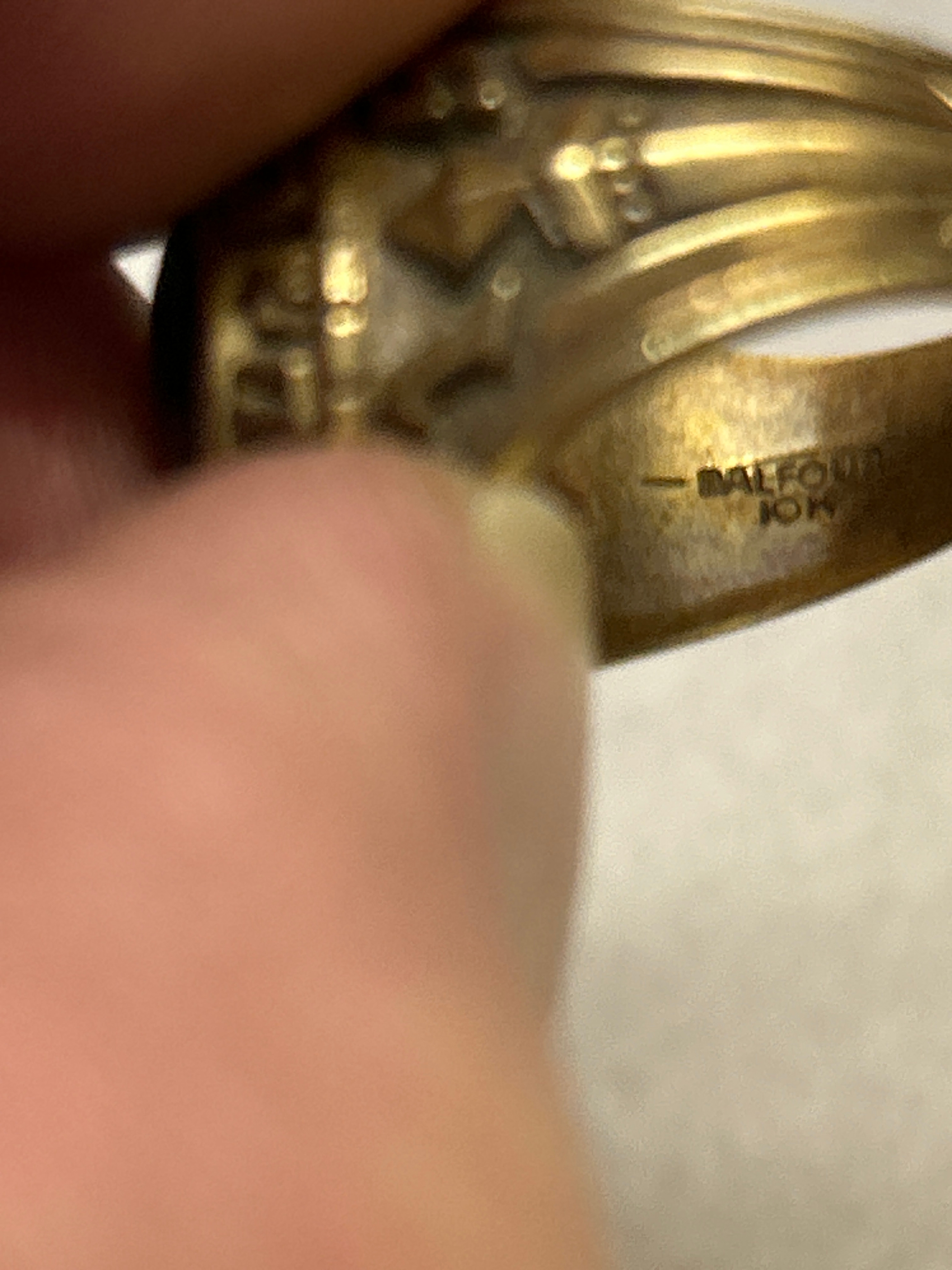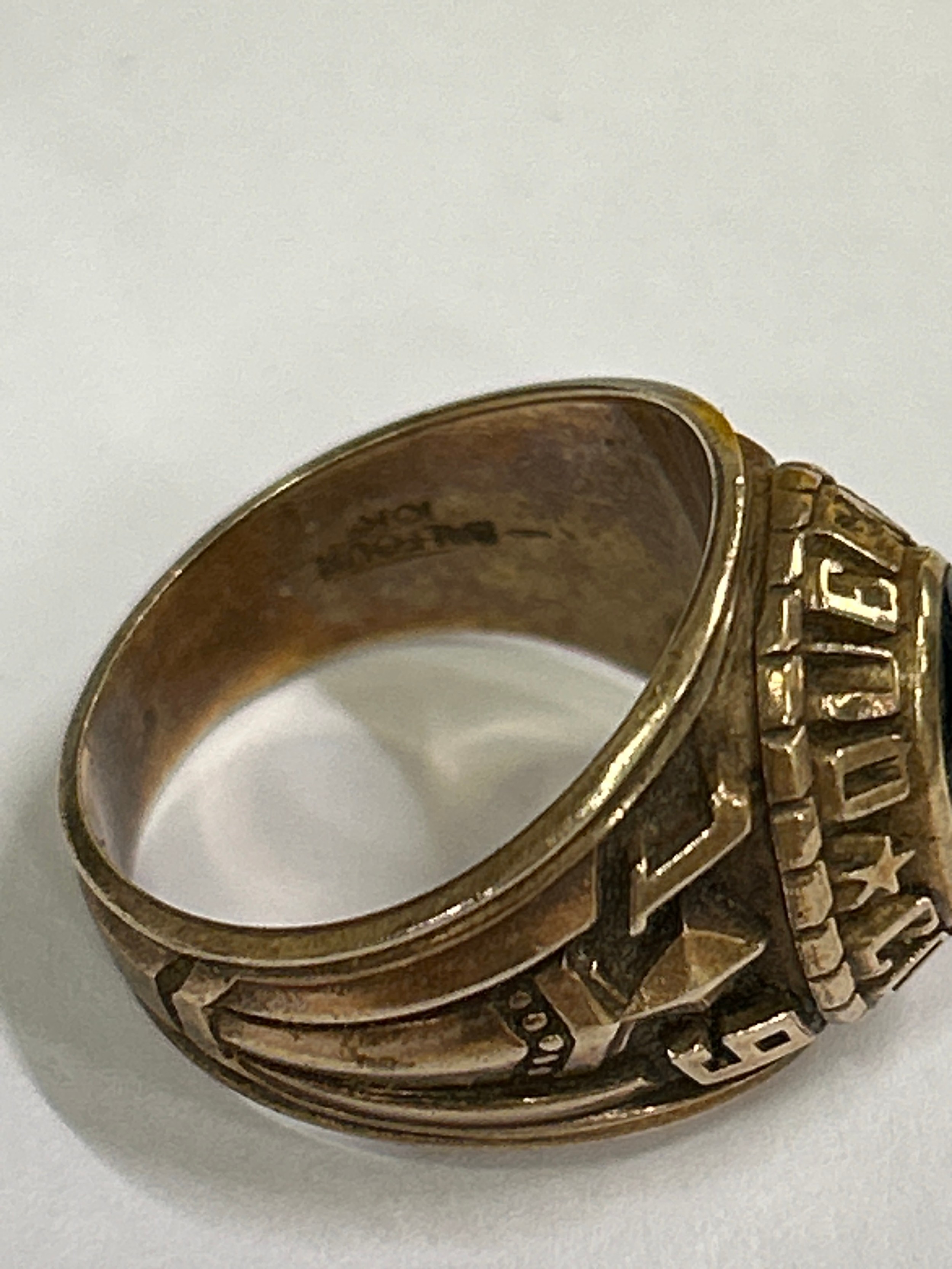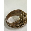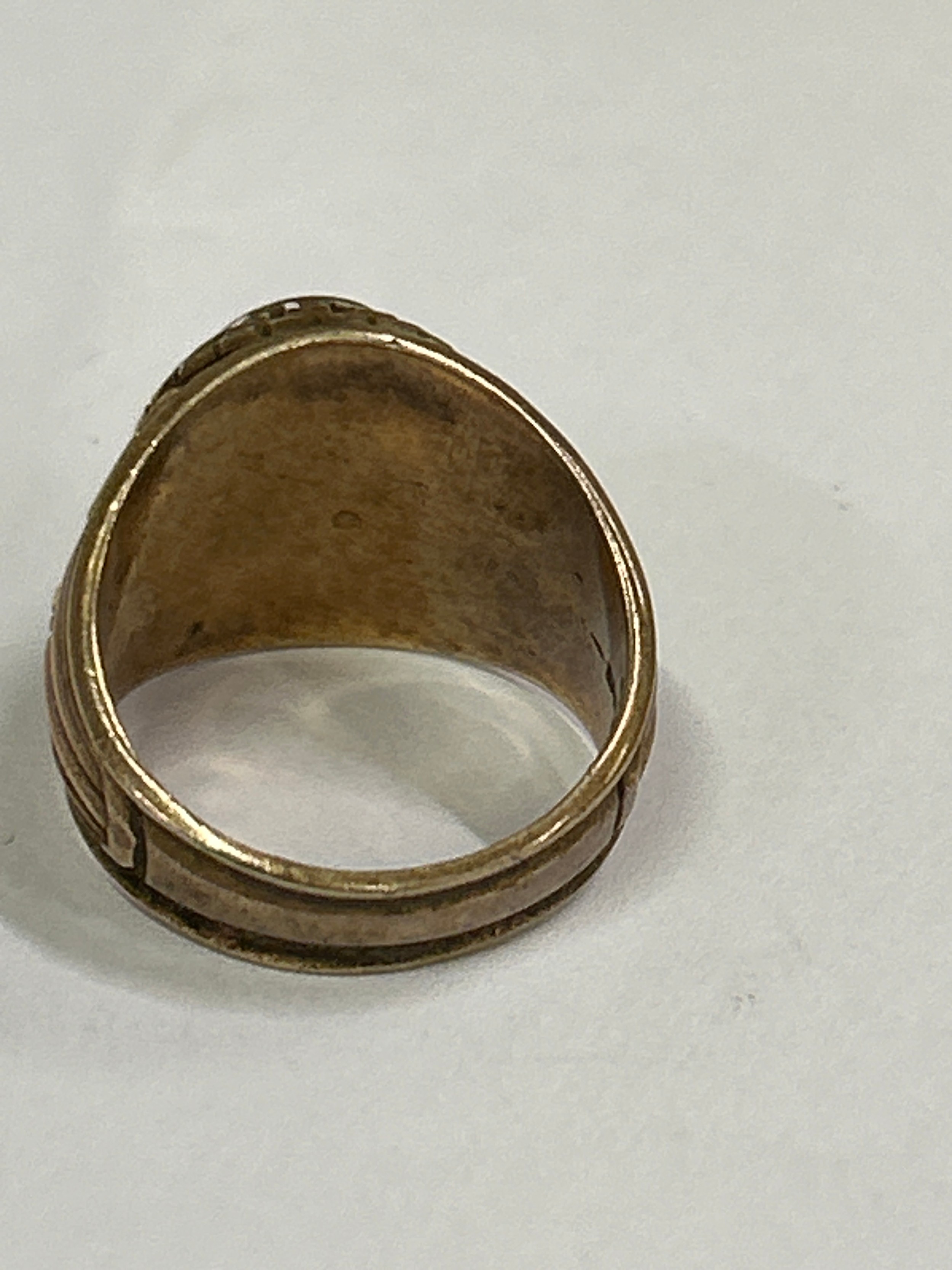 A rare American “Balfour” ring, in 10K gold with green cabochon crystal and crest for Queens College Bahamas (A private Methodist school founded in 1870). Dated 1923 to the shoulder. , with engraved students initials inside “JAM”. Size M, 9.7 grams