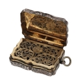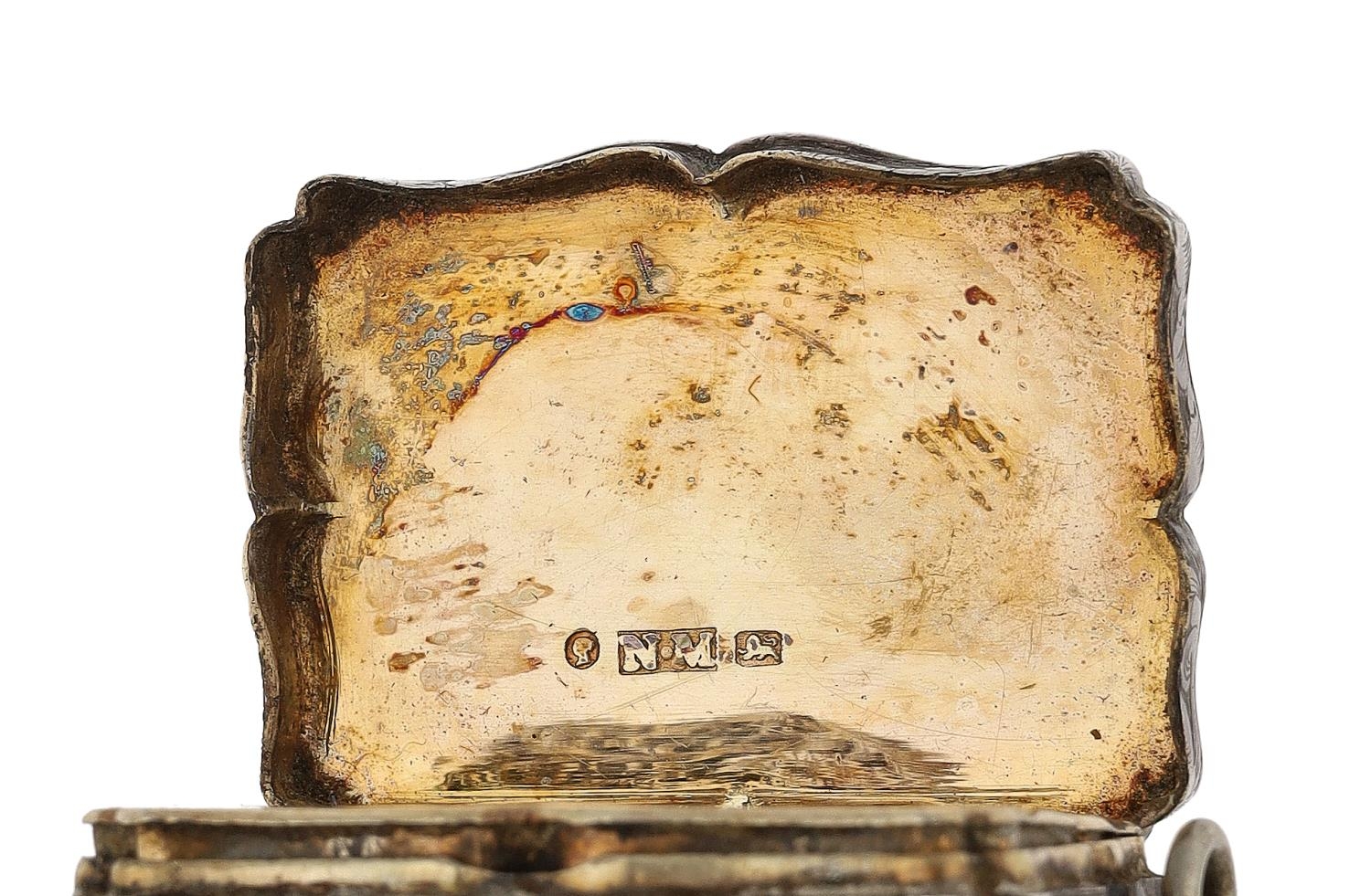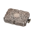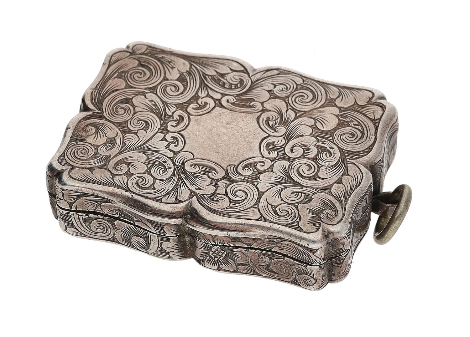 Victorian silver vinaigrette, of shaped rectangular form with engraved decoration, gilt interior, suspension ring, Nathaniel Mills, Birmingham 1840, 2" long, 30gm