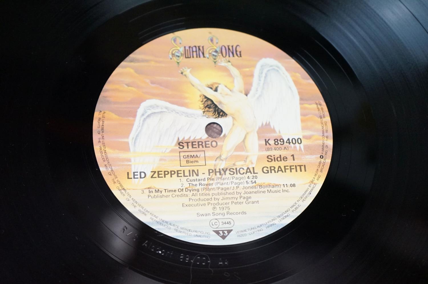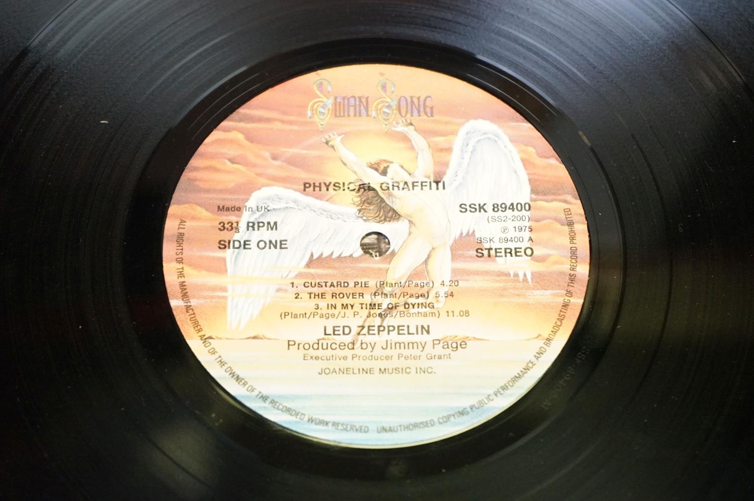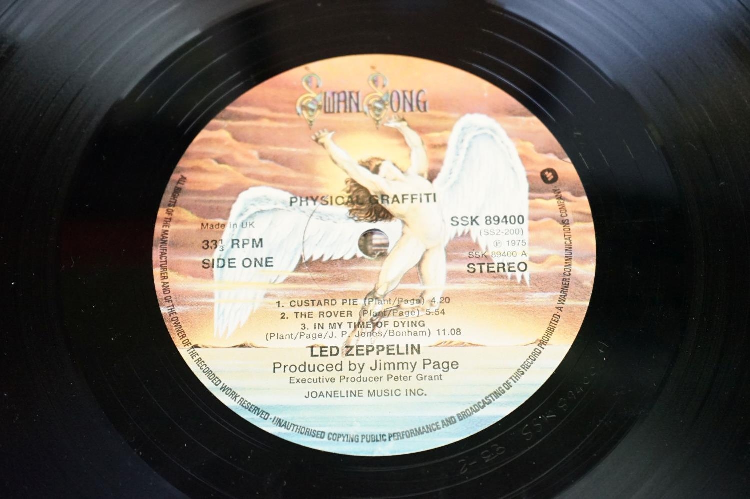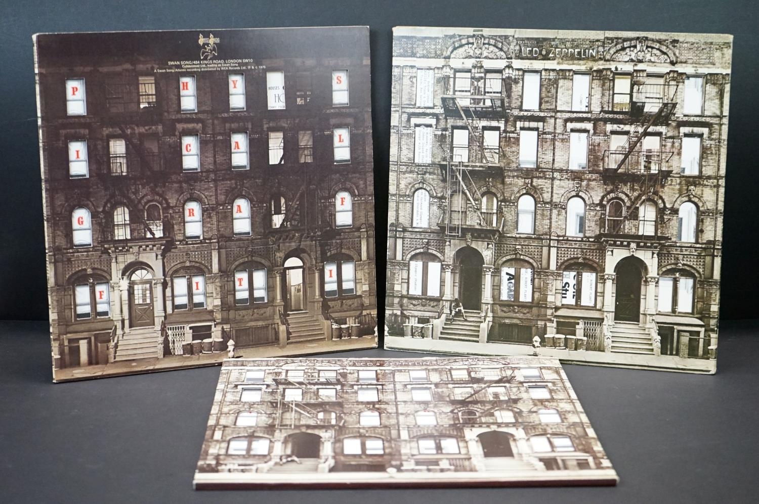 Vinyl - Led Zeppelin - Physical Graffiti 3 copies to include 1) 1st pressing with no Warner logo on rim text, A1 / B4 / C1 / D1 matrices, thick Insert, with a single fold to the bottom (SSK 89400) VG+ / VG+ / EX- inners and insert EX, 2) Warner logo on rim text, A / B / C / D matrices, thick insert (SSK 89400) VG++ / VG / VG++ inners and insert EX, 3) German Pressing A 4 / B 2 / C 2 / D 3 matrices, thin Light Coloured Printed Inners and Thin white paper folded insert (SSK 89 400) EX / EX / EX inners and insert EX