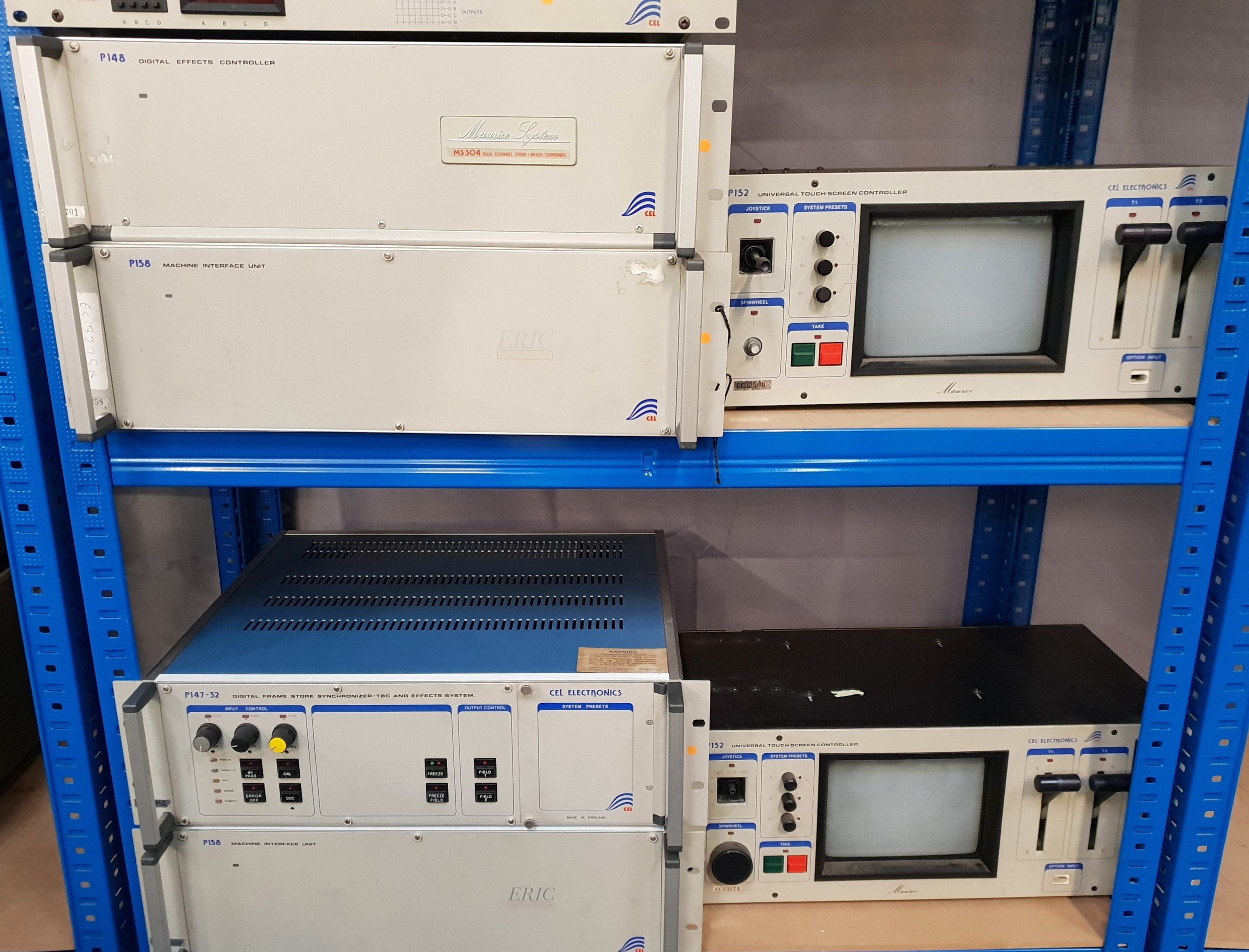 comprising P148 Digital effects controller, further labelled Maurice System MS304 Dual channel zoom + Mixer combiner serial no 33701, P147-32 Digital frame Store Synchronizer -TBC and Effects system, two P158 Machine interface units, serial no 05009 & 32758, and a P169V Digitally controlled 8x4 Cross point routing switcher, serial number 00570, and two P152 Universal Touch Screen controllers, serial number 35200 & 33574 (7)
