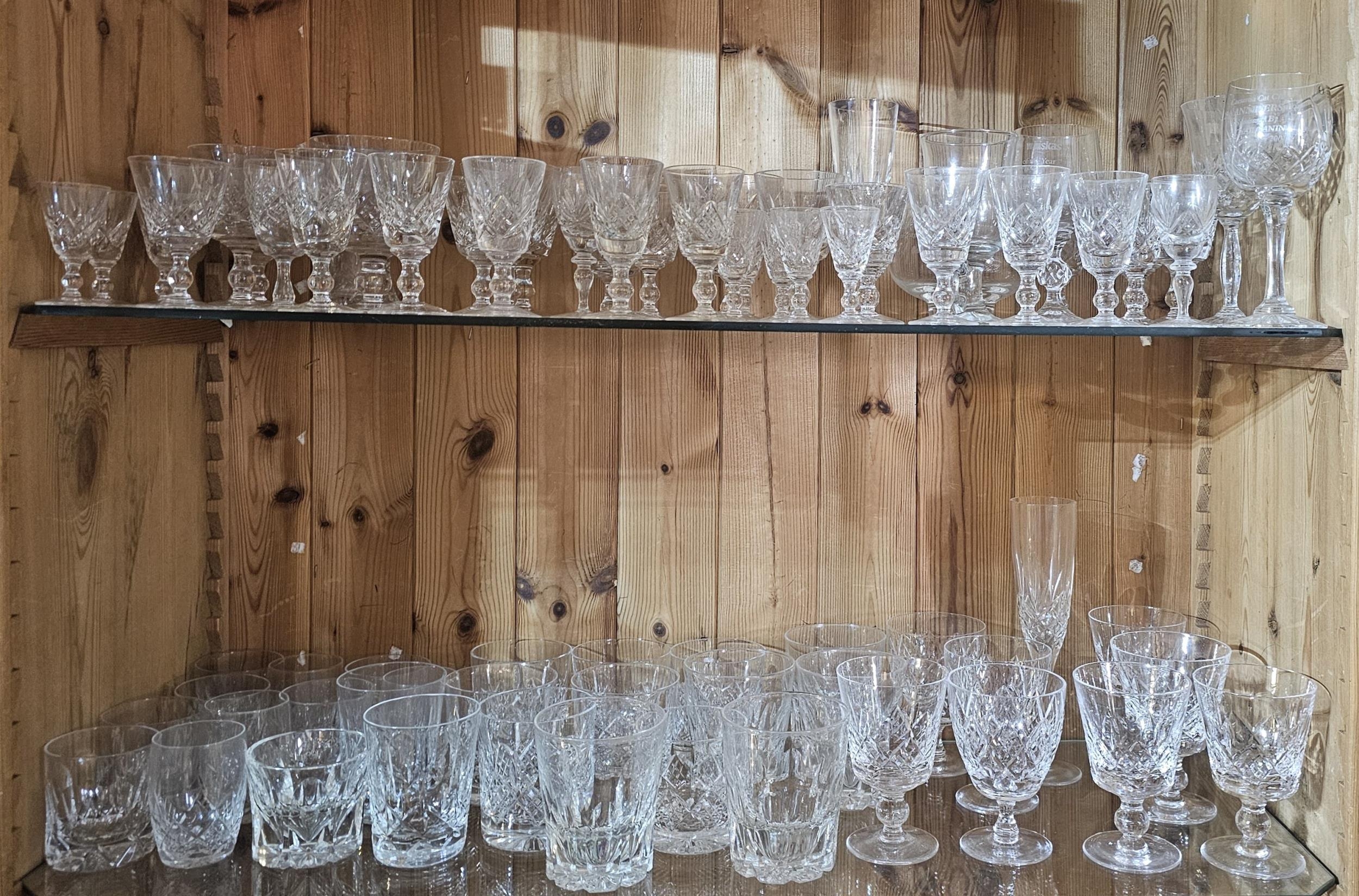 Featuring various diamond and wedge cut patterns, to include champagne flutes, graduated wine glasses, sherry glasses, and a collection of highball and whiskey tumblers.