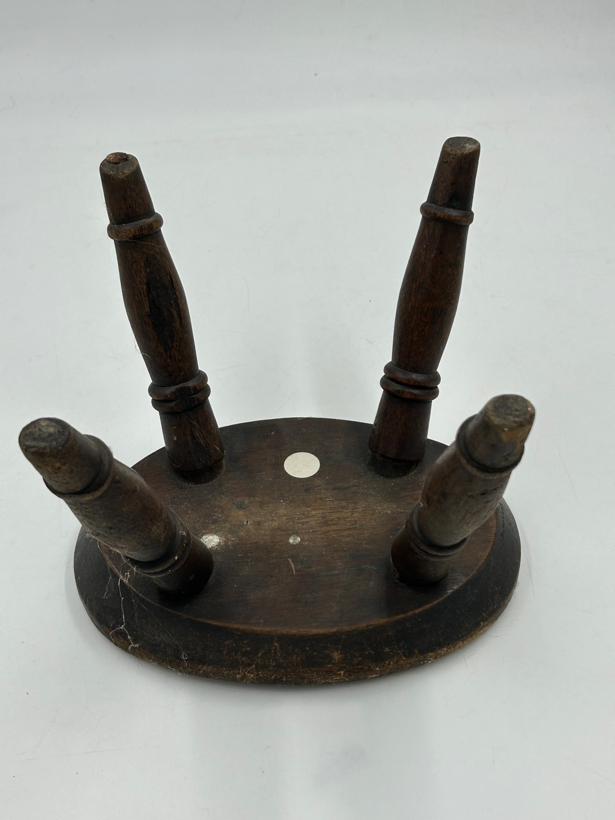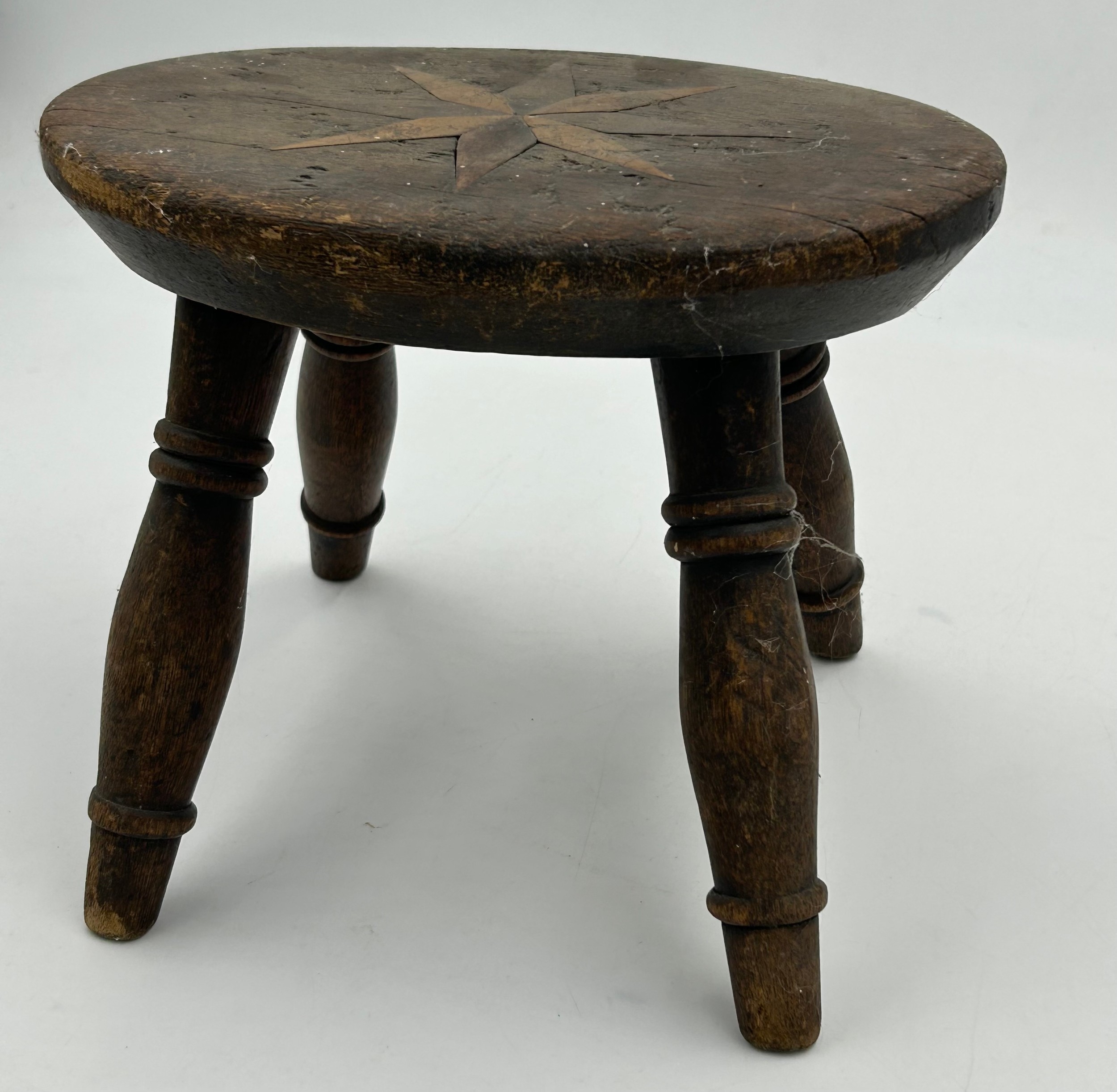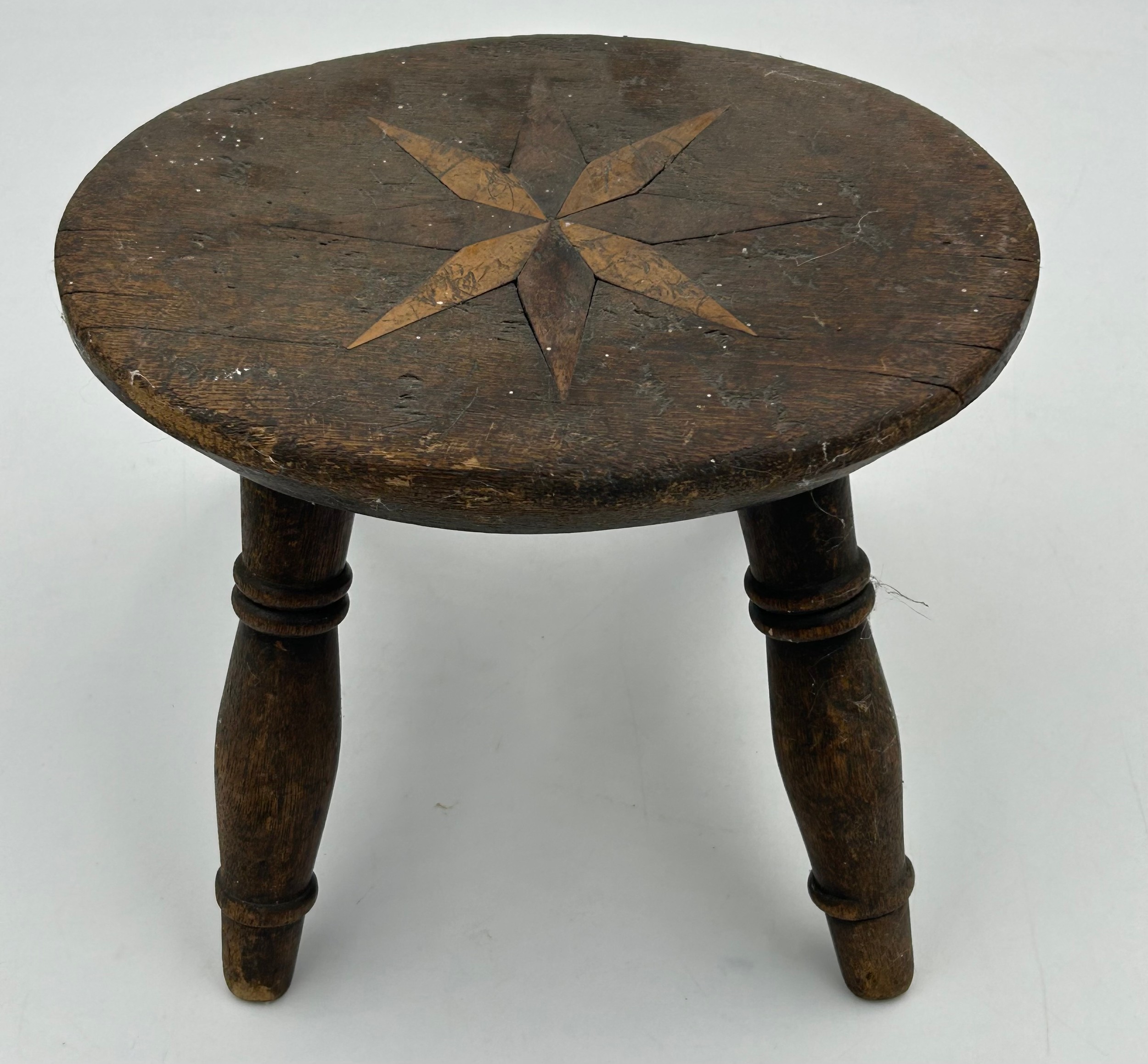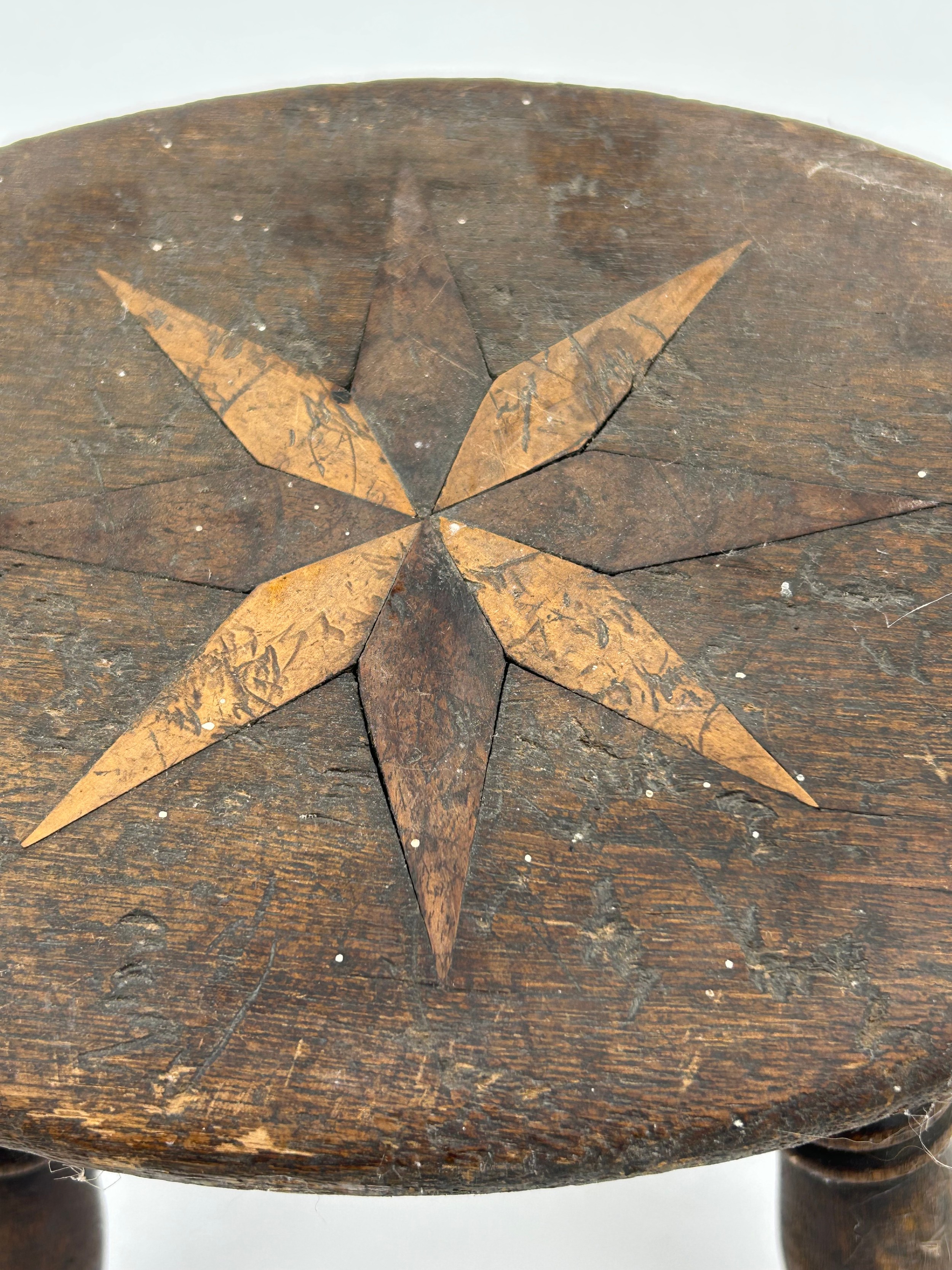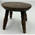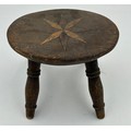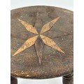 A small wooden stool with a star design inlaid to the top, 18.5cm h x 23cm x 17cm seat.