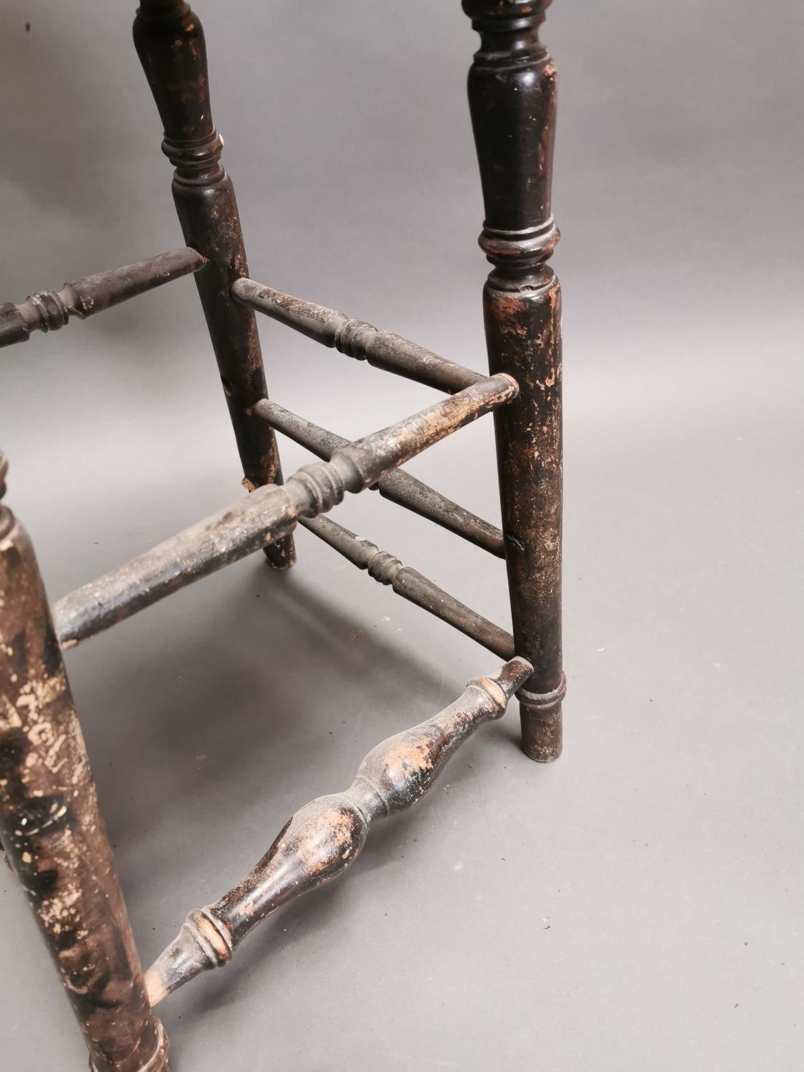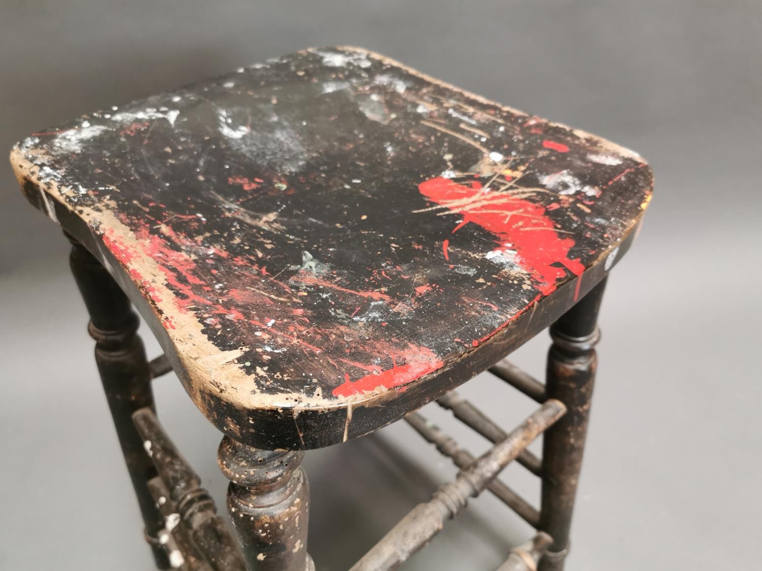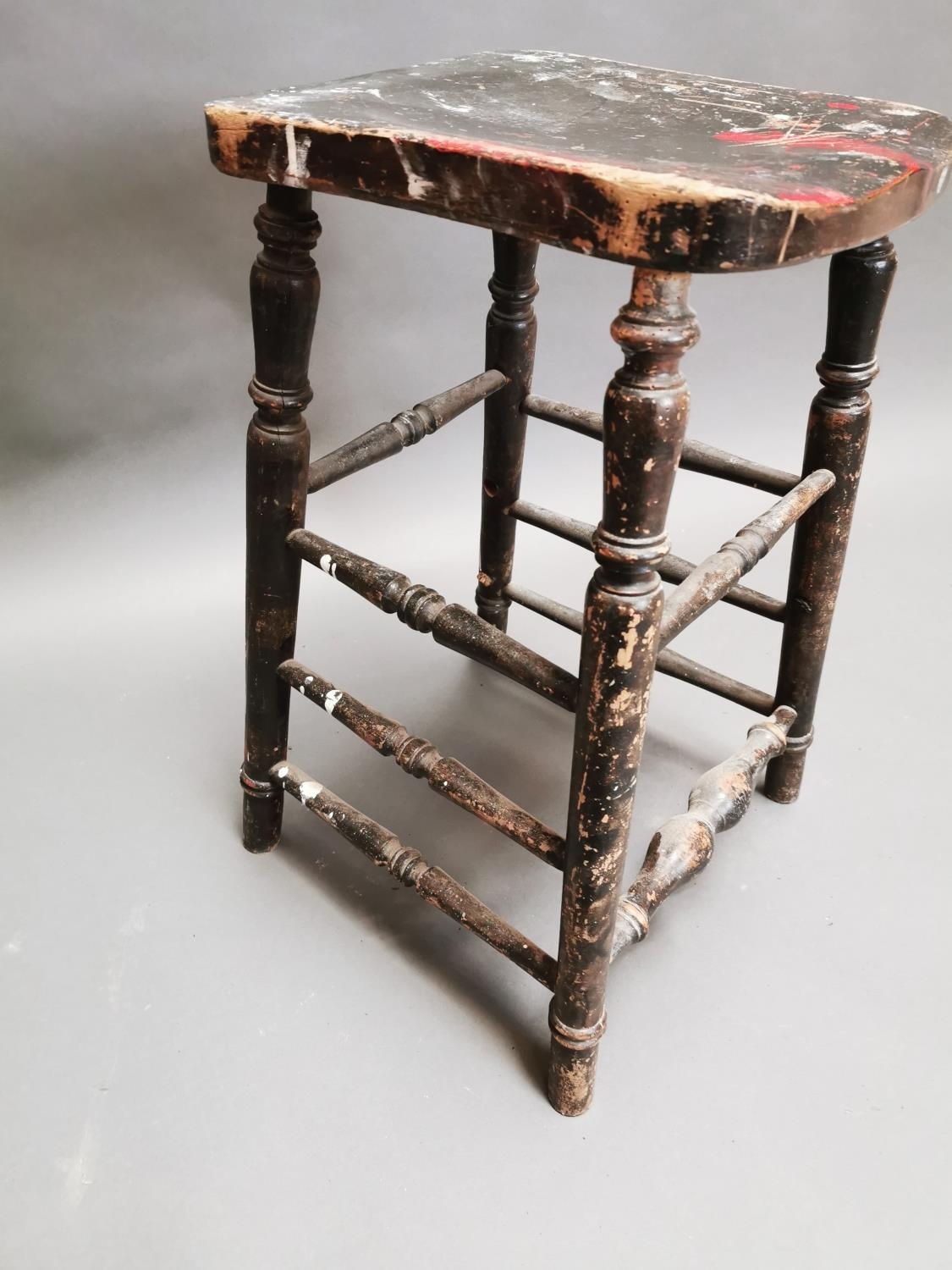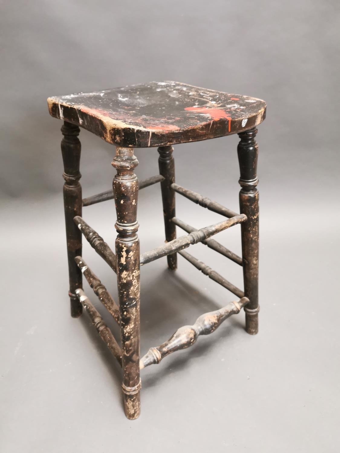 Early 20th C. painted pine counter stool on turned legs {64 cm H x 33 cm W x 28 cm D}.
