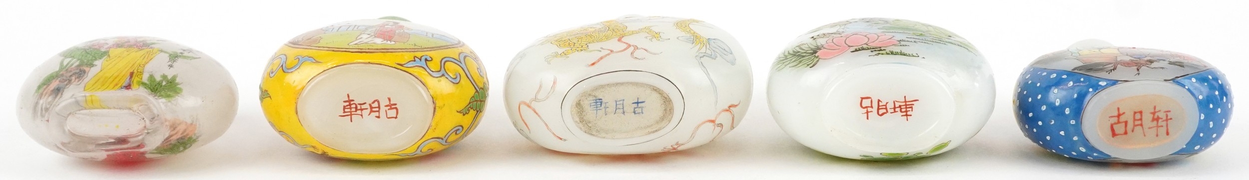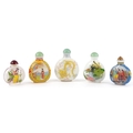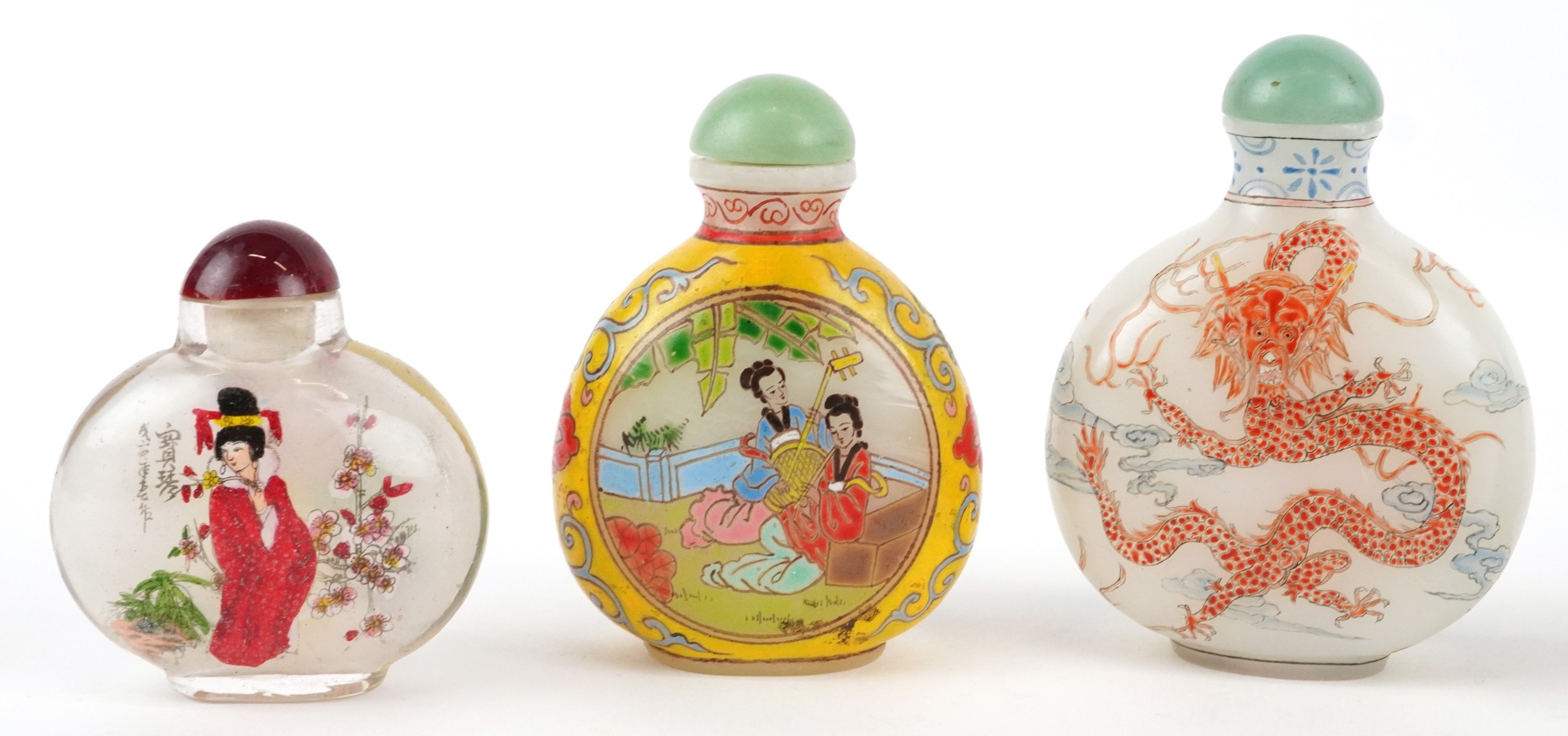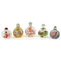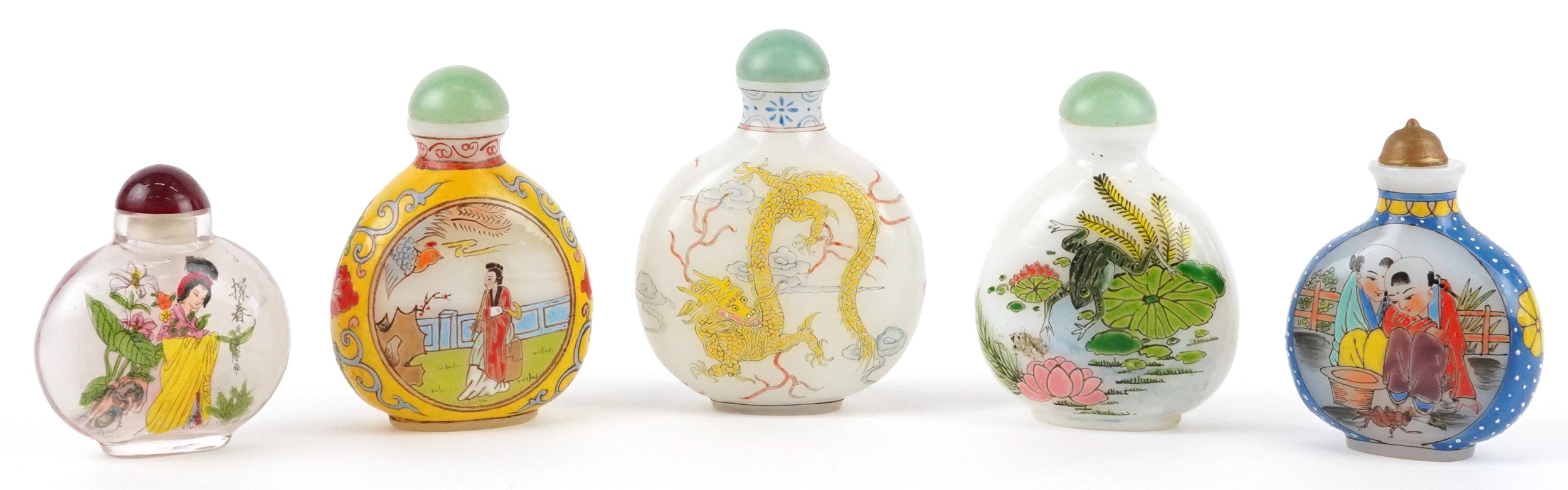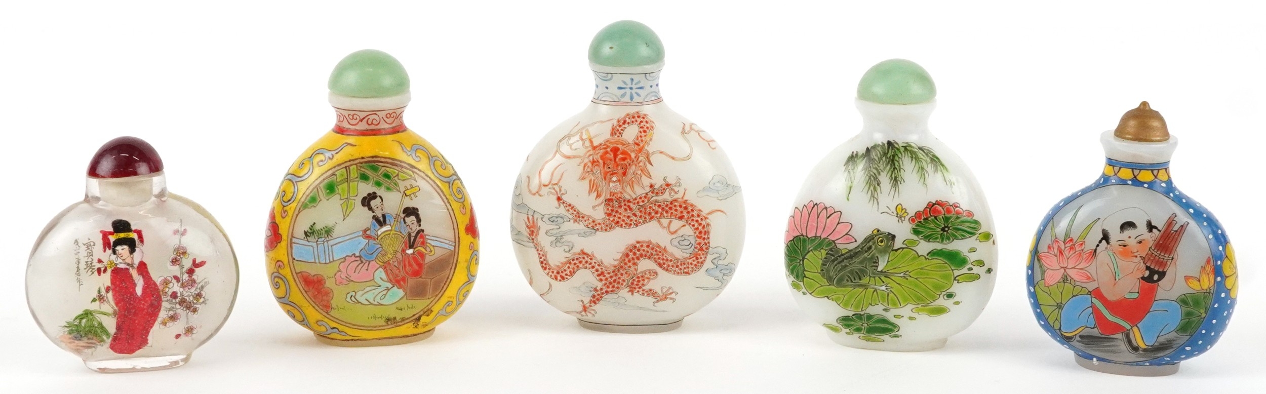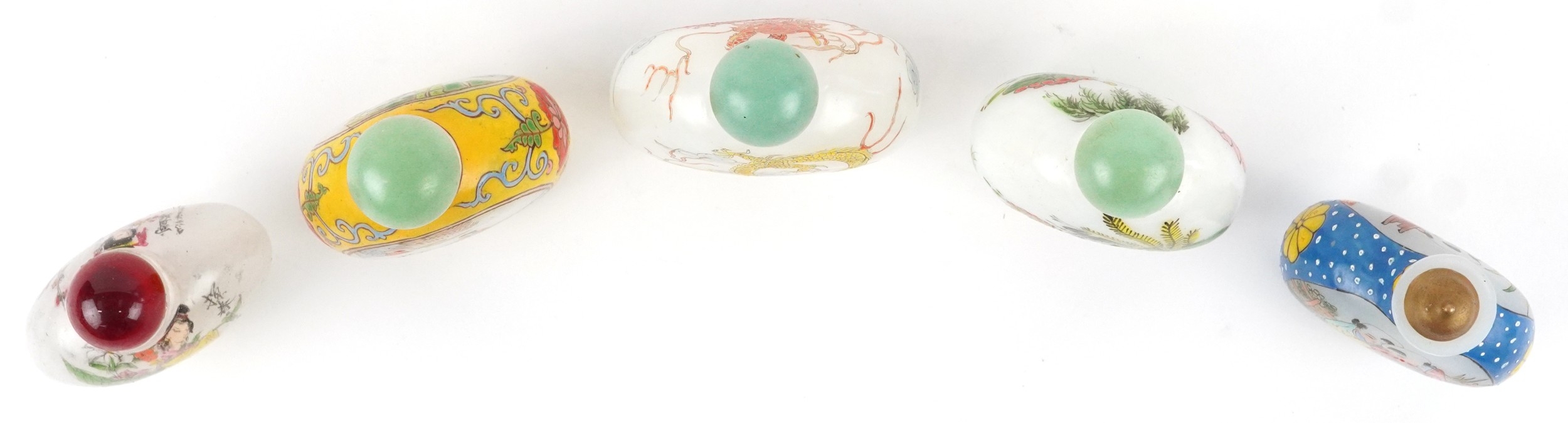 Five Chinese glass snuff bottles and stoppers, each with hand painted decoration including dragons and figures, the largest 8cm high.