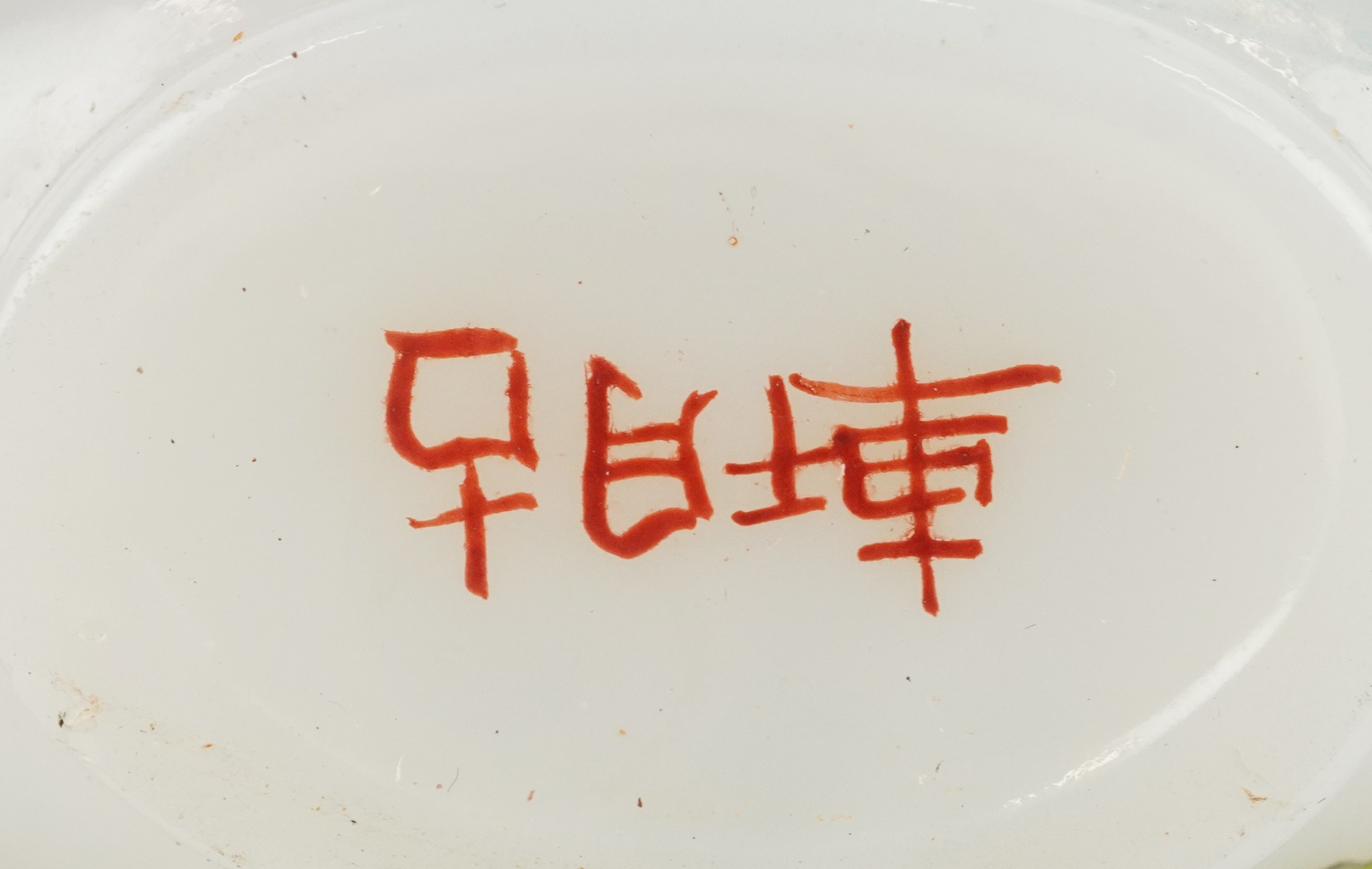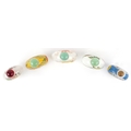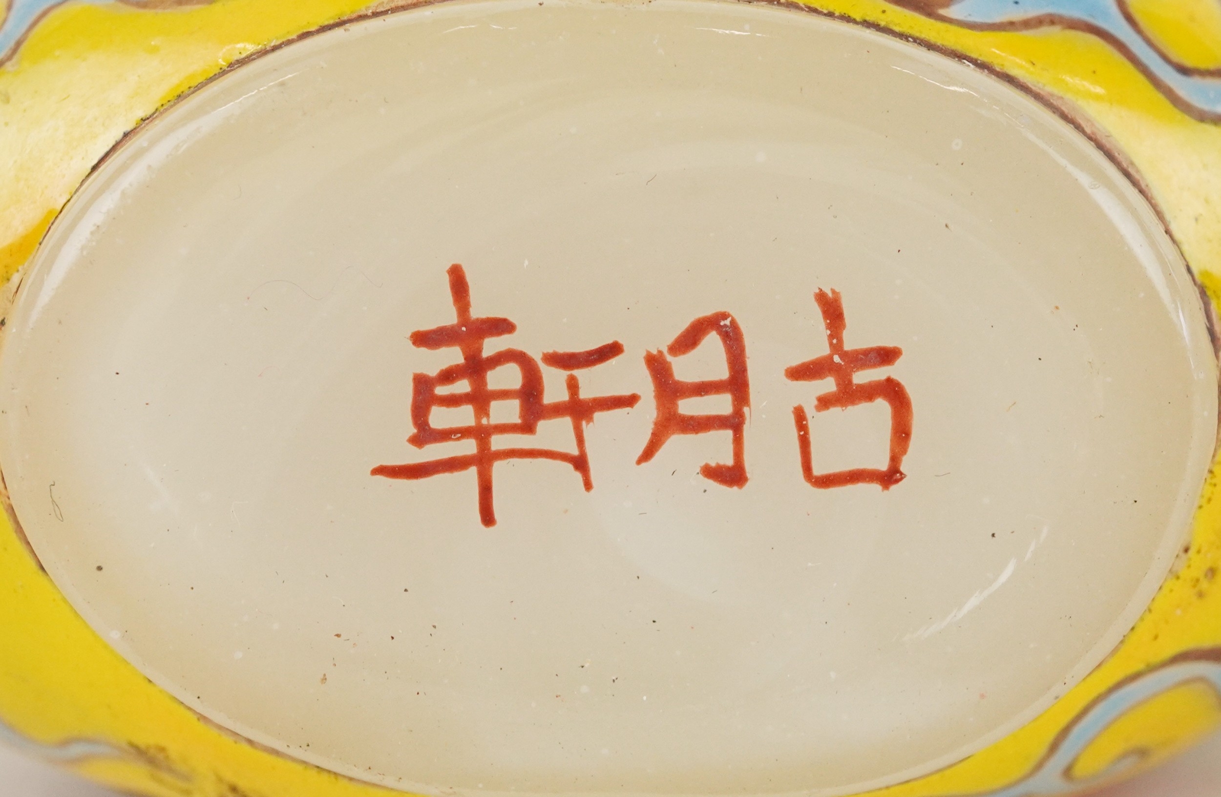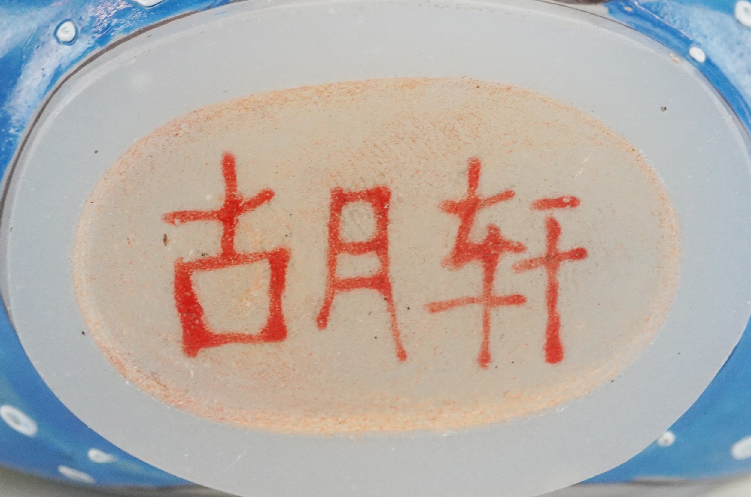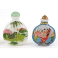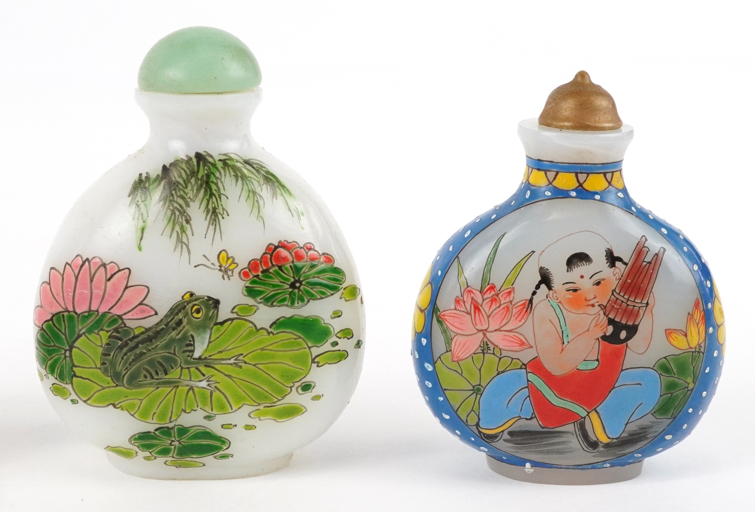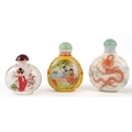 Five Chinese glass snuff bottles and stoppers, each with hand painted decoration including dragons and figures, the largest 8cm high.