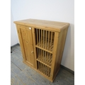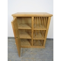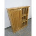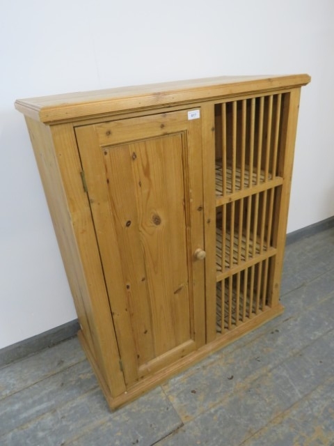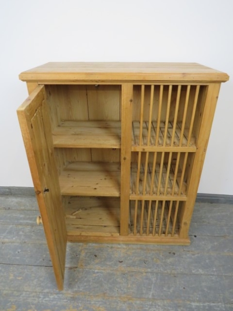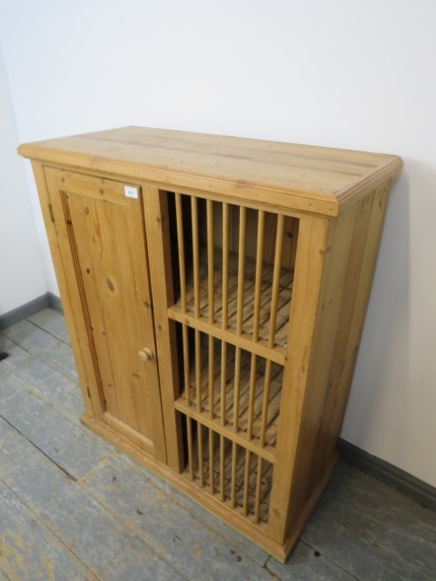 A waxed pine kitchen cupboard with single cupboard door flanked by a plate rack, on a block base. 102 x 87 x 42cms (approx).
