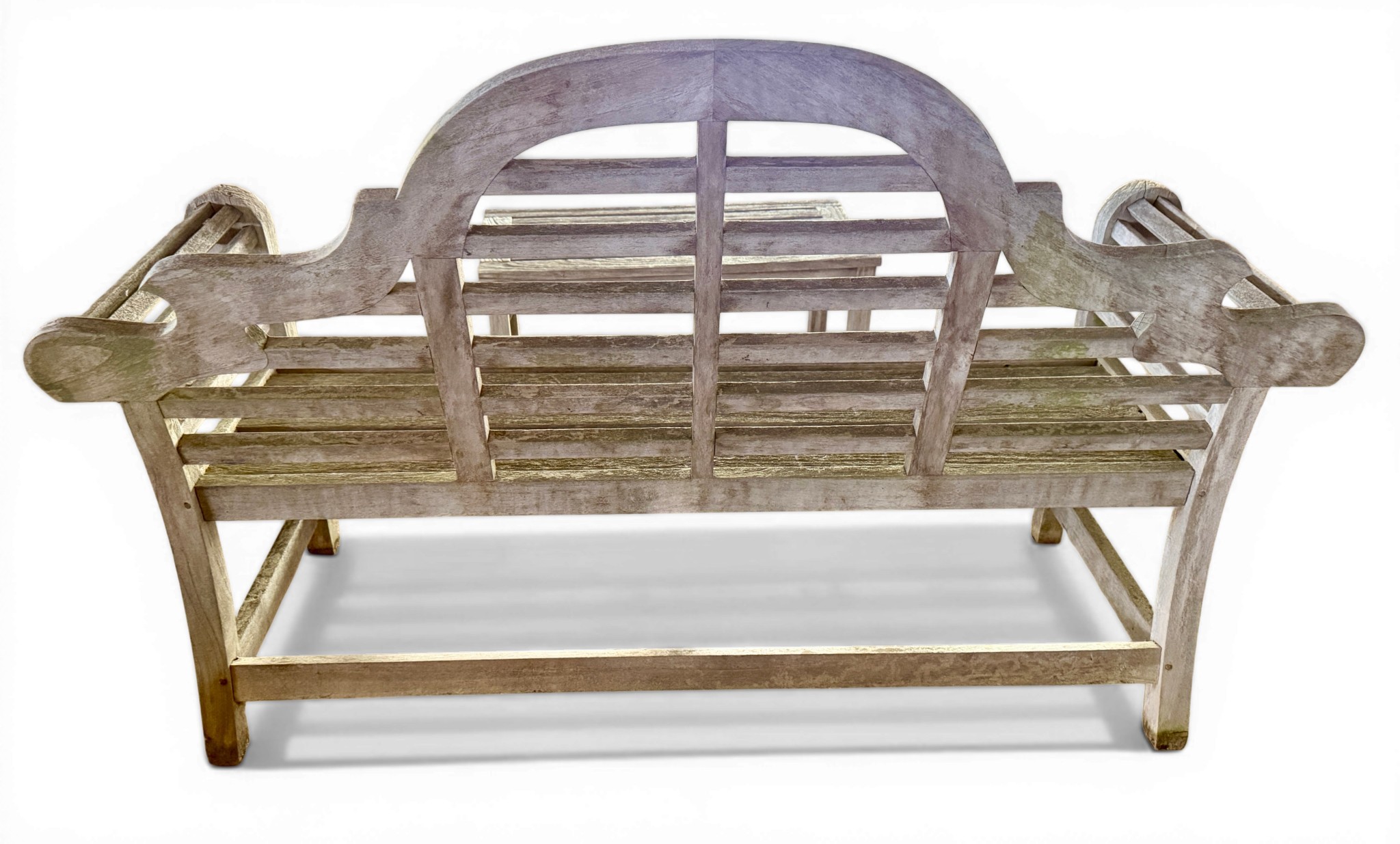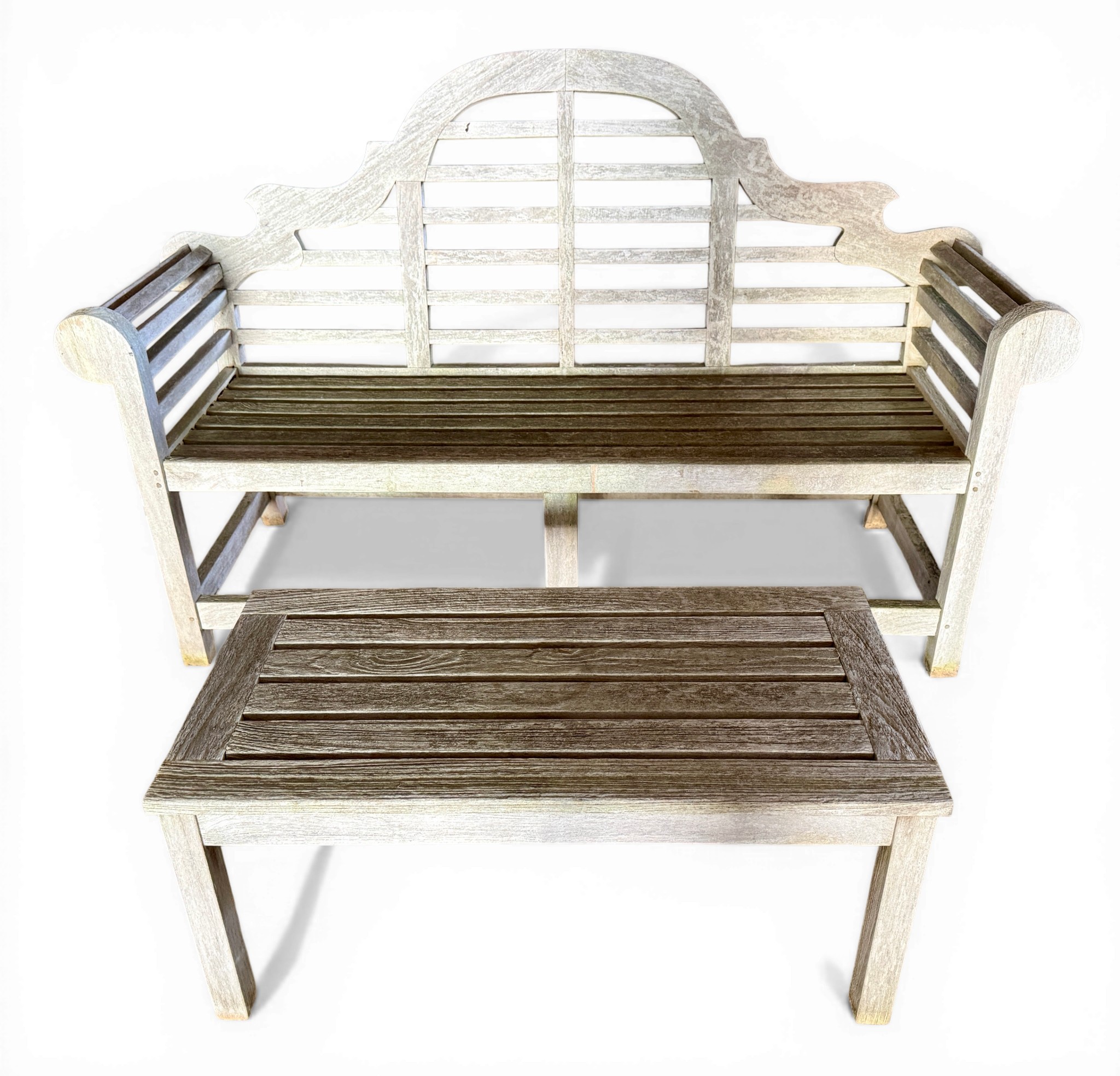 A Lutyens style teak garden bench and table. Bench 165cm w x 57cm d x 103cm h to back. Table 91cm x 45cm x 40cm h.