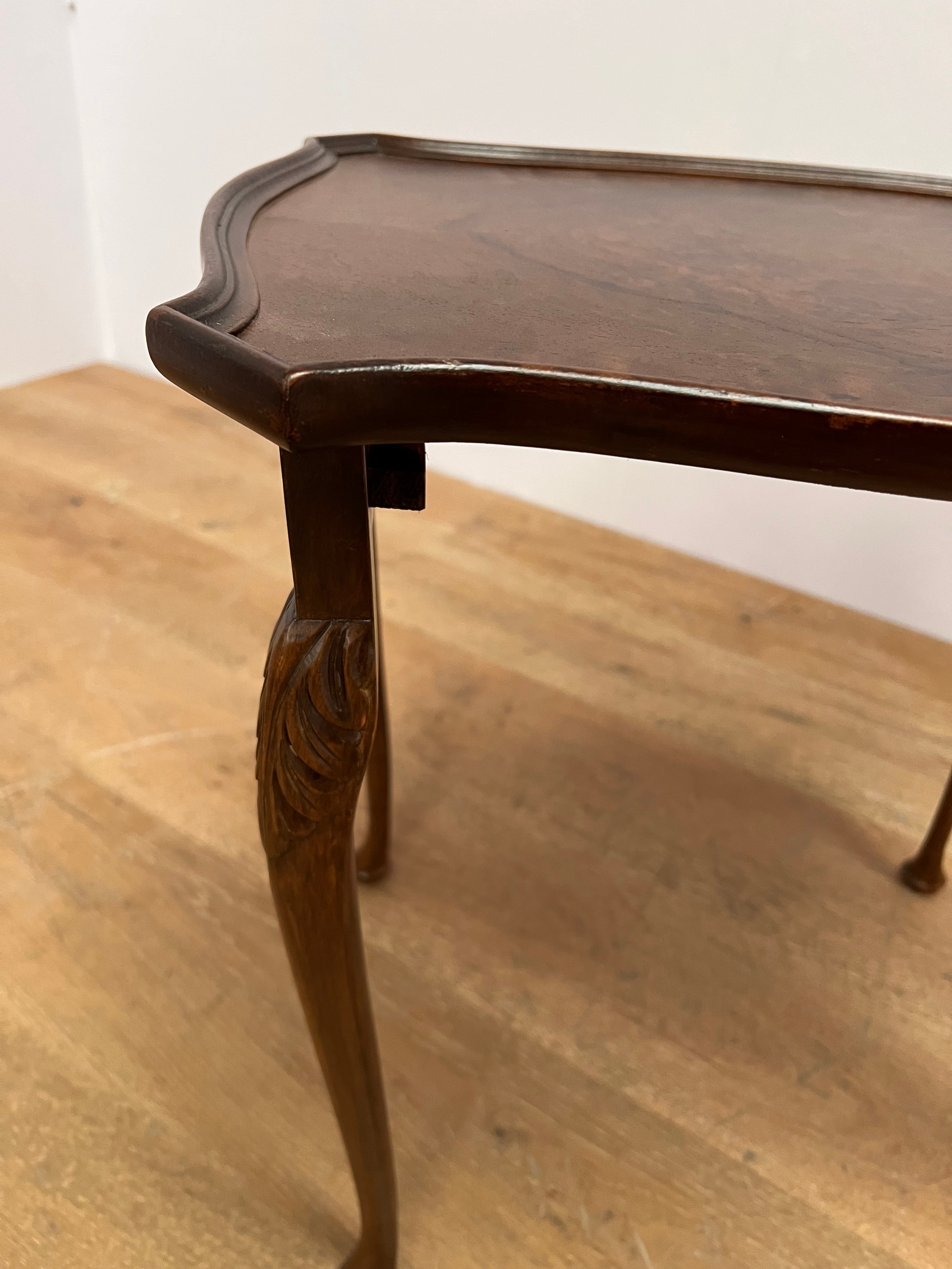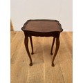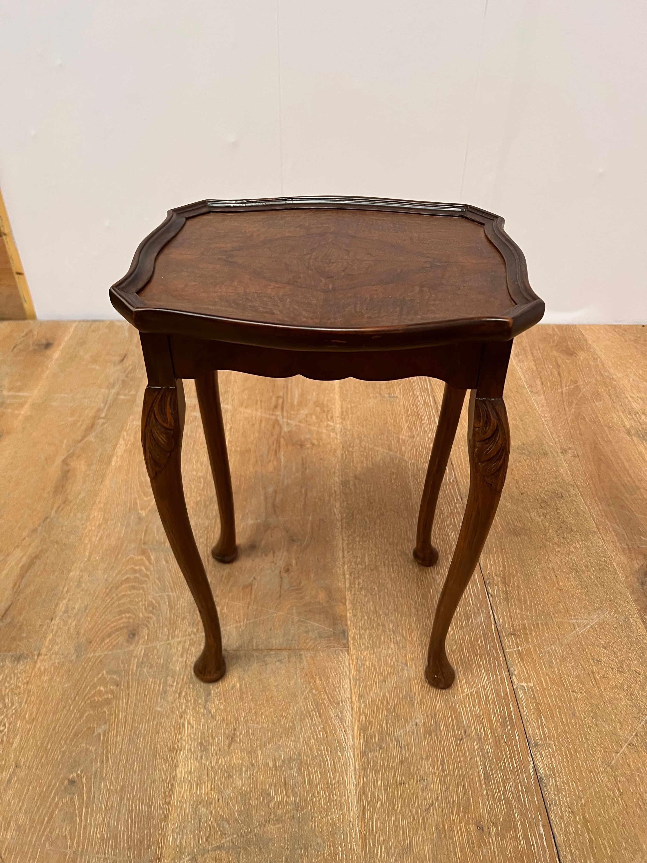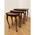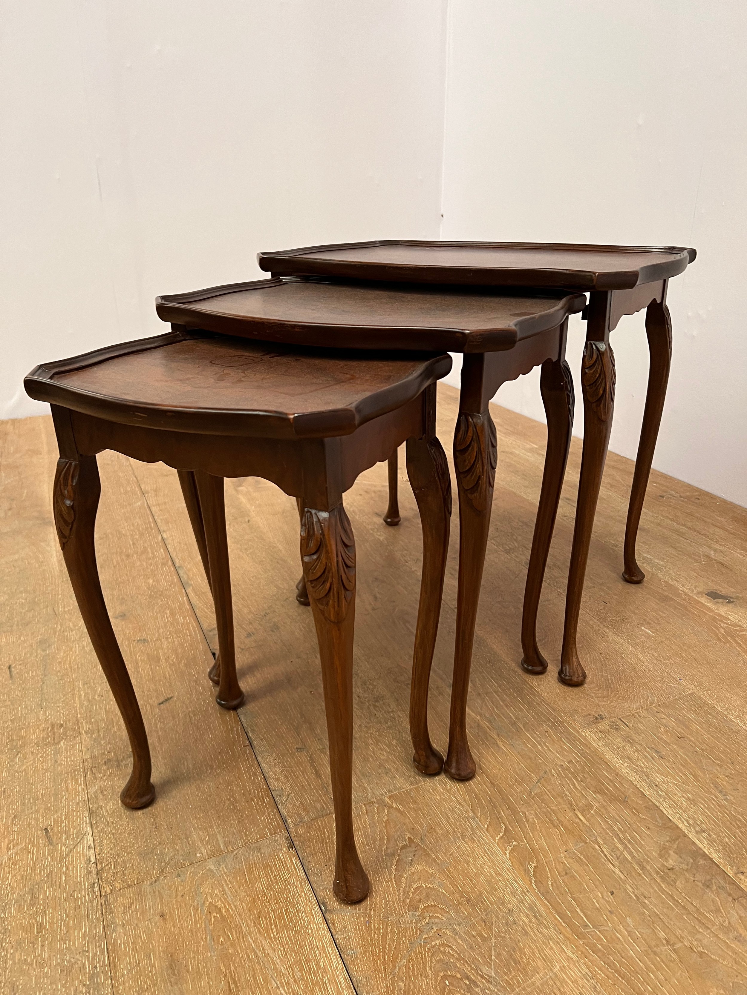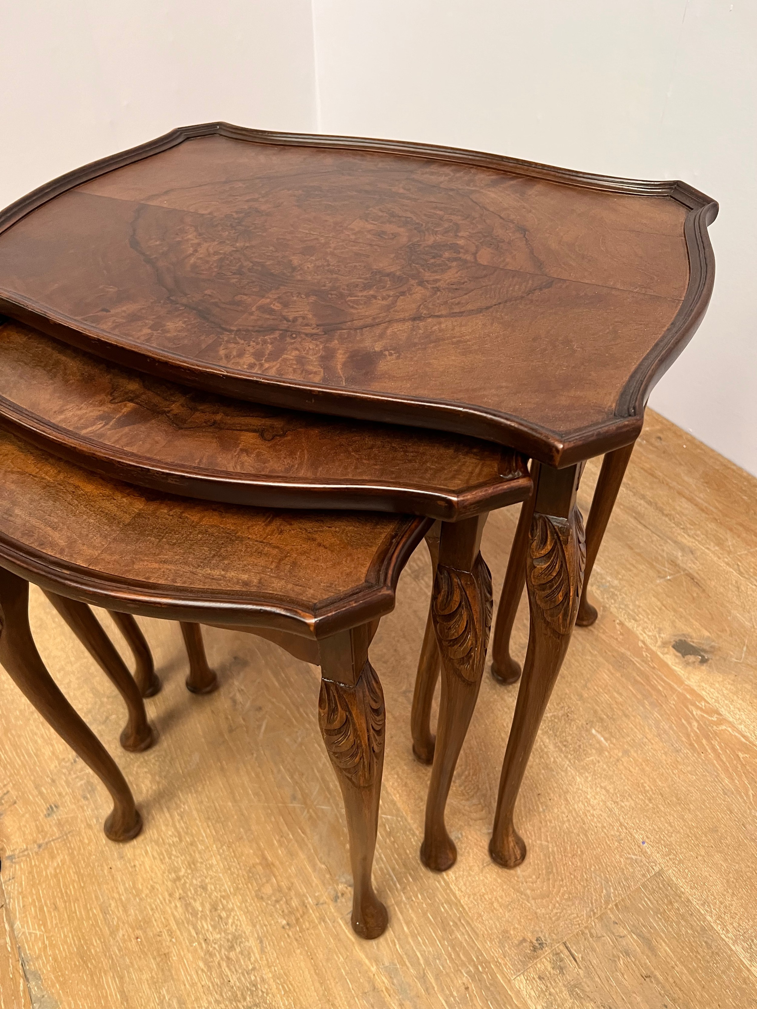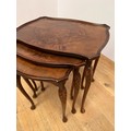 Nest of three burr walnut tables with pie crust edge raised on Queen Ann legs {H 54cm x W 57cm x D 40cm }. - NOT AVAILABLE TO VIEW IN PERSON