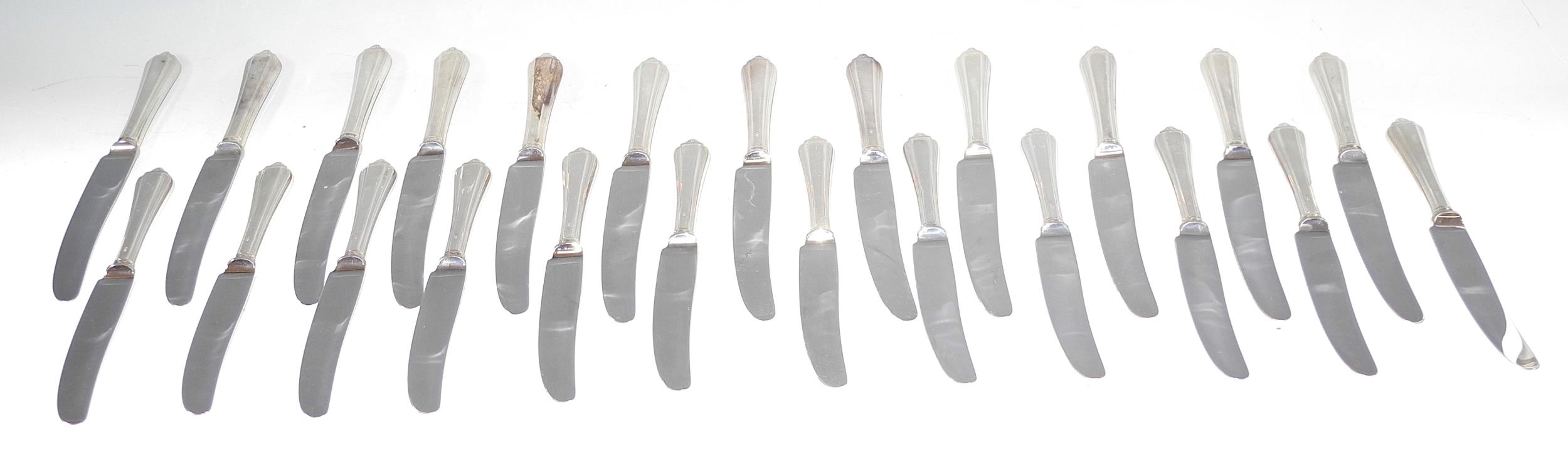 A set of twelve Belmont pattern dinner knives, silver hafts, Sheffield 1973; a set of twelve dessert knives