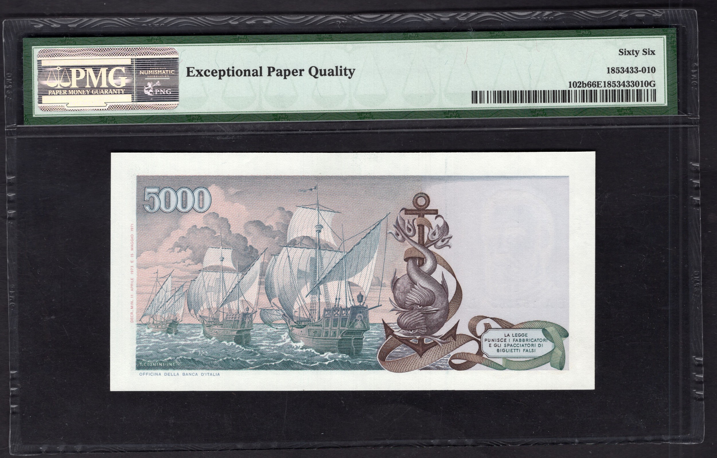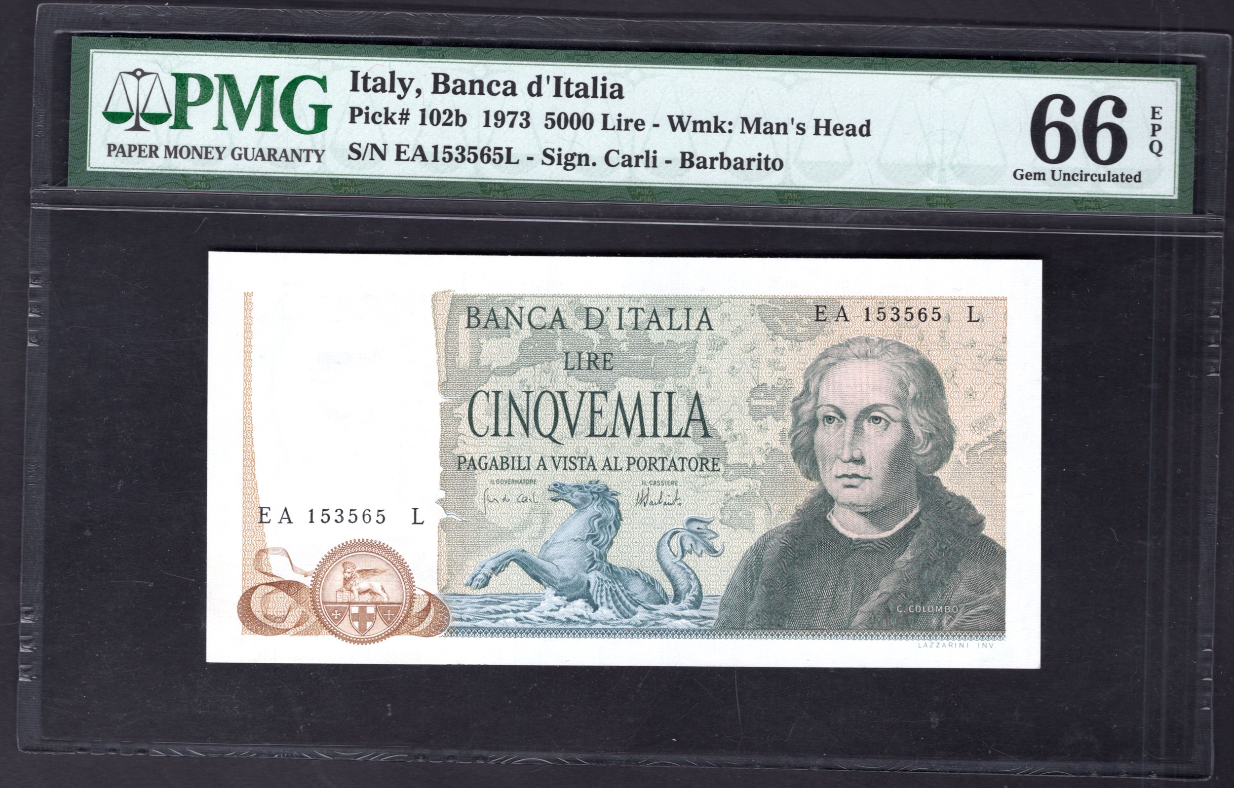 Italy, Banca d'Italia, 5000 lire, (1973), #EA 153565 L (Pick 102b), PMG 66 Gem Uncirculated EPQ.