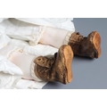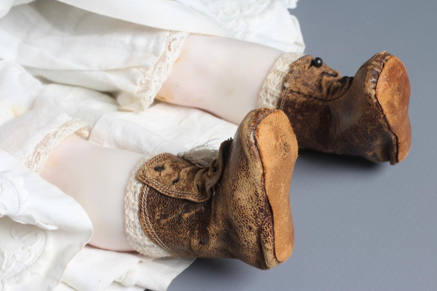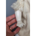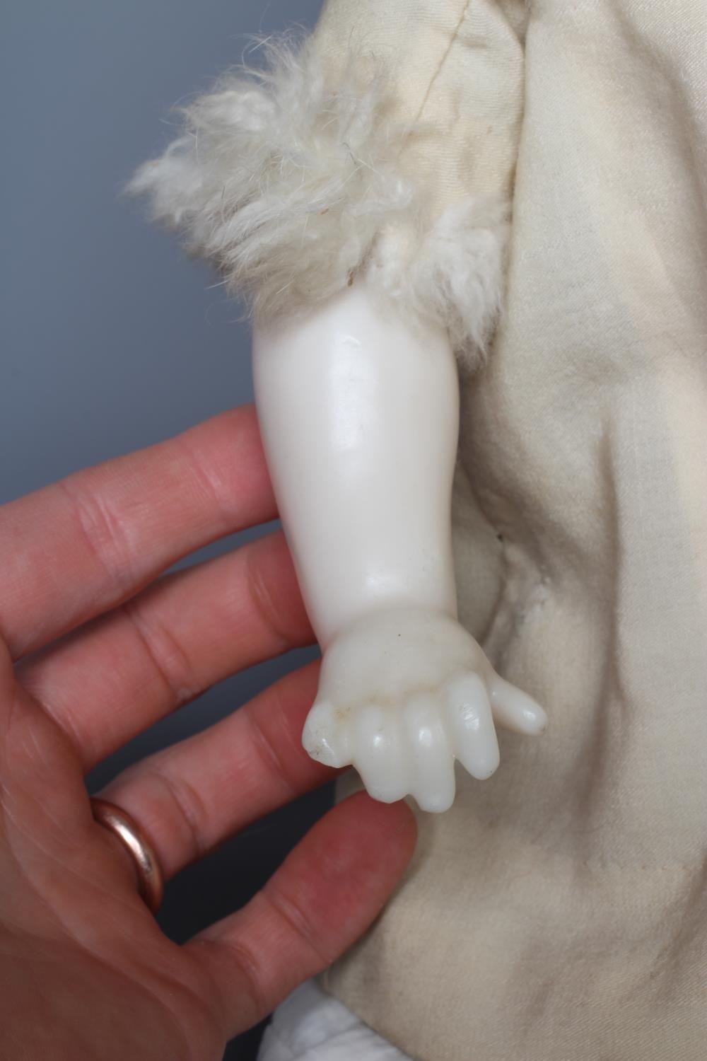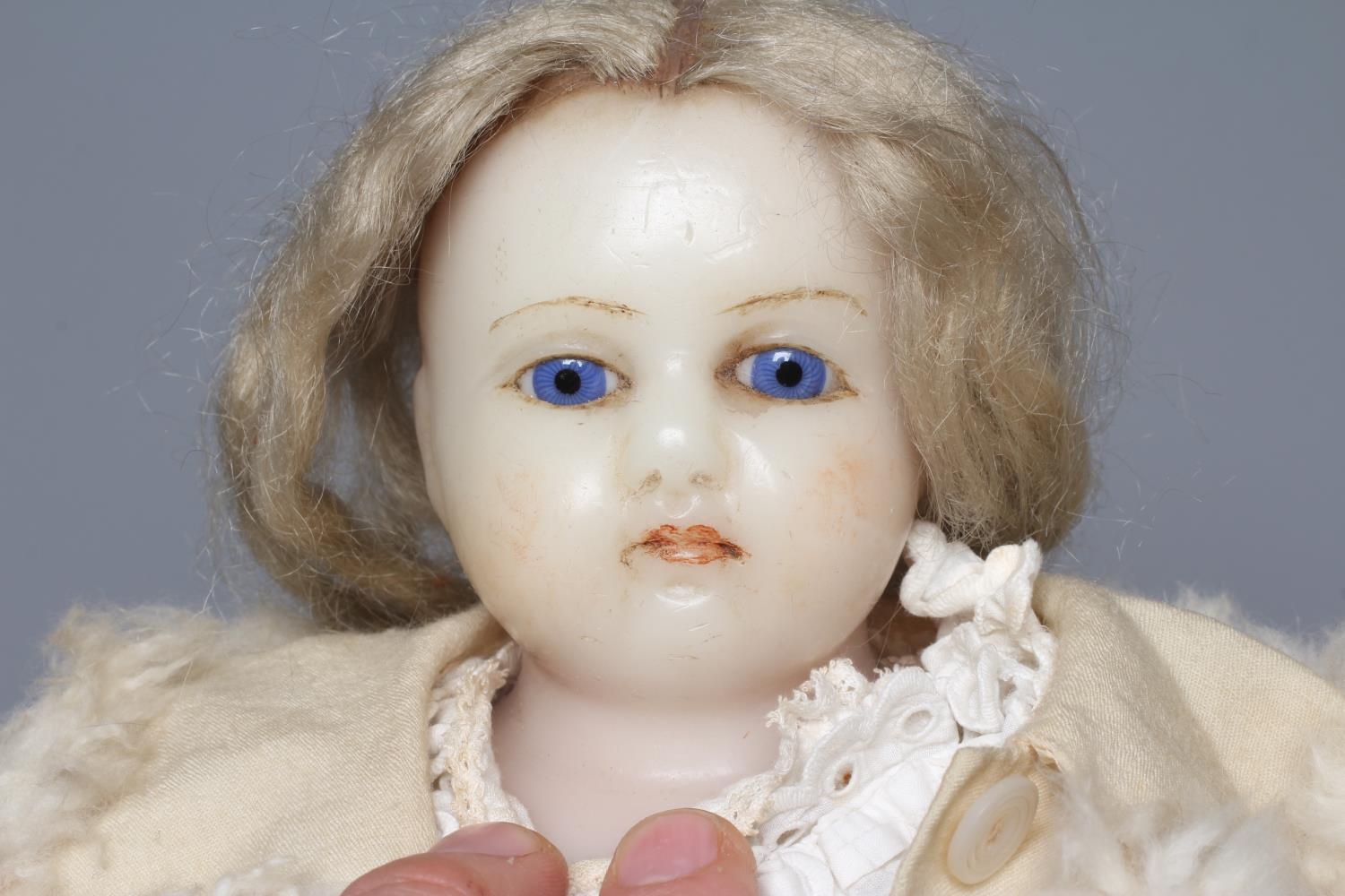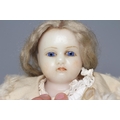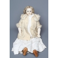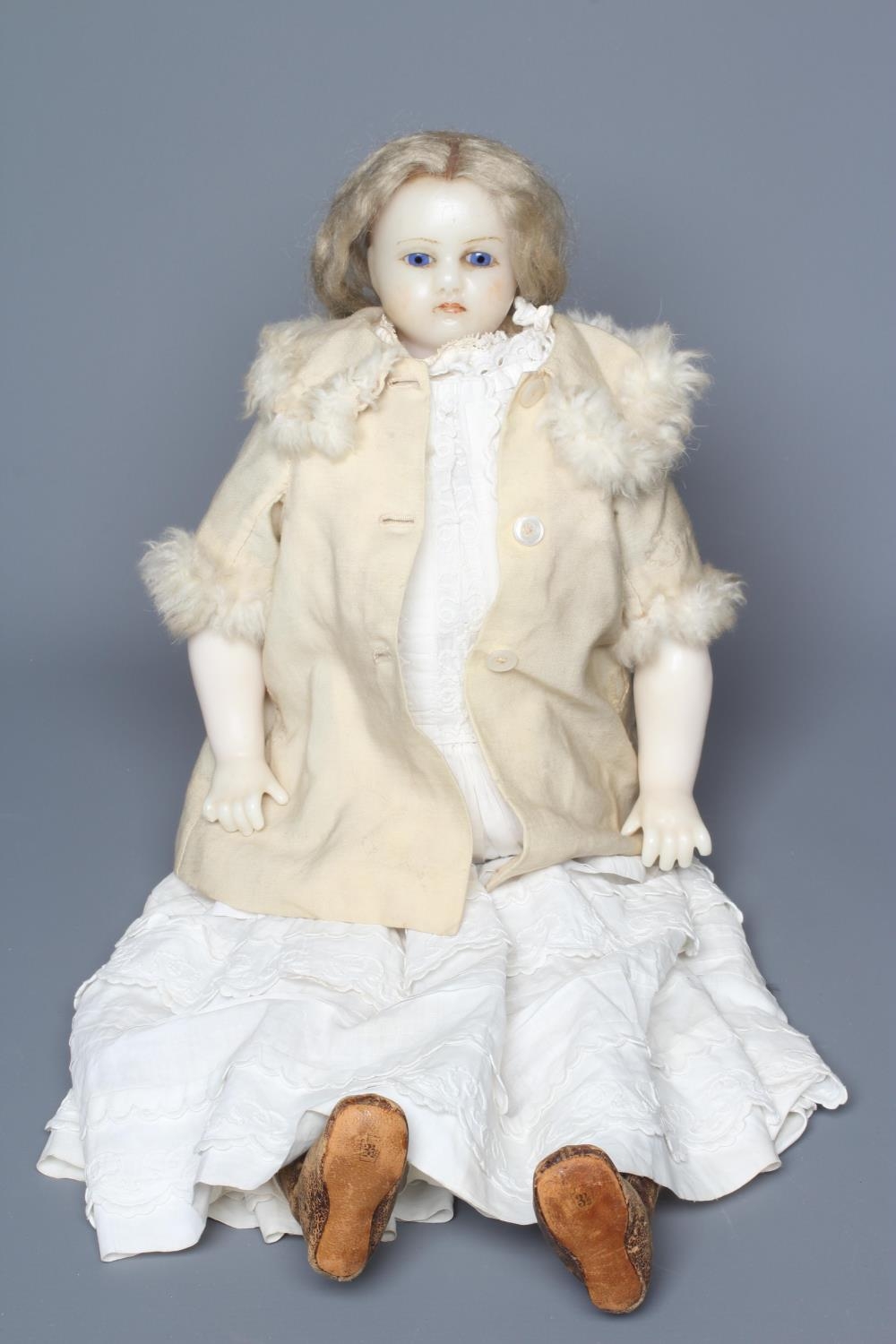 A Victorian poured wax shoulder head doll, with blue glass fixed eyes, closed mouth, blond wig, fabric body and wax lower limbs, white dress, cream fur trim coat and leather shoes, 21 1/2" long