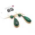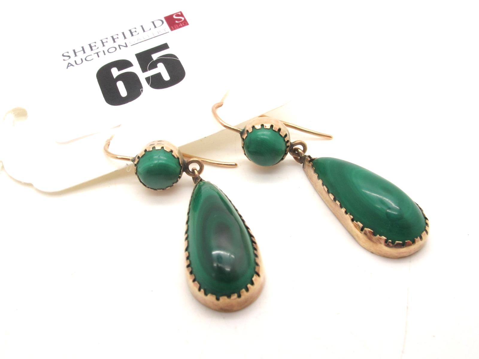 A Pair of Vintage Malachite Drop Earrings, collet set on hook fittings.