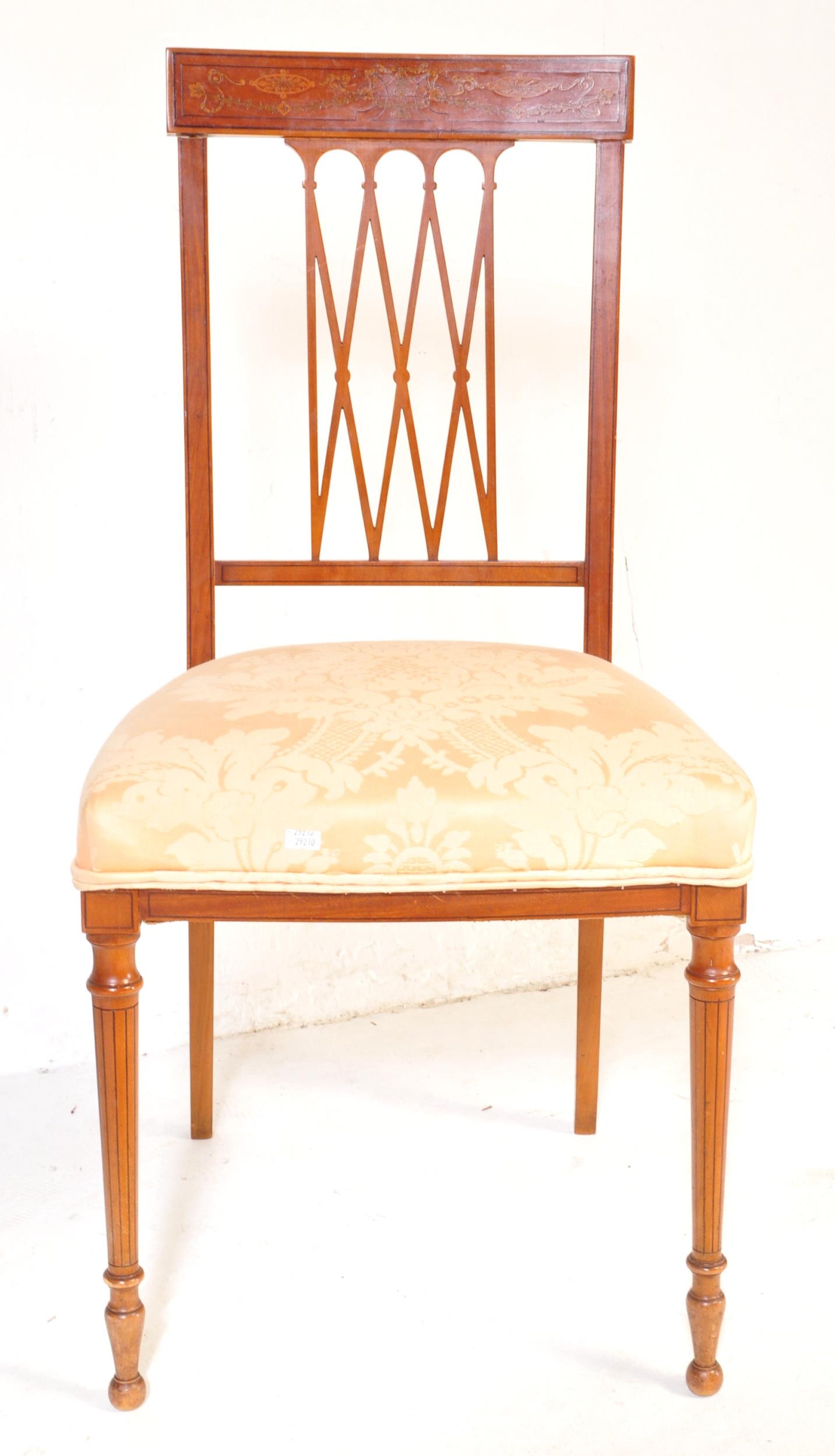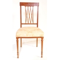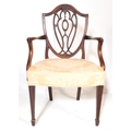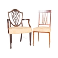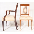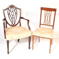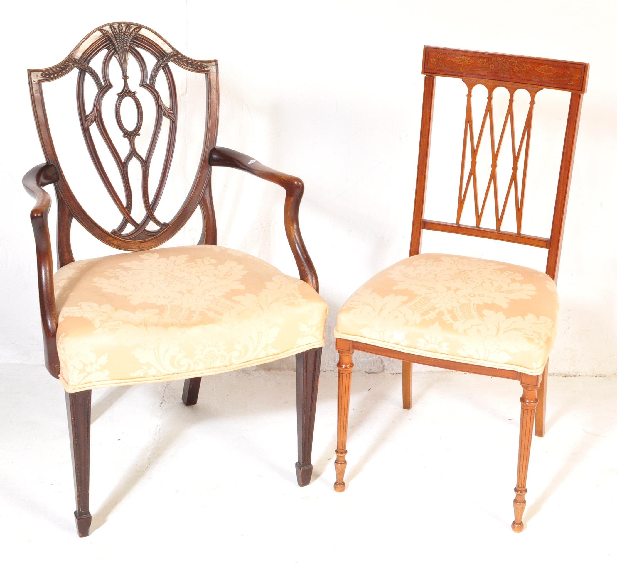 An early 20th Century Edwardian satin wood marquetry inlaid dining hall chair. Having a harebell swag to back with cross banding on a Hepplewhite fabric upholstered cushioned seat support on reeded legs. Together with a 19th Century mahogany shield back carver armchair with Hepplewhite fabric with chamfered legs. Measures approx.