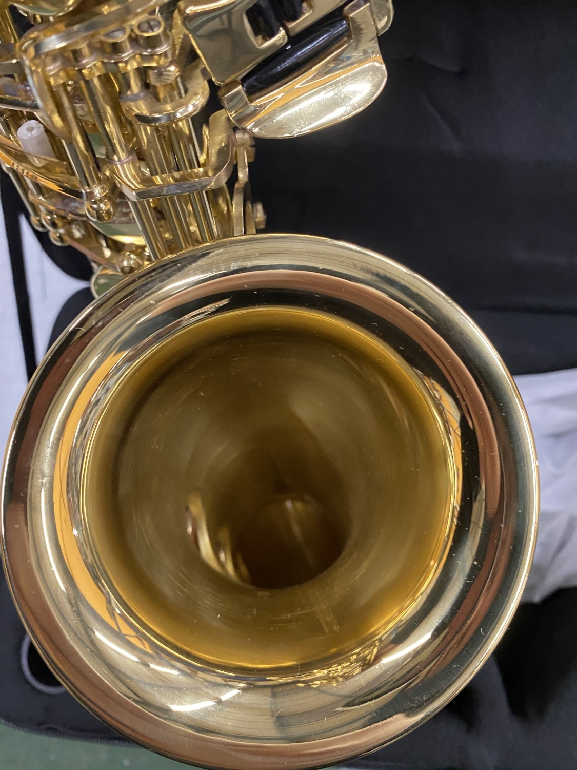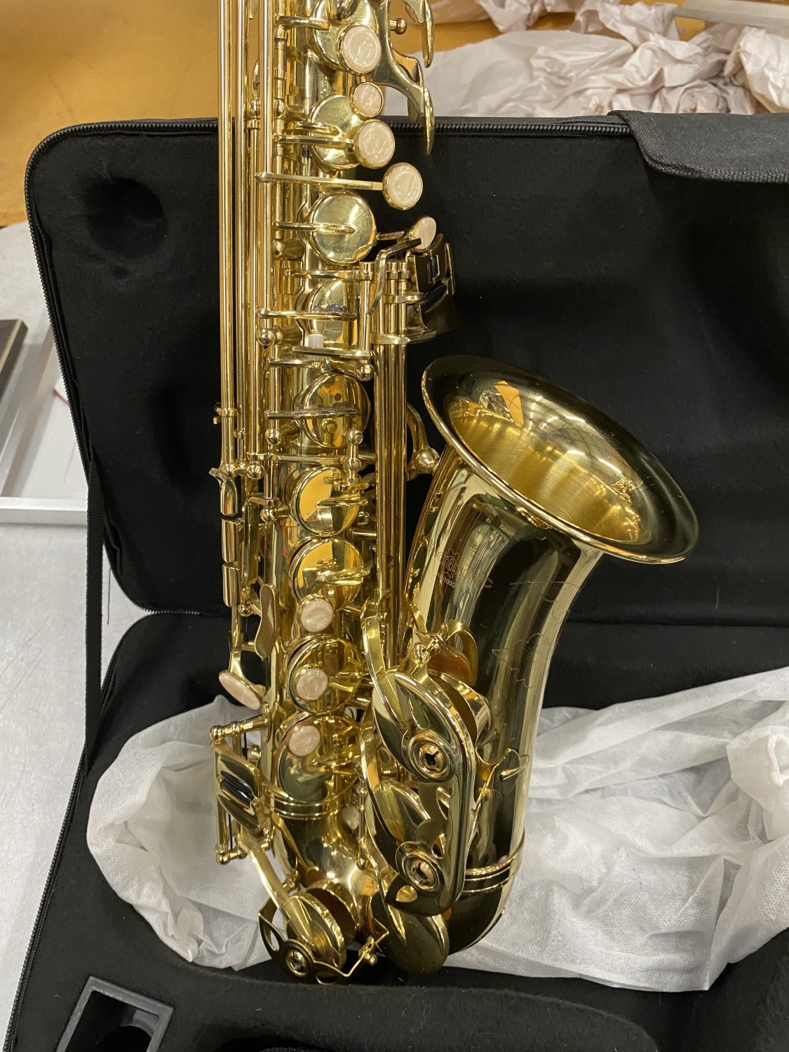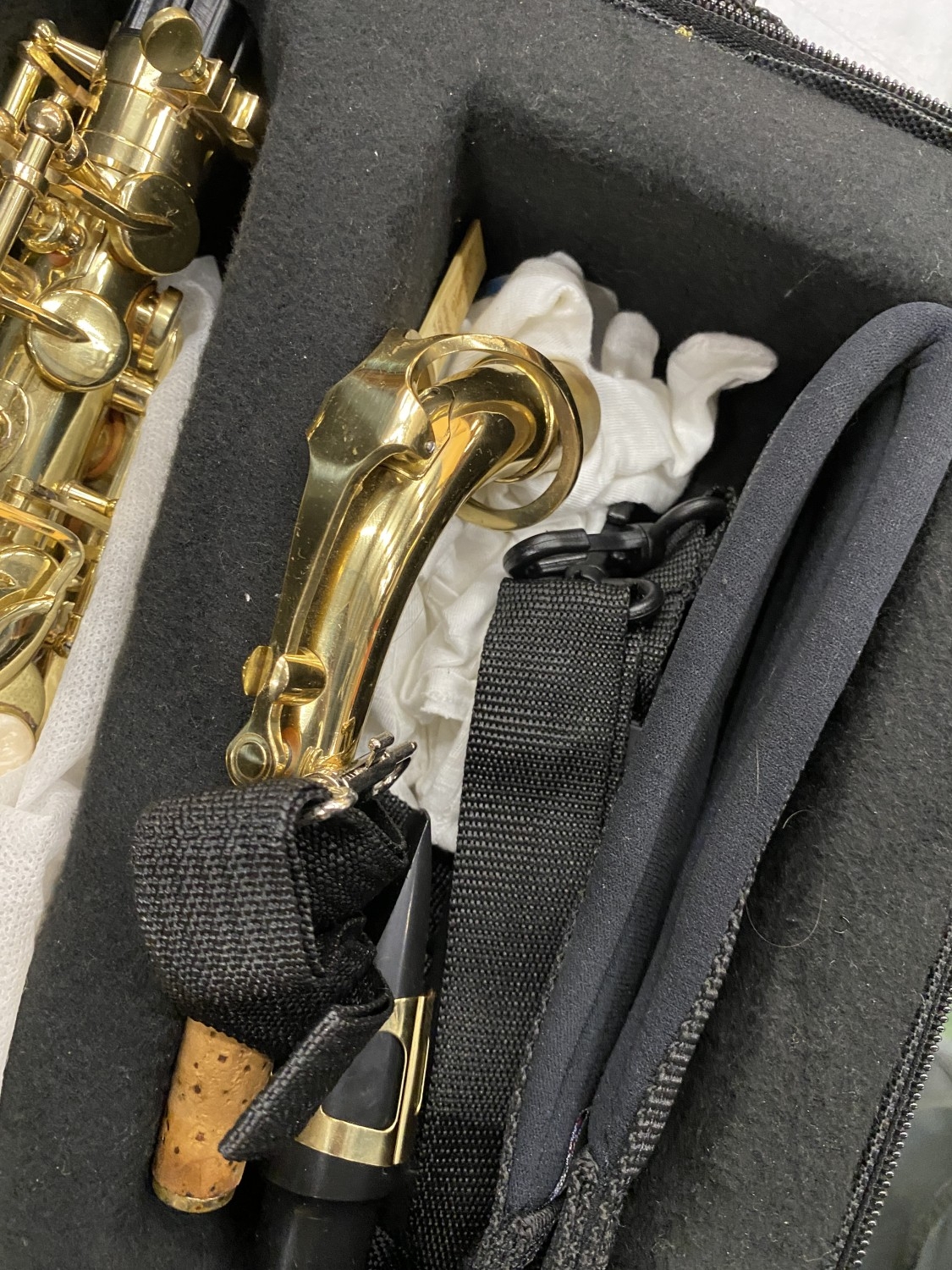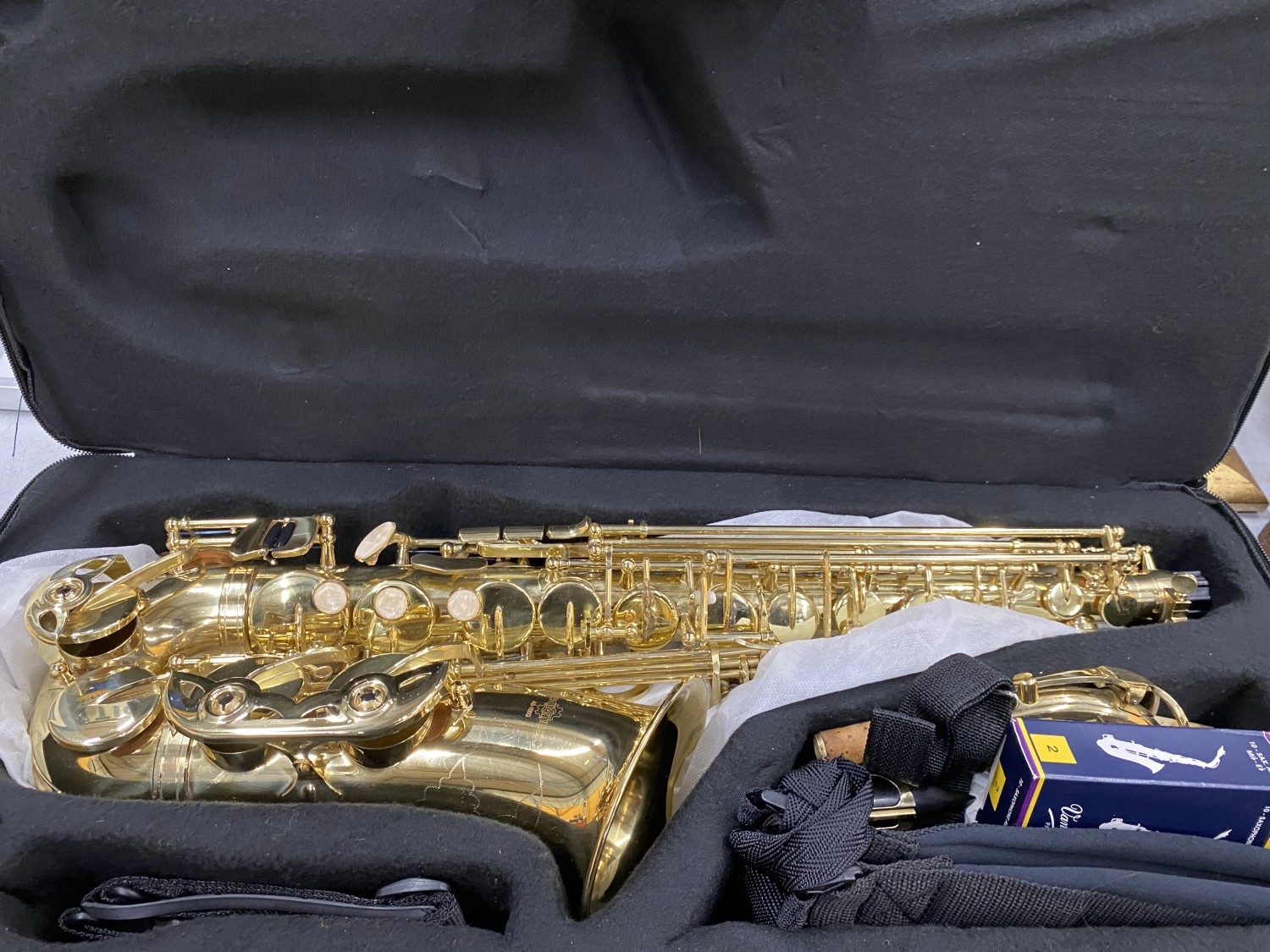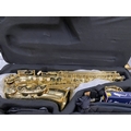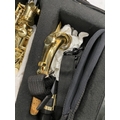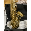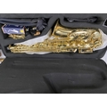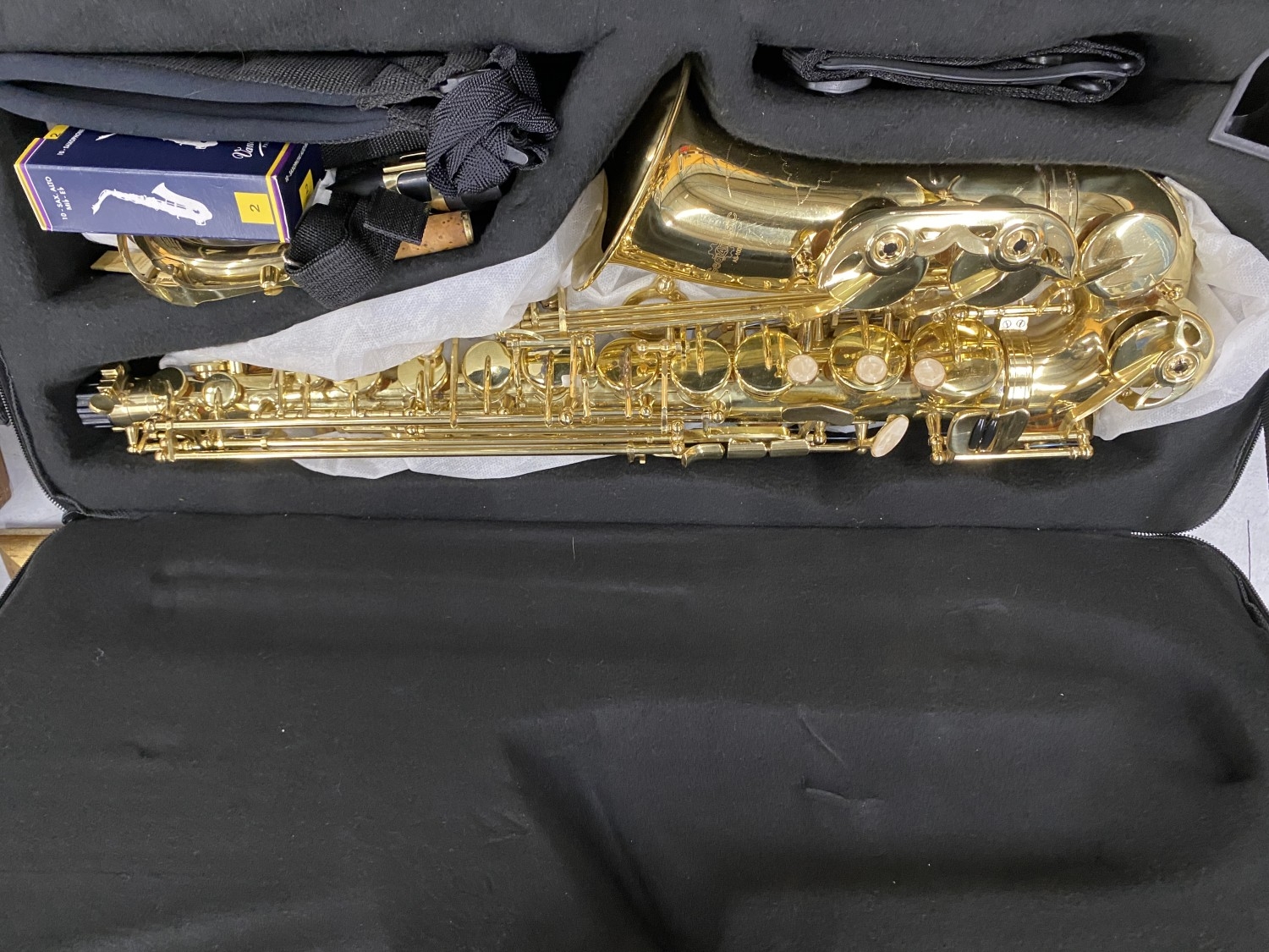 A GEAR 4 MUSIC SAXOPHONE WITH MOUTH PIECE, REEDS, CARRY STRAP AND FITTED CASE