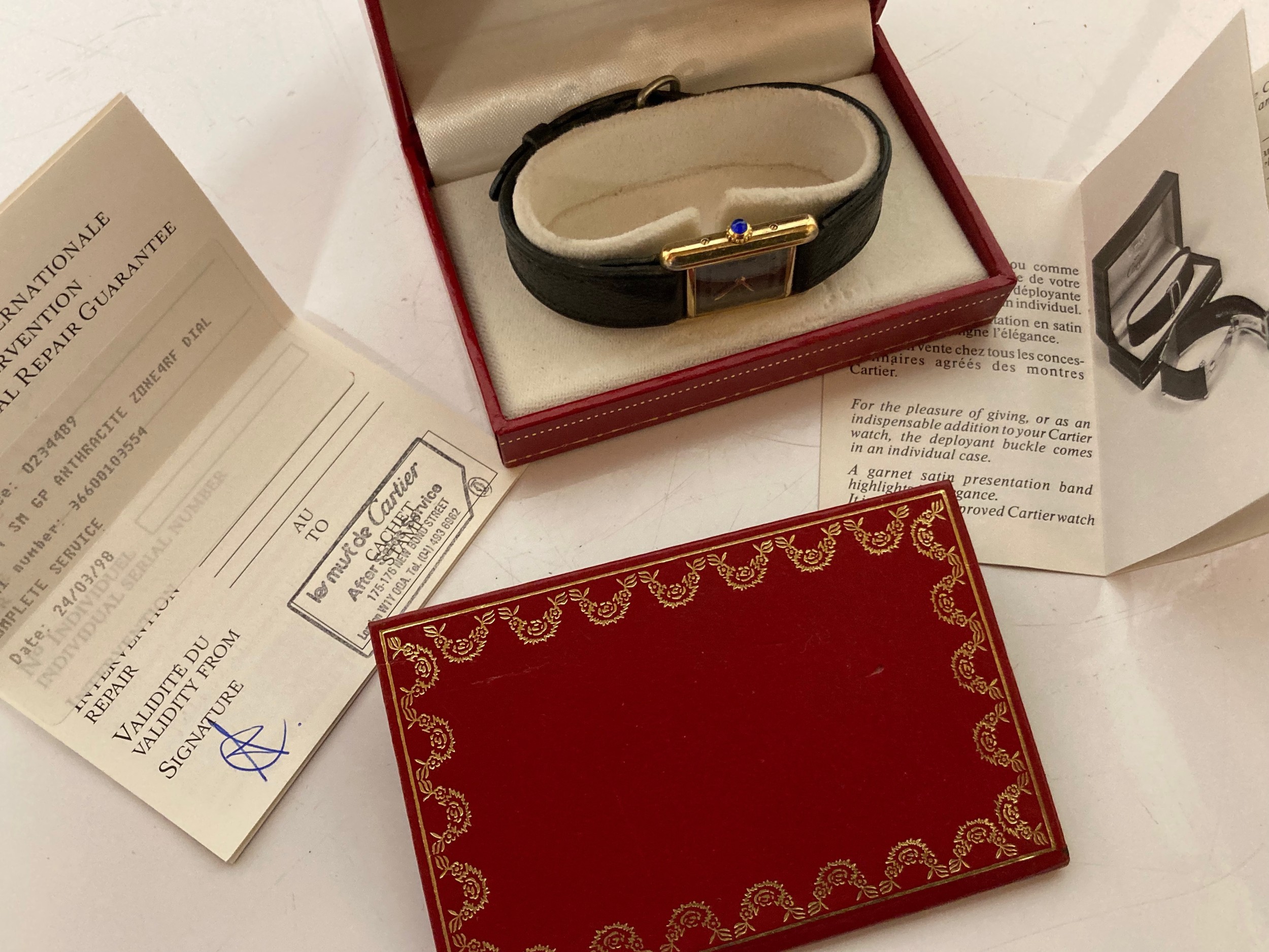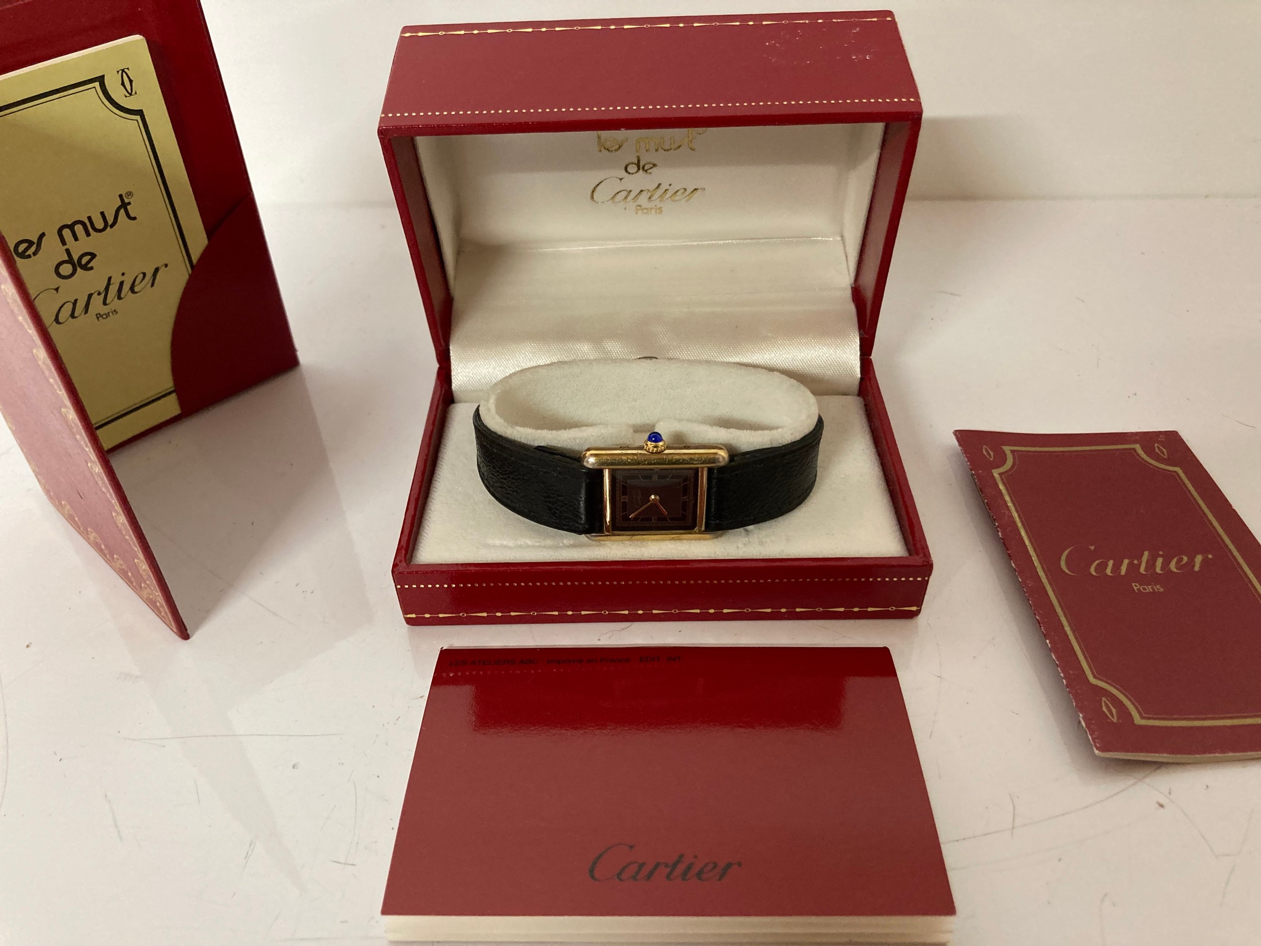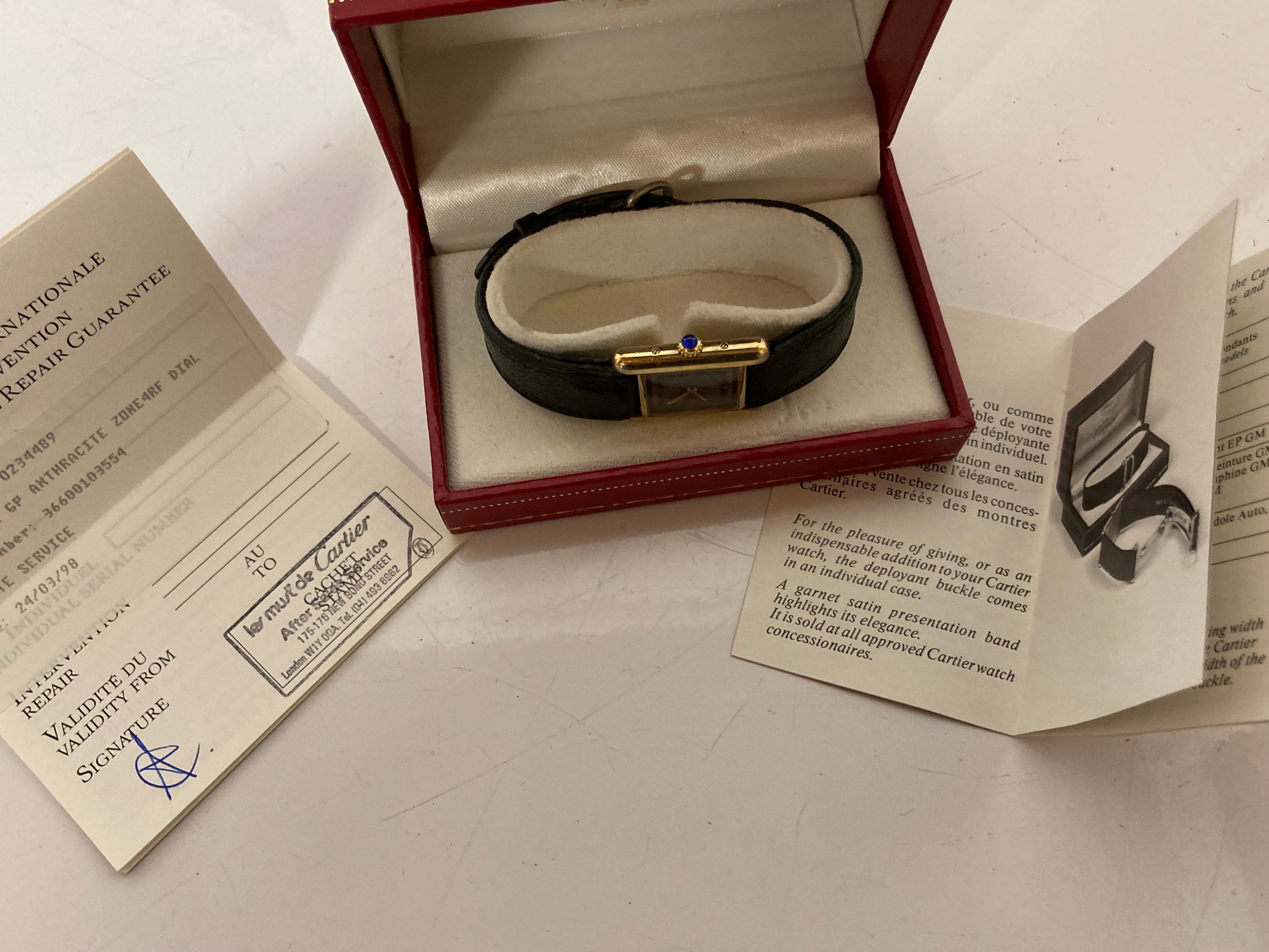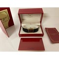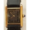 Ladies Wristwatch, an electroplated Cartier movement on a leather strap, boxed with accompanying documentation