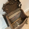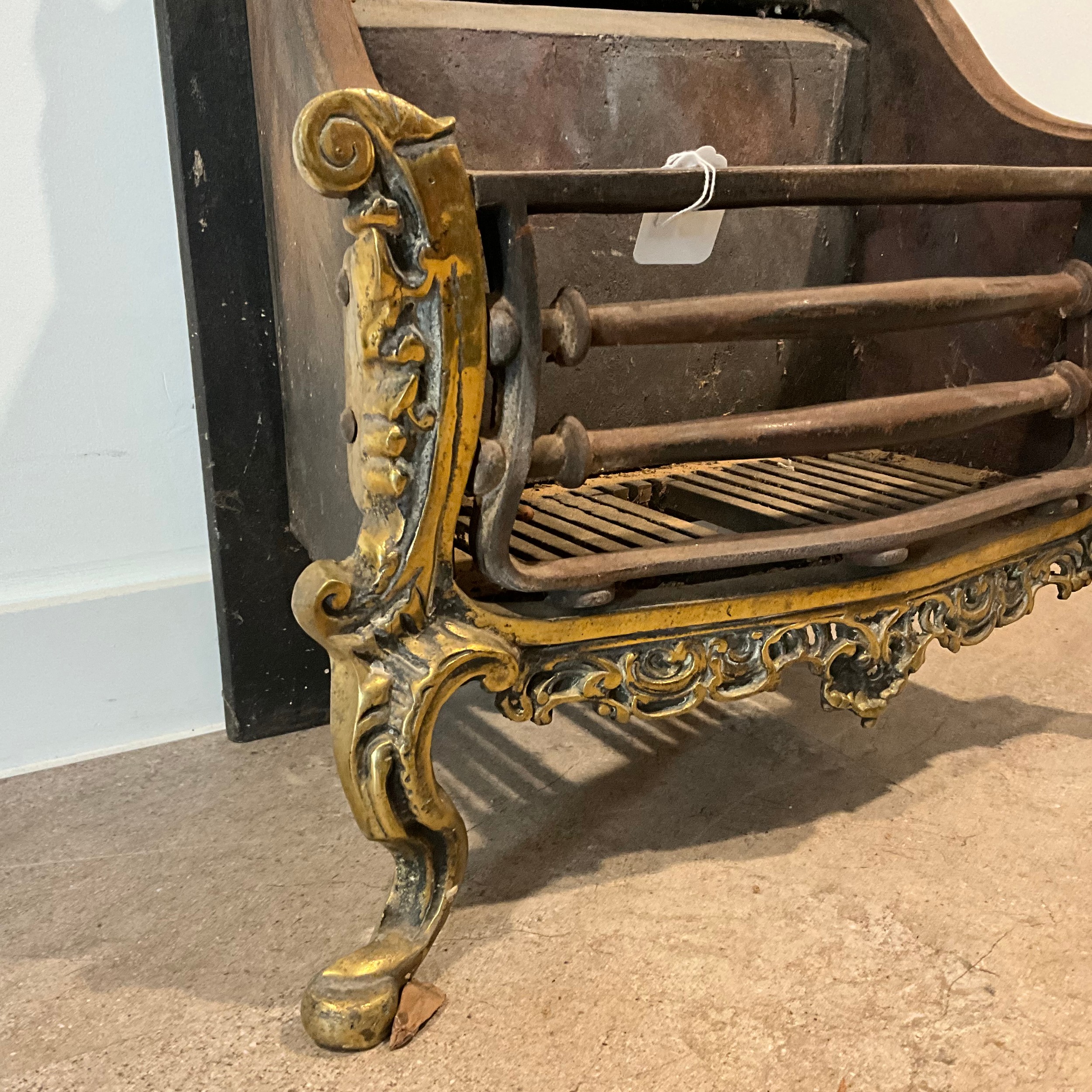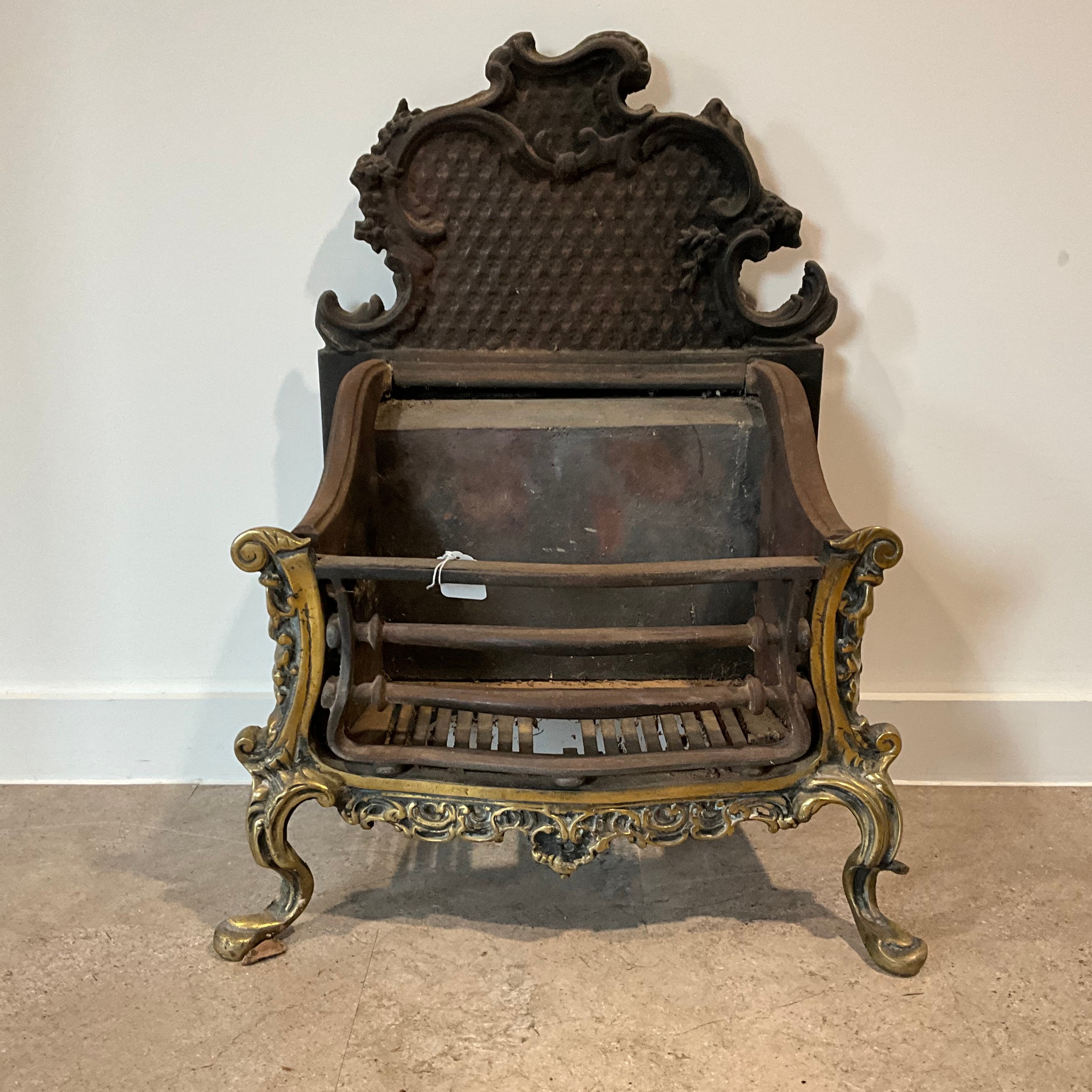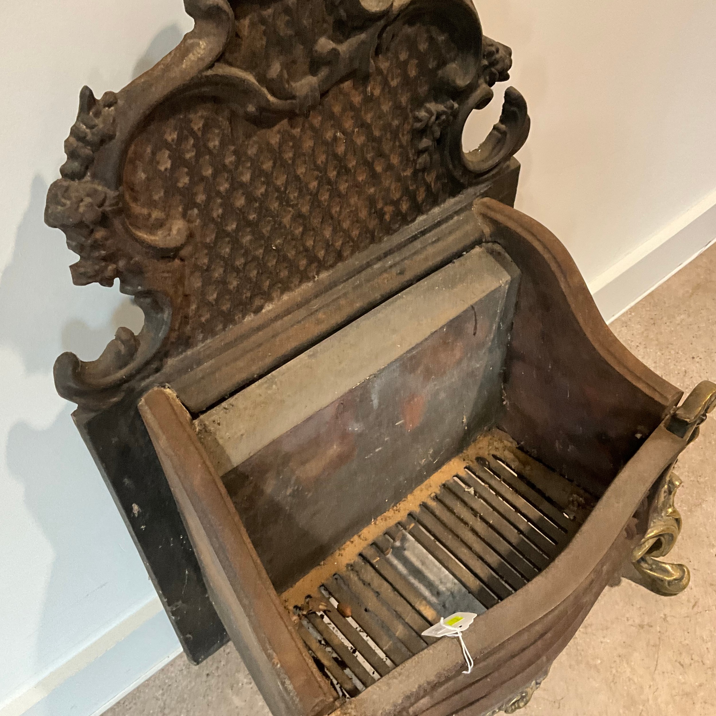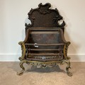 A cast-iron Regency-style fireplace, standing on four brass splayed legs, 74cm high, 49cm long, 32cm deep.