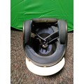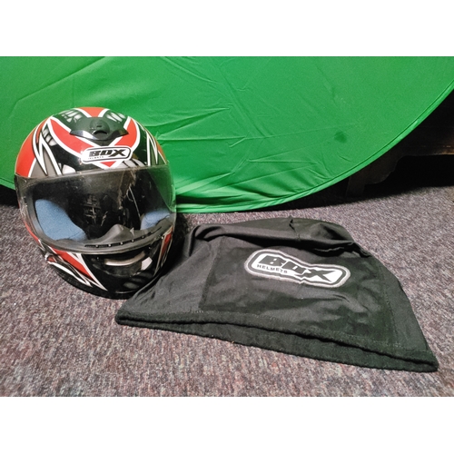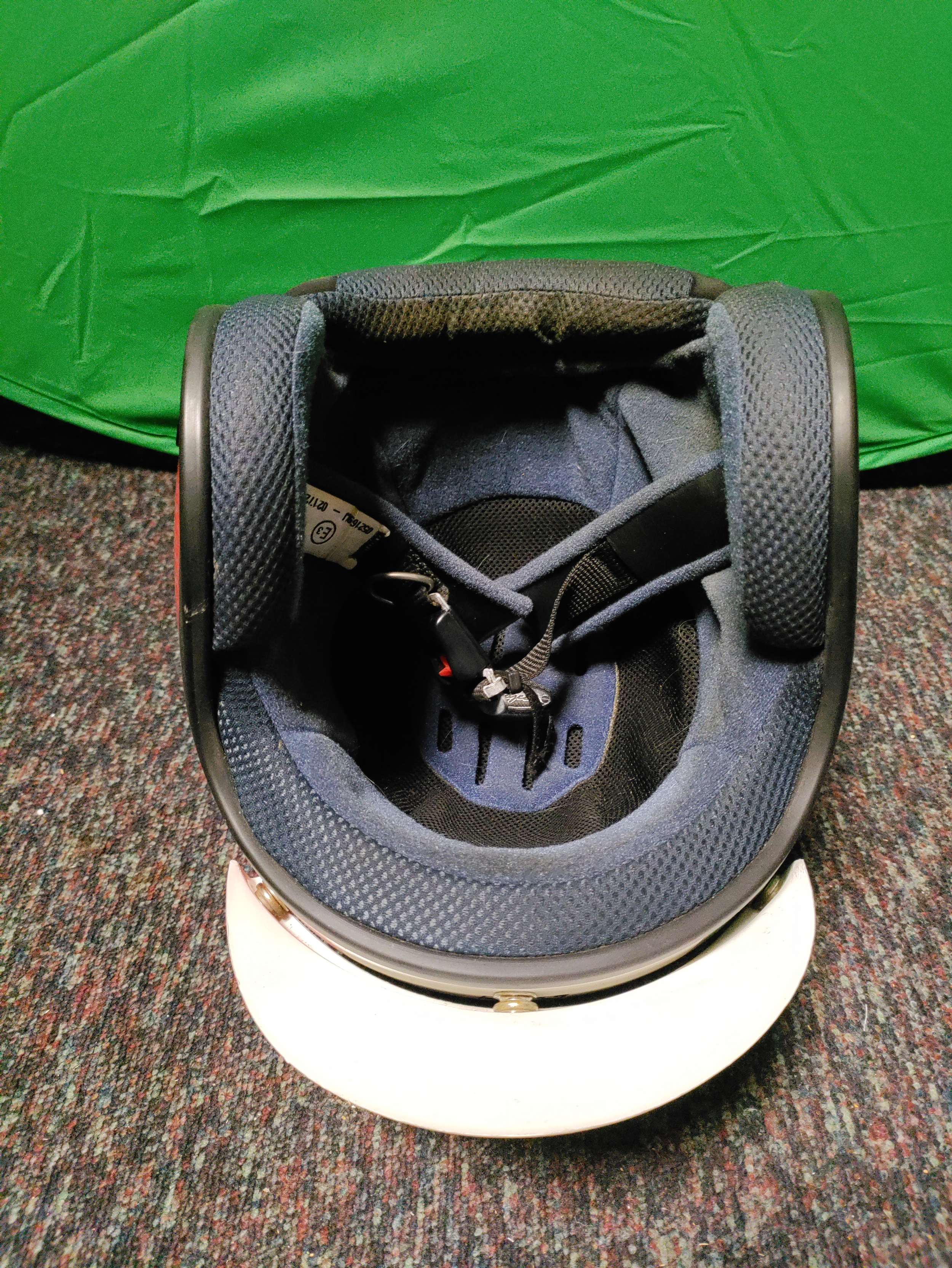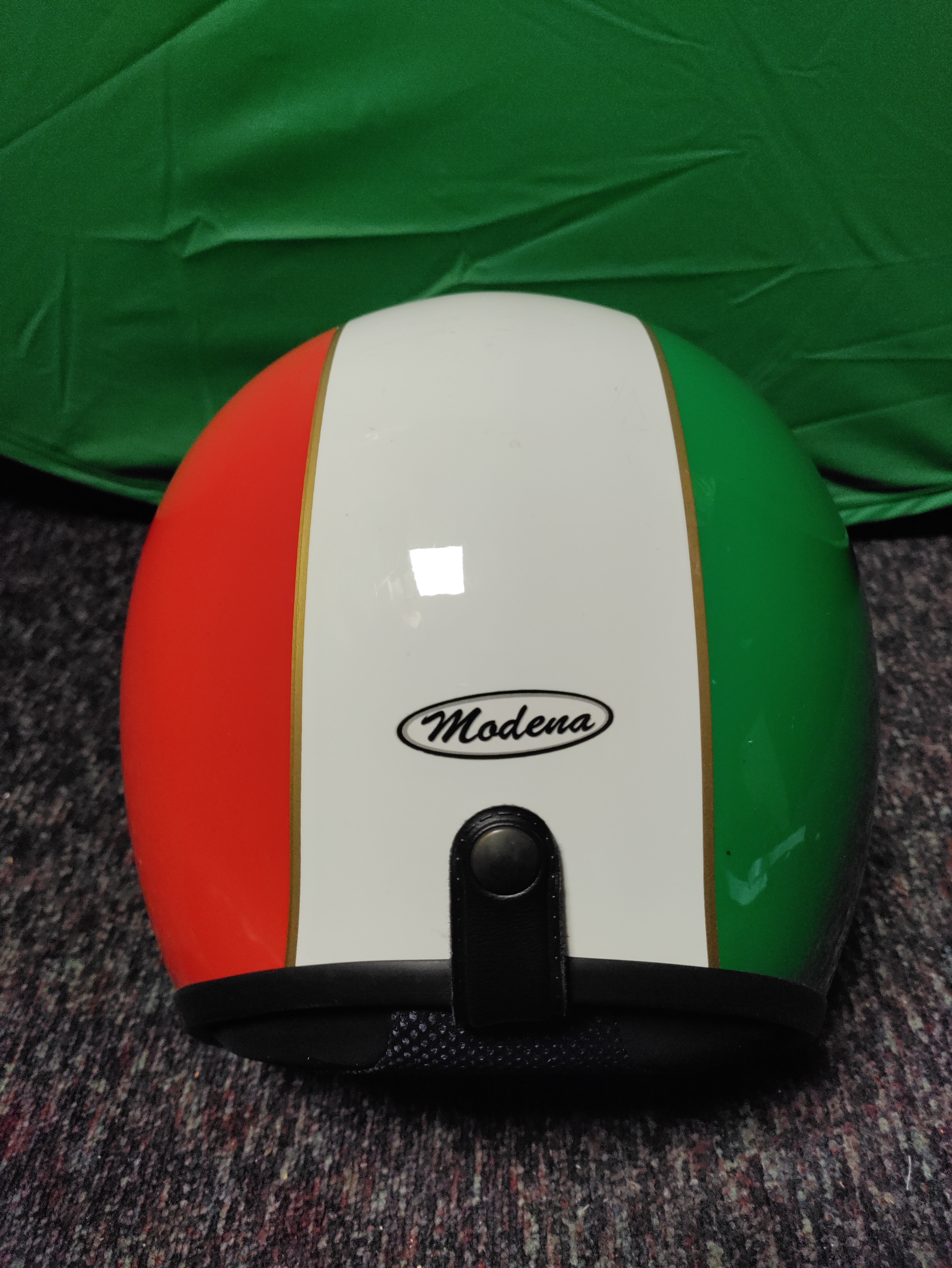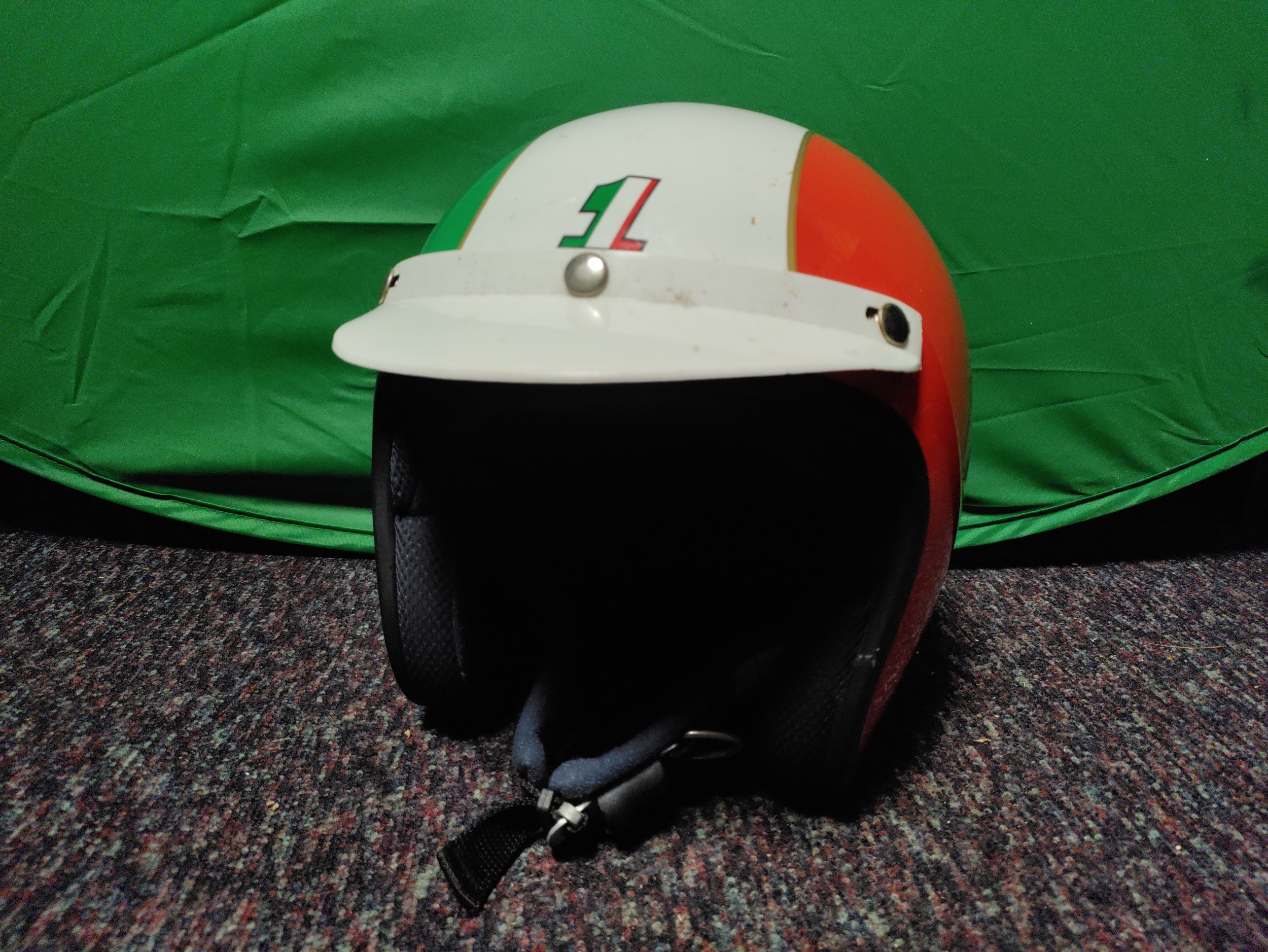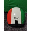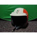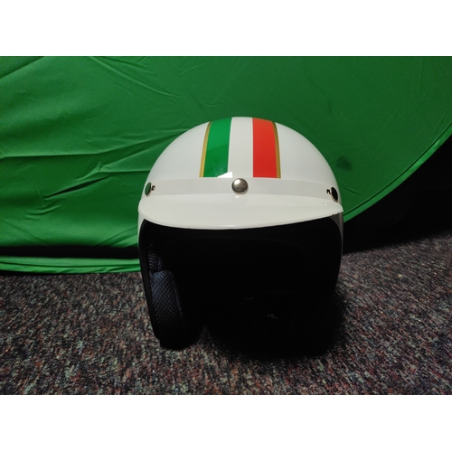 An open-face motorcycle helmet with Italian flag decorations.